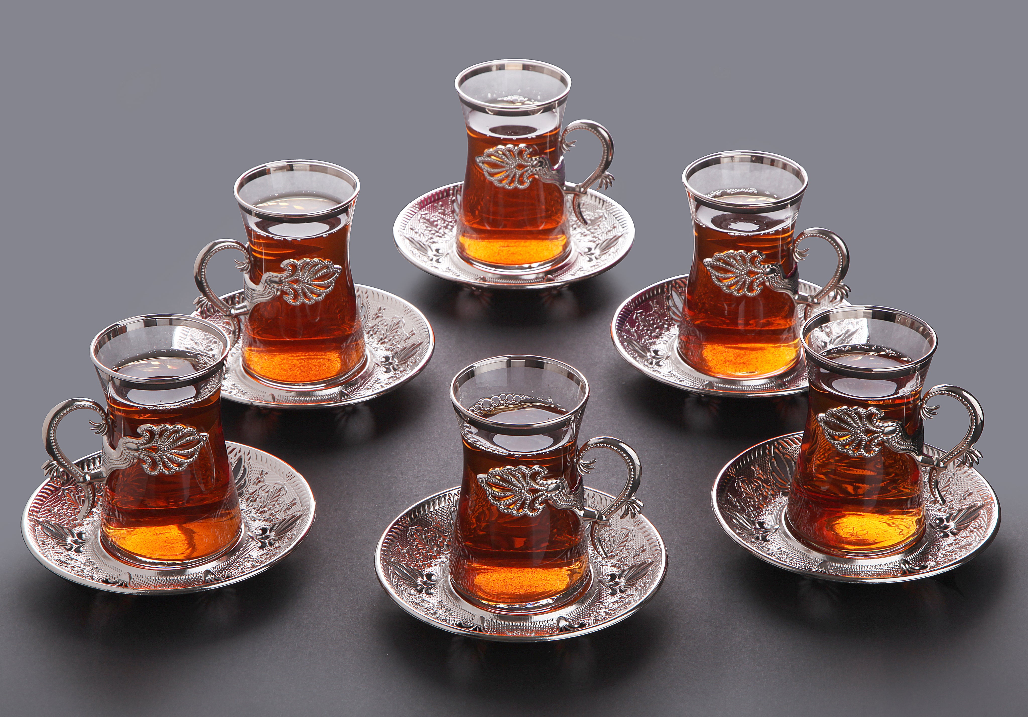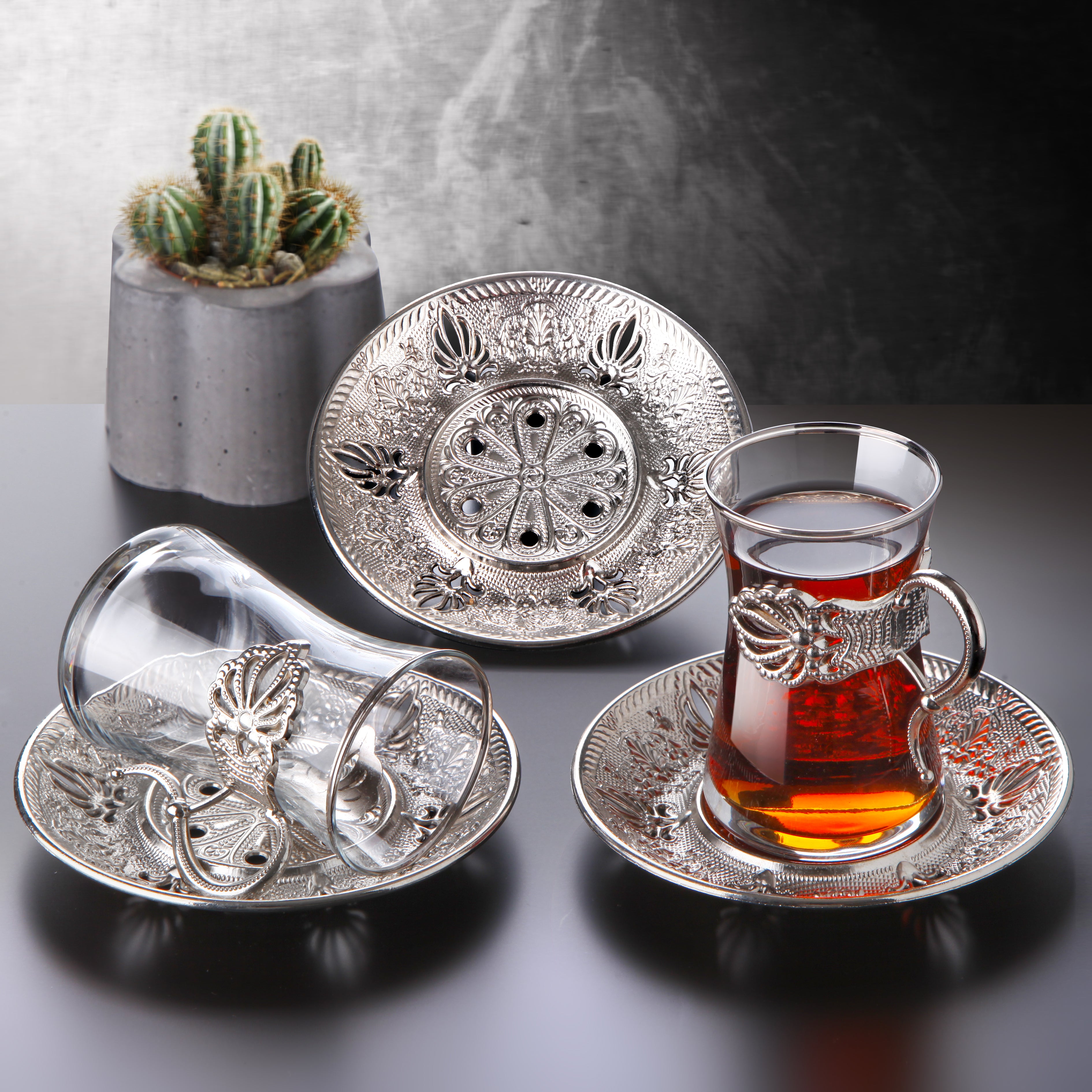 استمتع بالأناقة والجودة مع مجموعة أكواب الشاي باللون الفضي المصممة والمصنوعة في تركيا، تعكس هذه المجموعة براعة الصناعة الراقية والجمال الخالد.