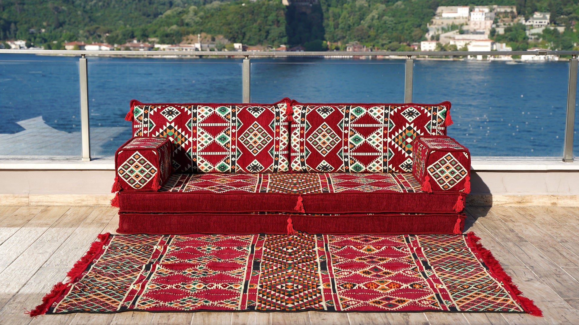 • أريكة جلوس عربية مع أريكة عثمانية وسجادة، أريكة شرقية بتصميم جديد، مجلس عربي، وسائد مقاعد، وسادة أرضية بوهيمية