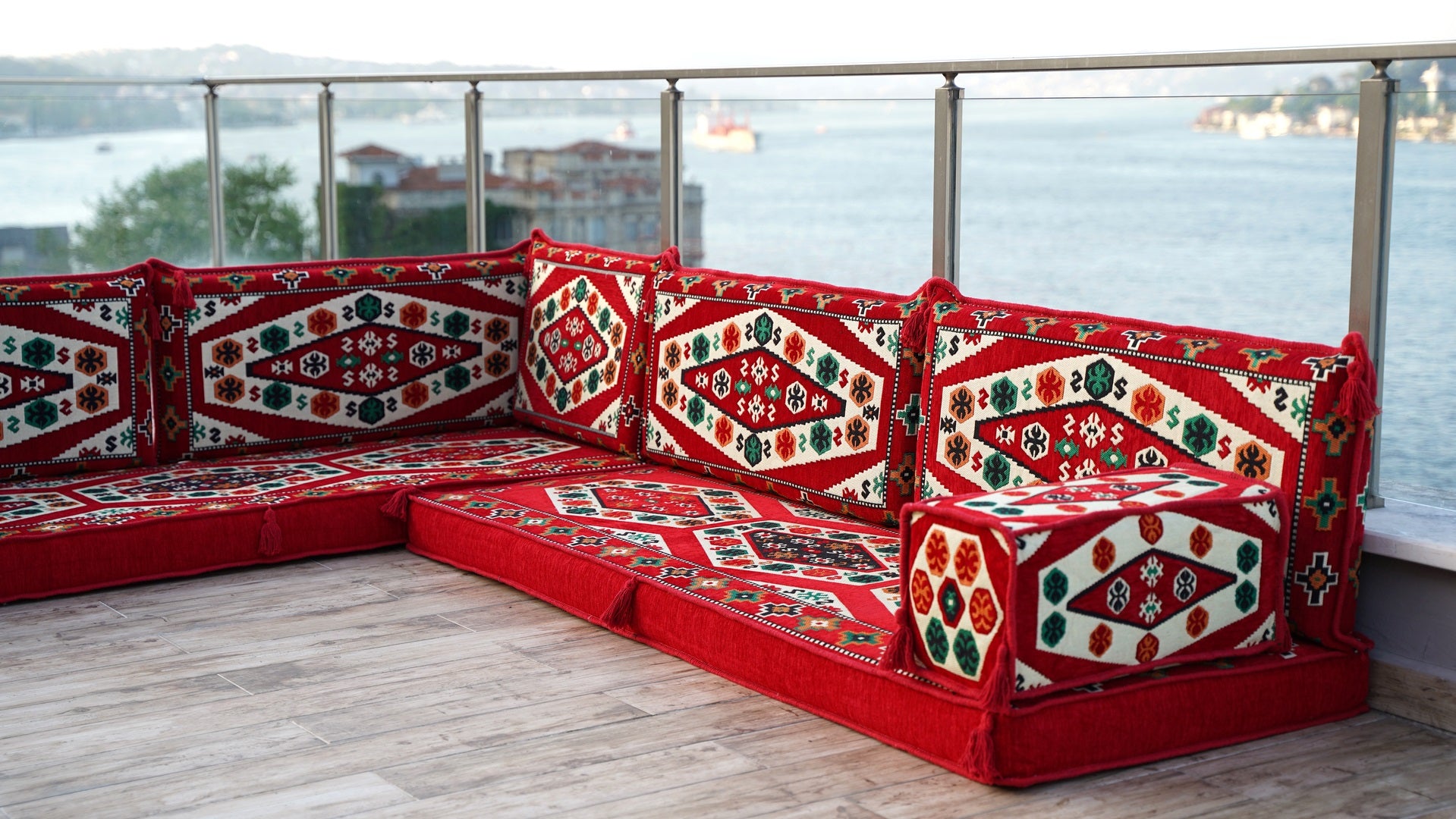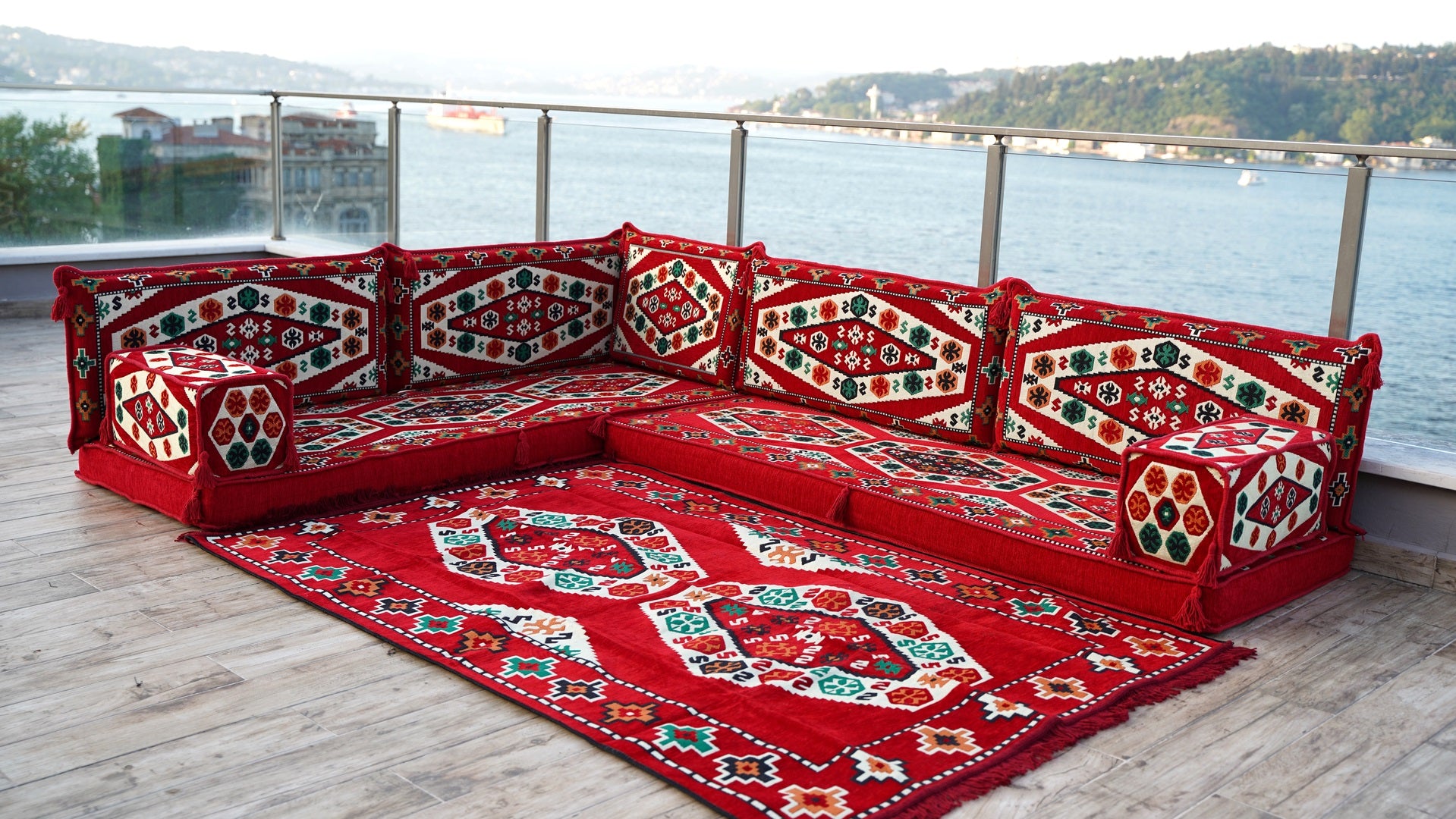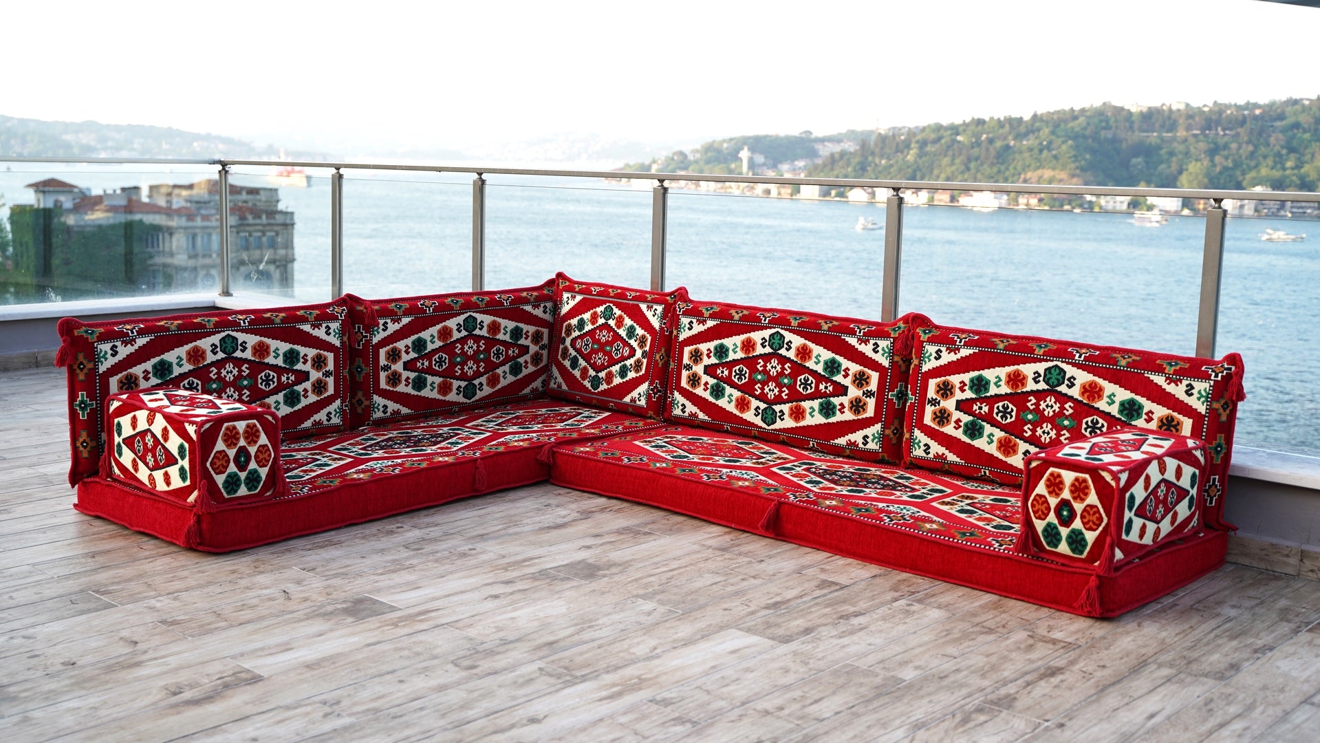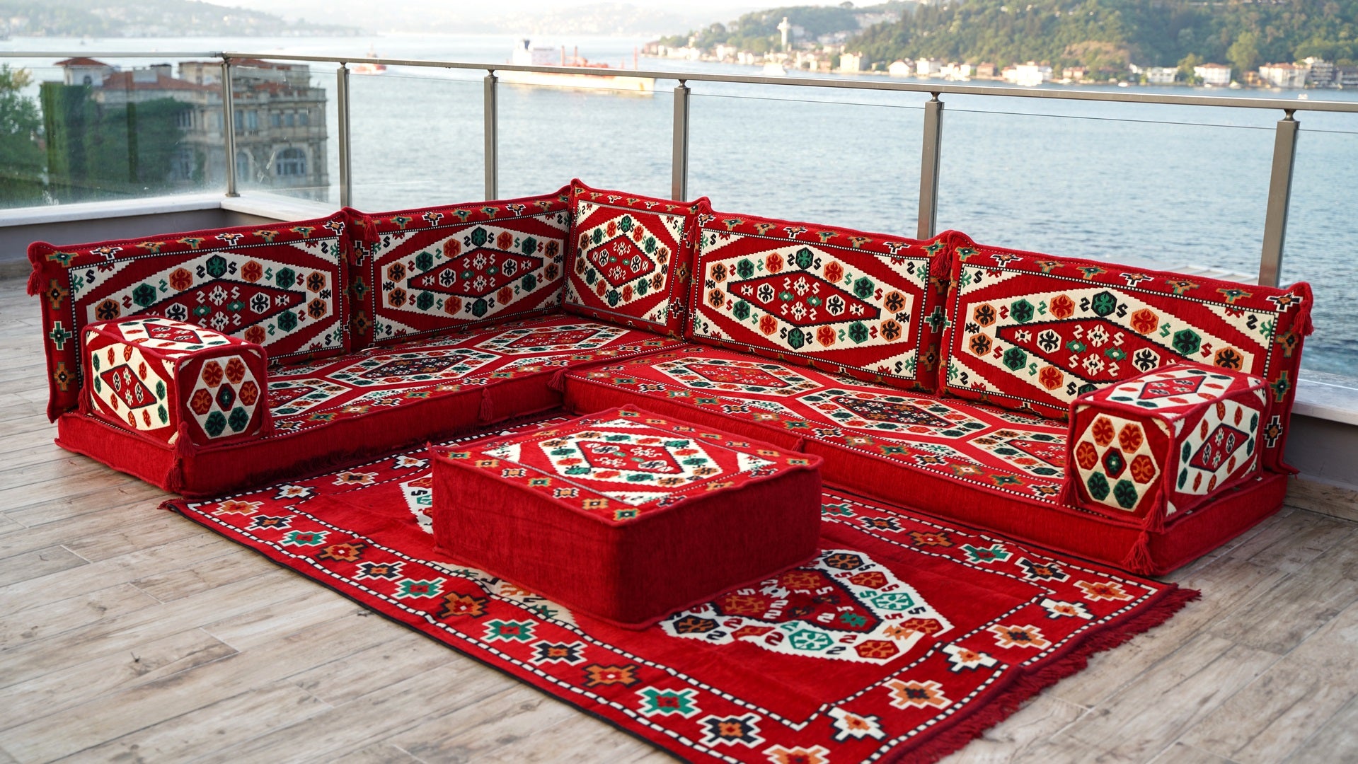 كنبة عربية زرقاء، كنب بوهيمي مقسم، أطقم كنب، كنب باليت، كنب بوهيمي مقسم، وسائد أرضية