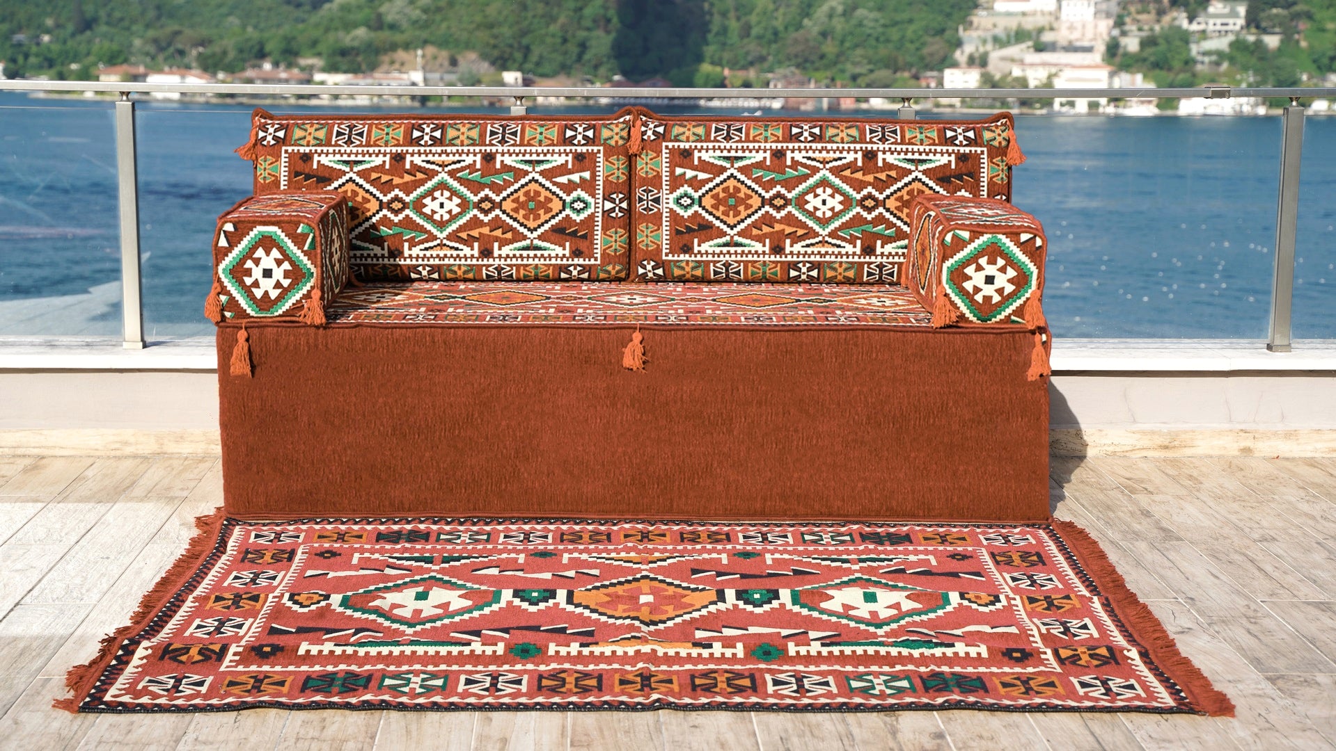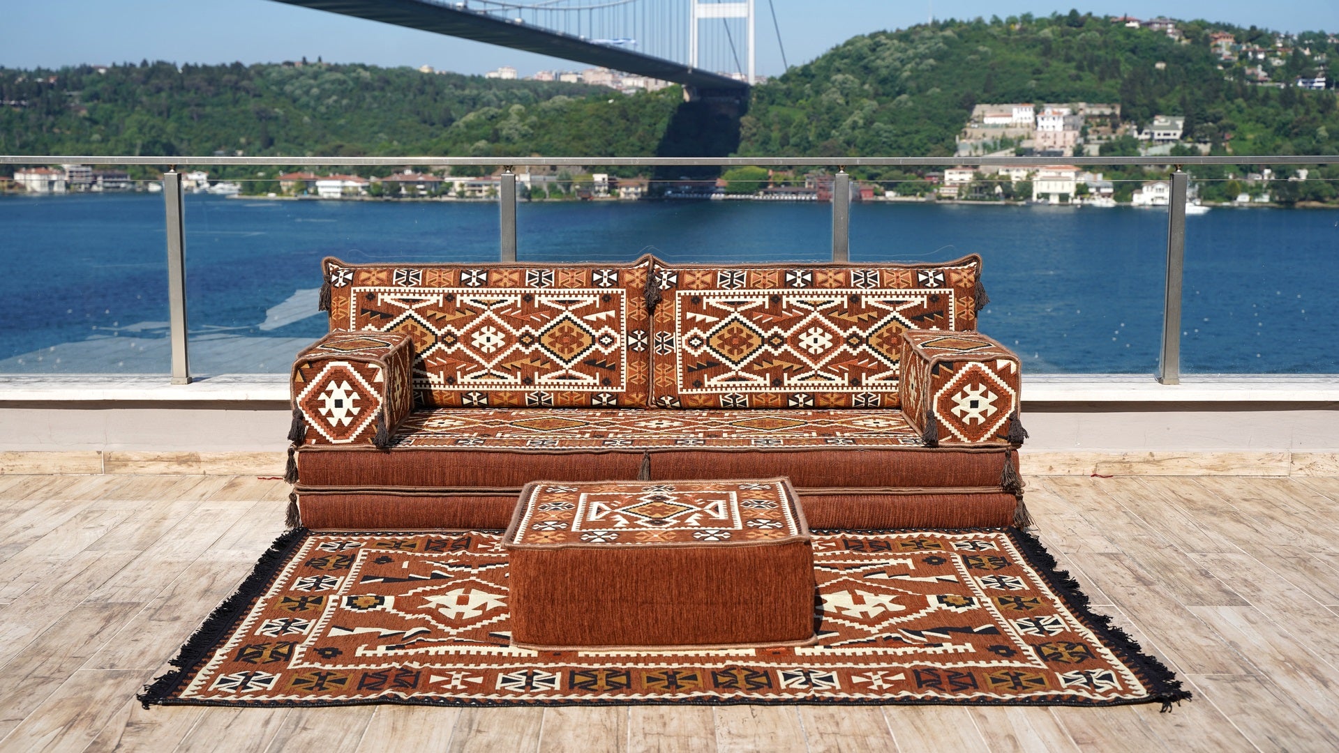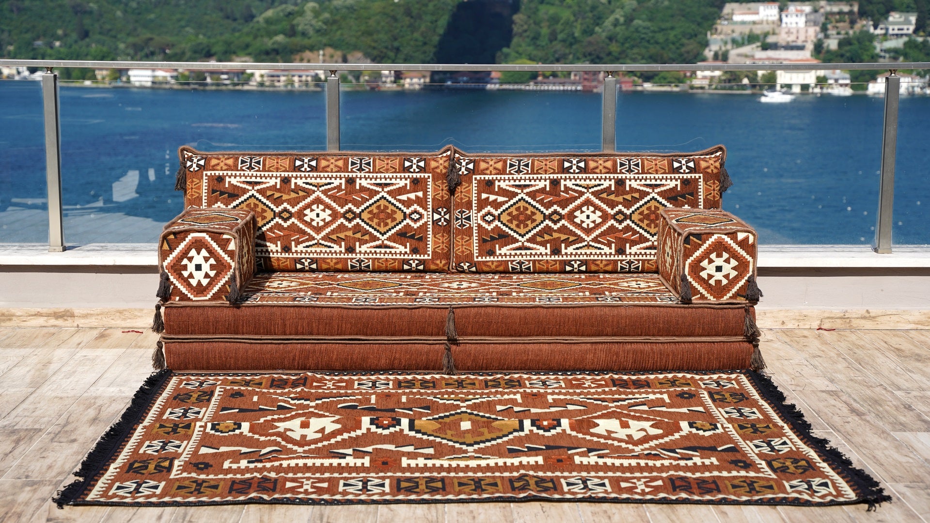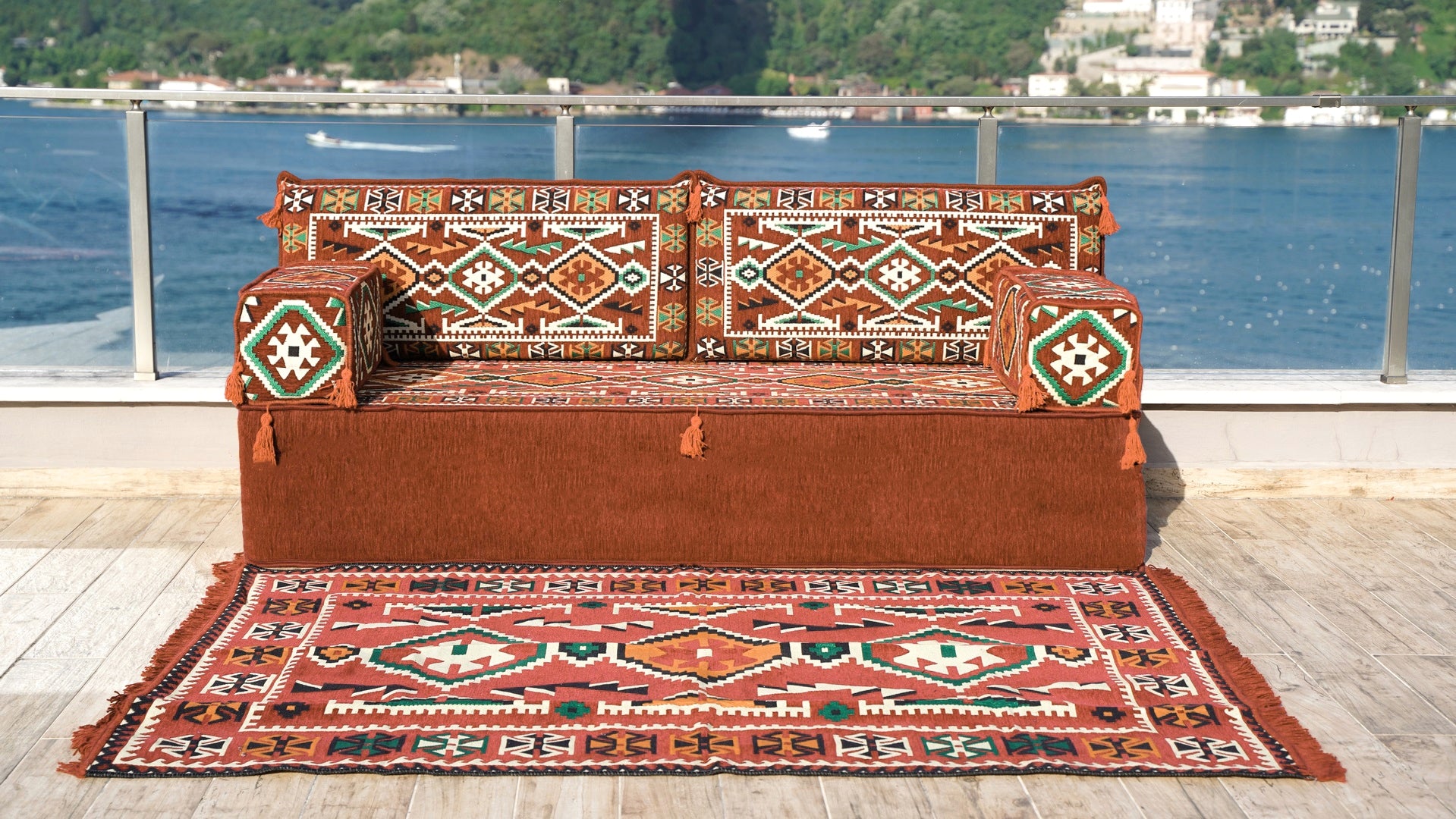 طقم جلوس مغربي أرضي، مجلس عربي، أريكة أرضية عربية مع أريكة عثمانية وسجادة، وسادة شرقية، وسادة مغربية، وسادة أرضية عرقية