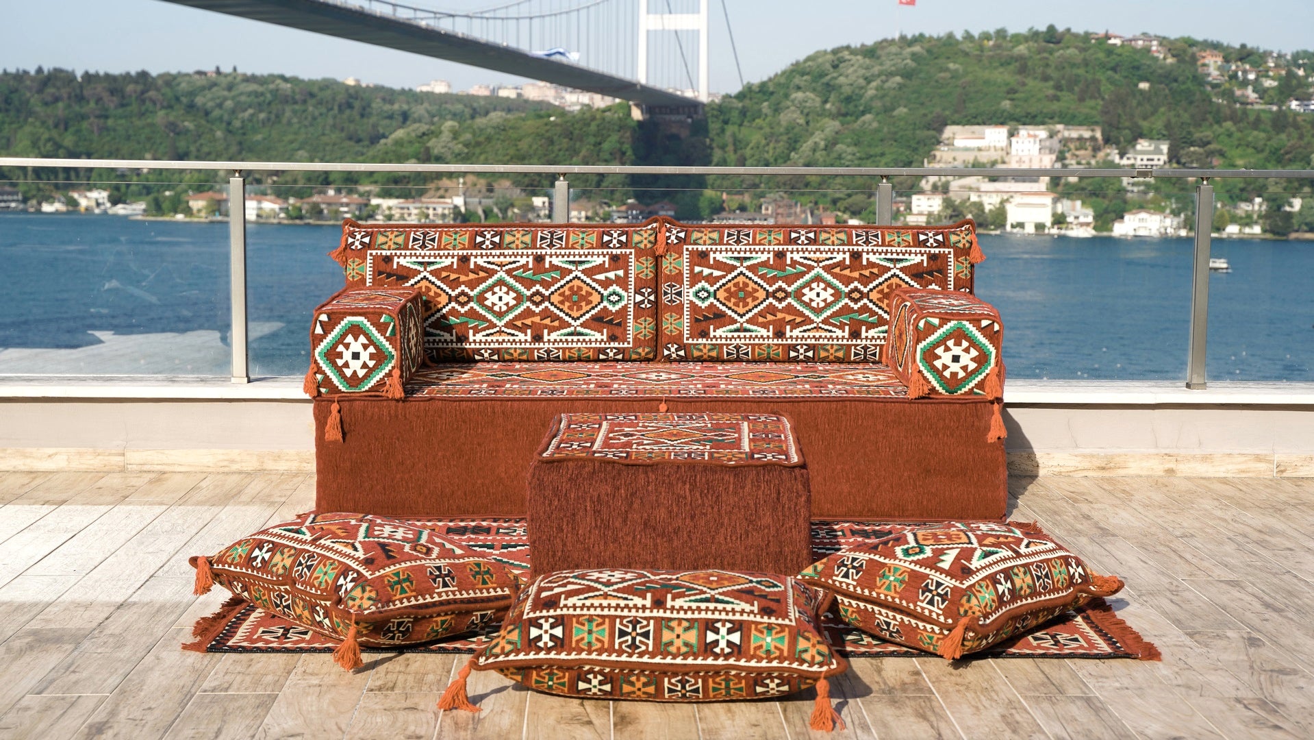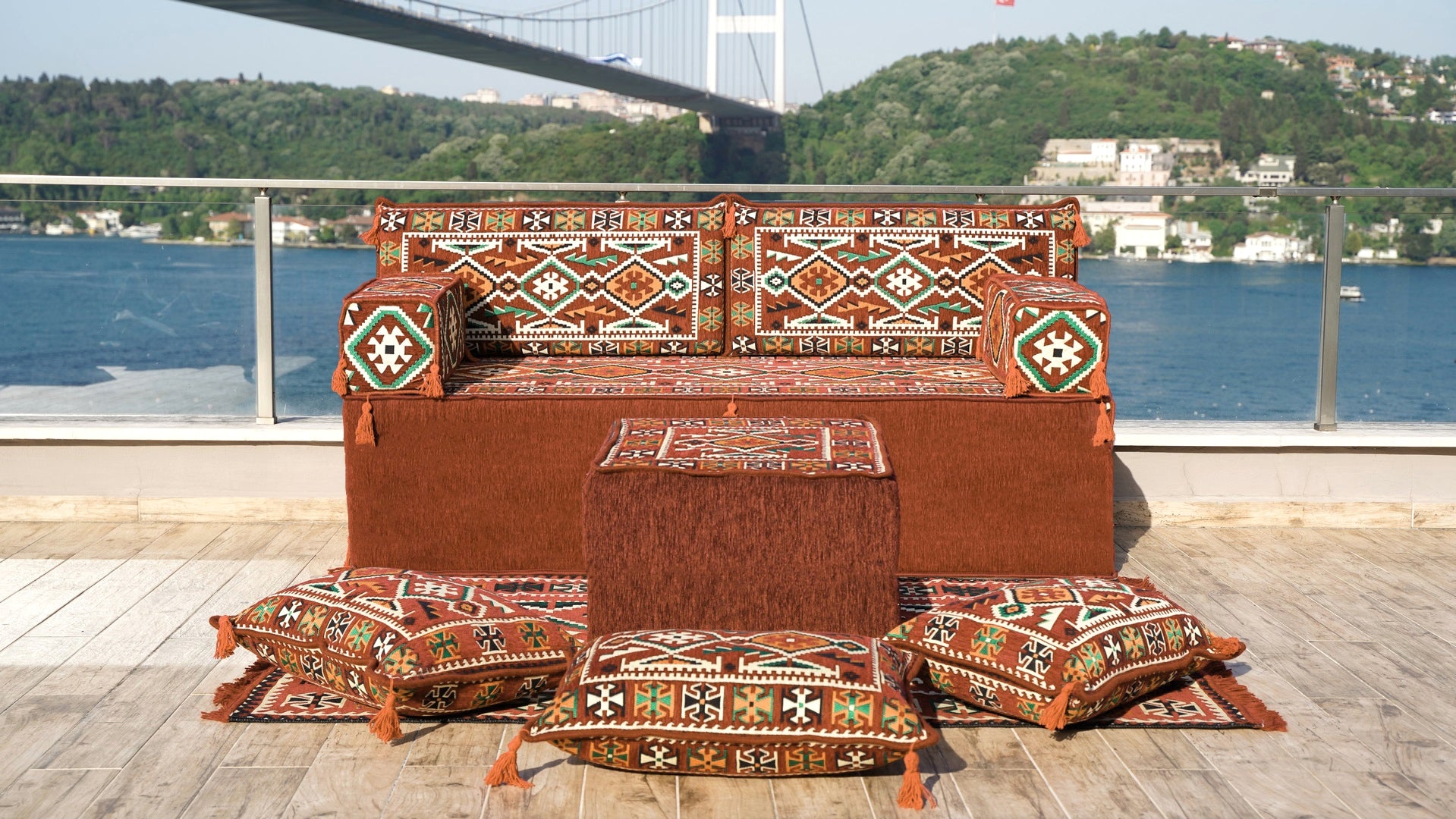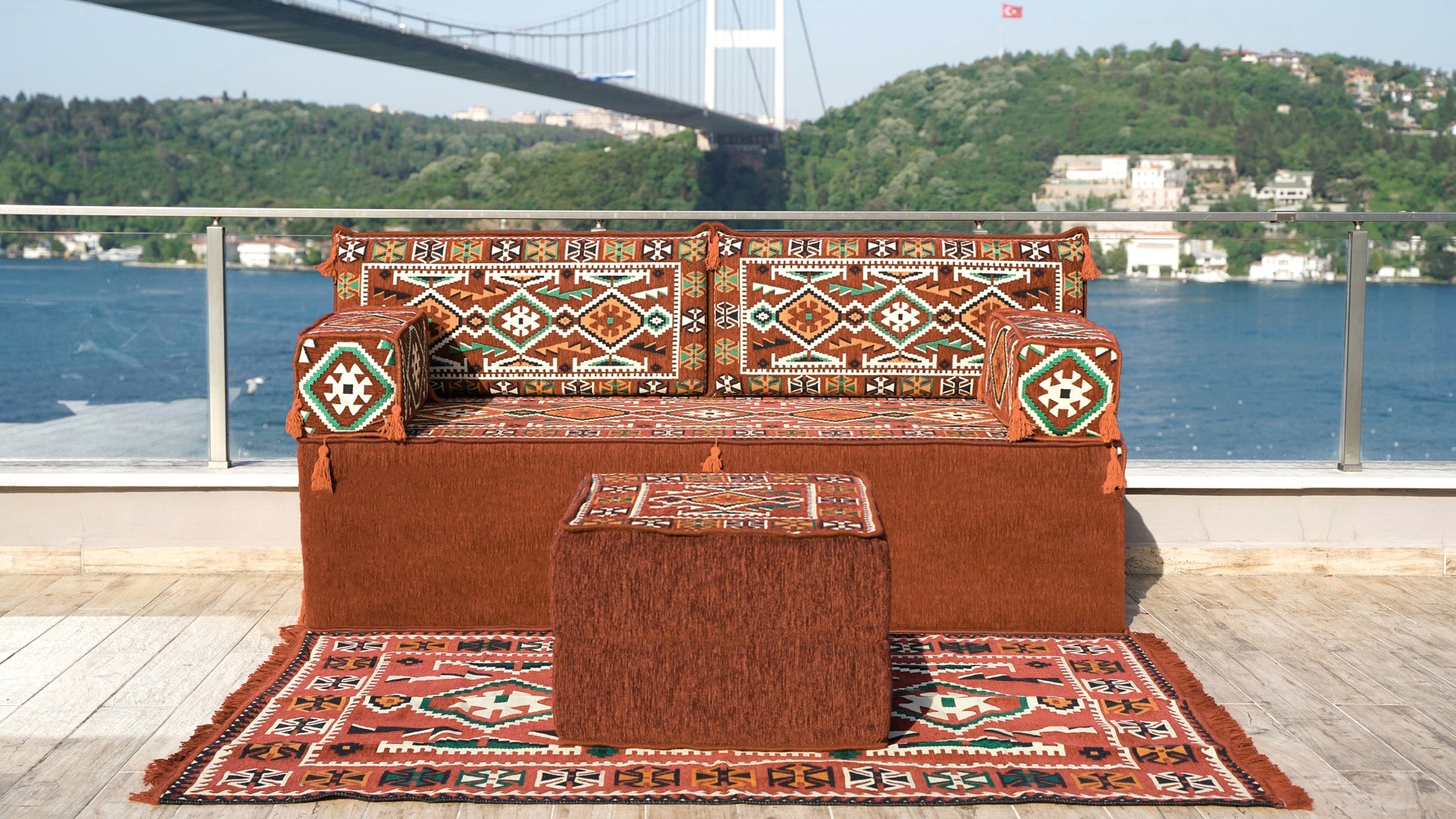 طقم جلوس مغربي أرضي، مجلس عربي، أريكة أرضية عربية مع أريكة عثمانية وسجادة، وسادة شرقية، وسادة مغربية، وسادة أرضية عرقية