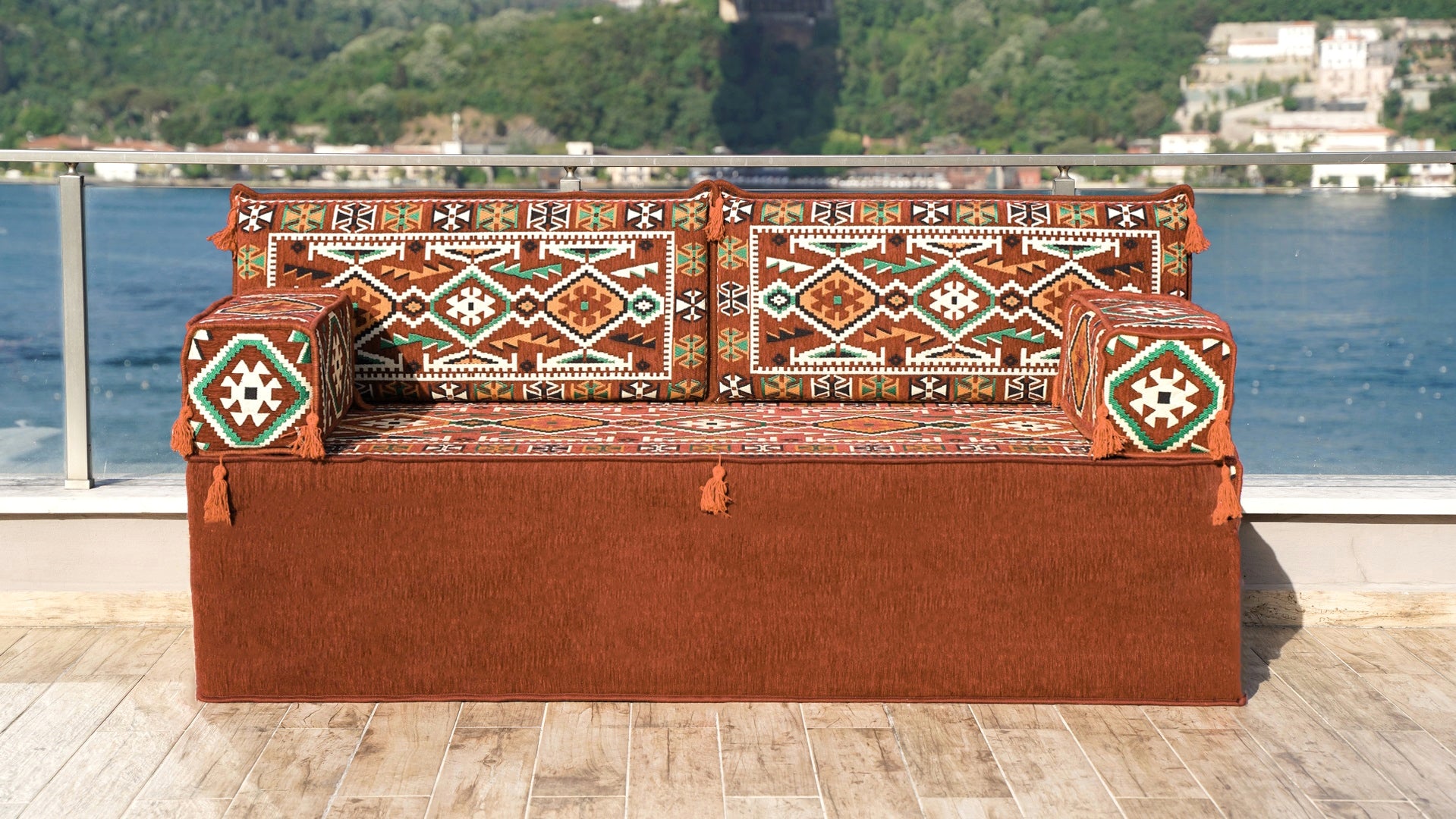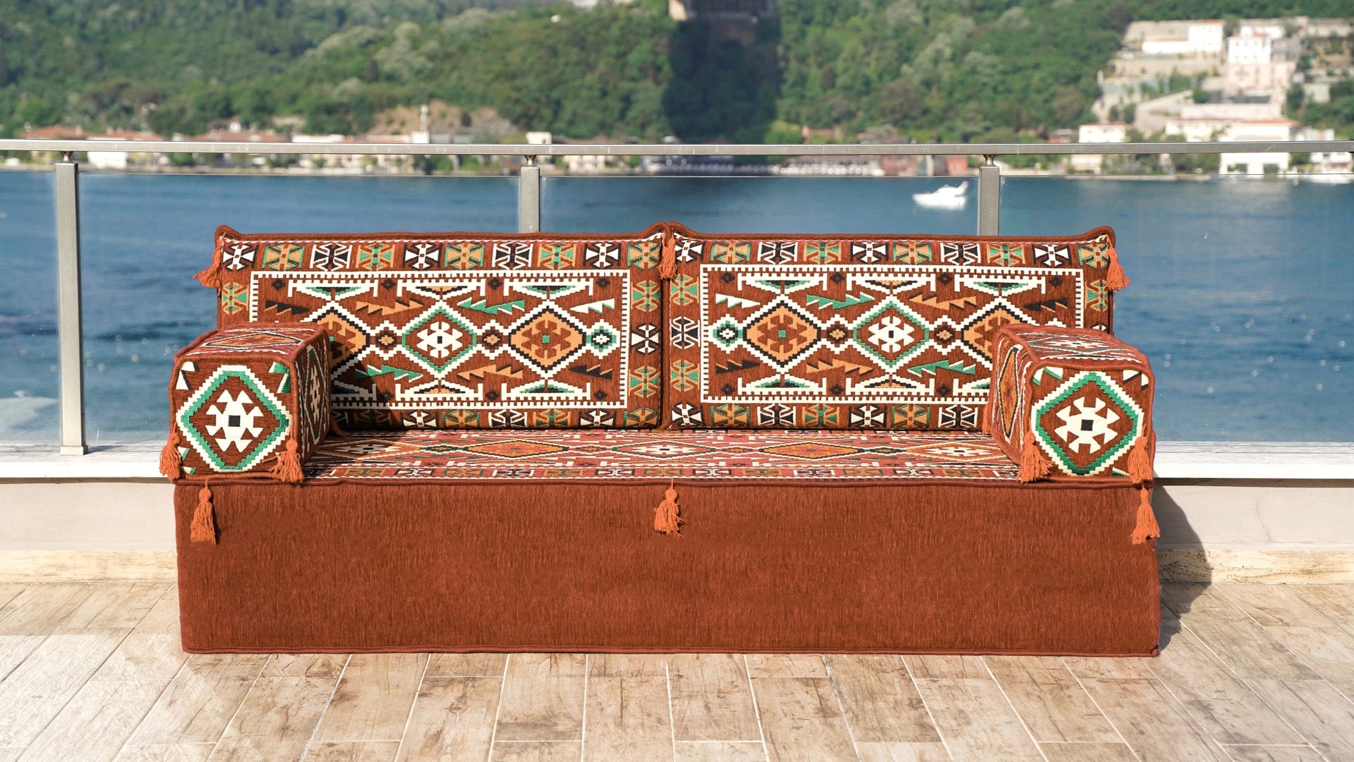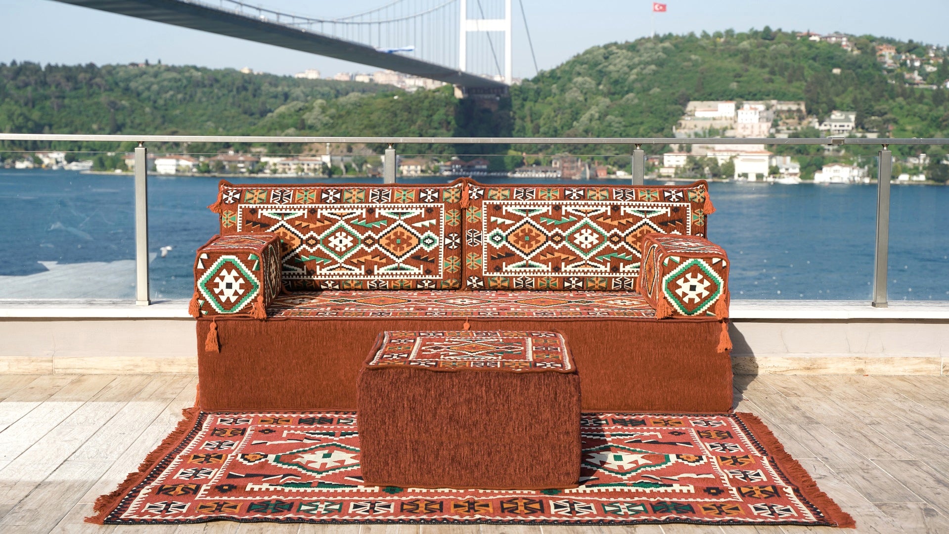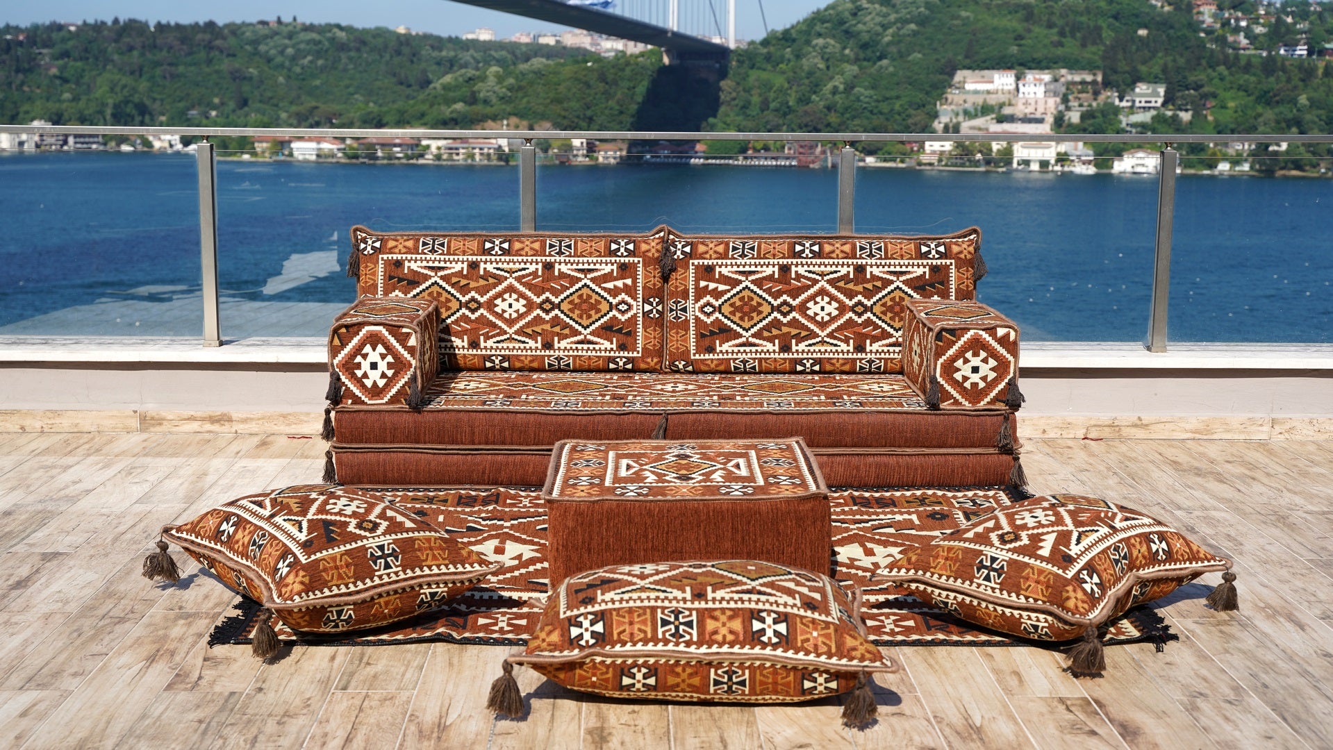 طقم جلوس مغربي أرضي، مجلس عربي، أريكة أرضية عربية مع أريكة عثمانية وسجادة، وسادة شرقية، وسادة مغربية، وسادة أرضية عرقية