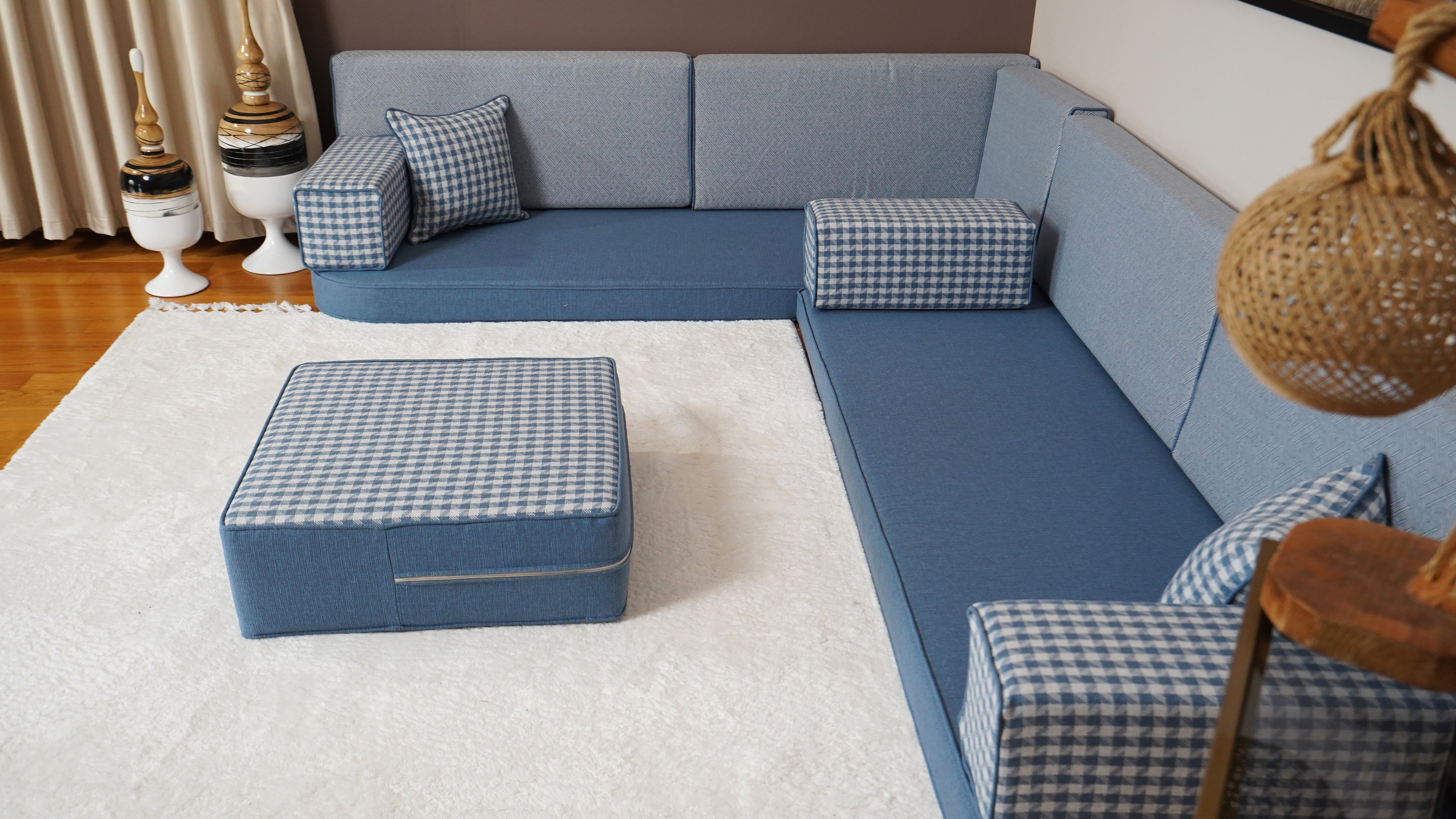 If you will choose 'L Sofa + Ottoman + Pillows / 4'' Thickness Sofa' you will get these: