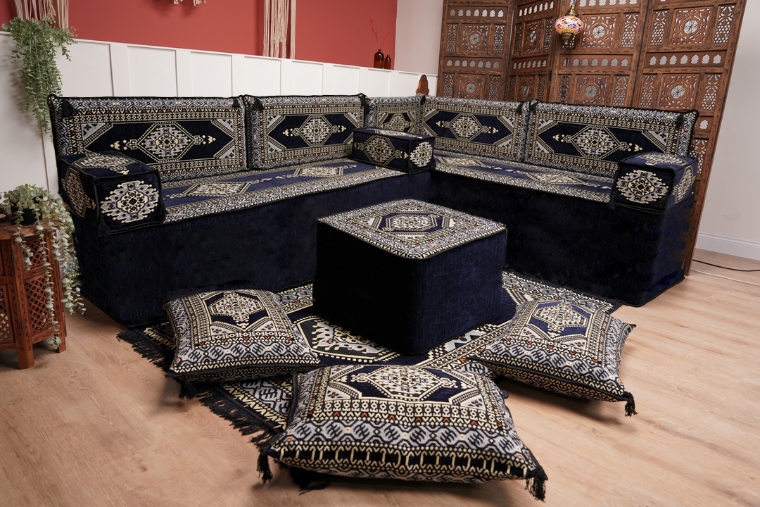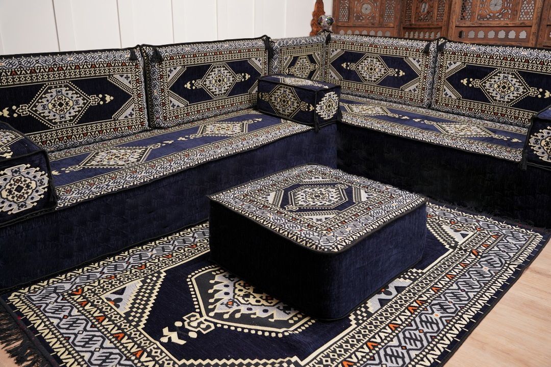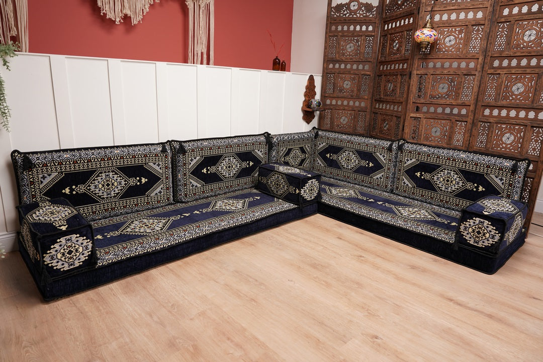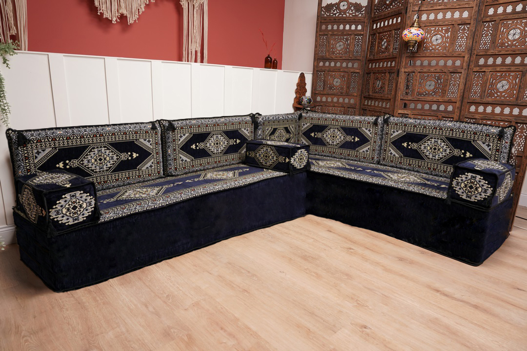 • Arabic Corner Floor Couch, L Shaped Navy Blue Turkish Sofa, Oriental Floor Cushions, Arabic Majlis, Traditional Living Room Sofa, Arabic Jalsa Set