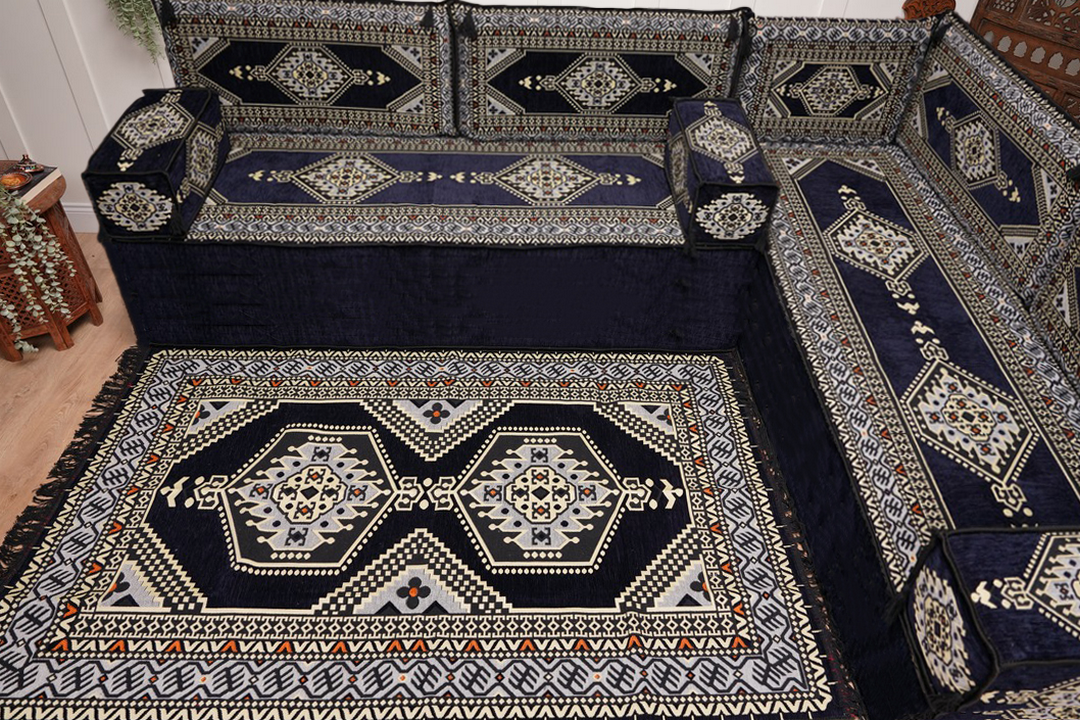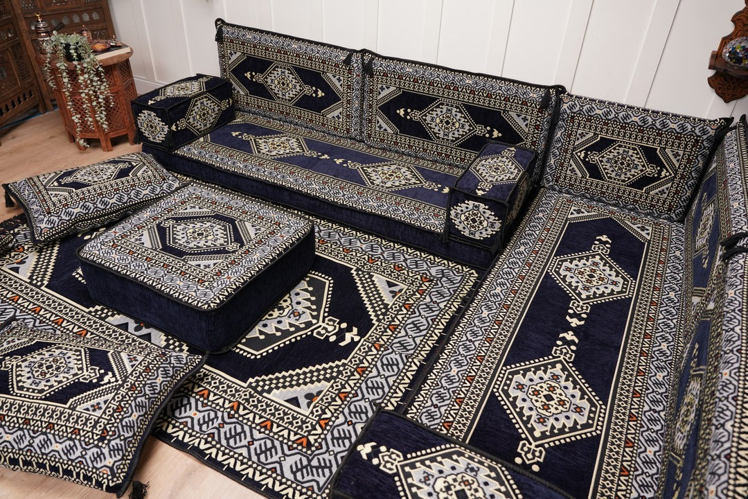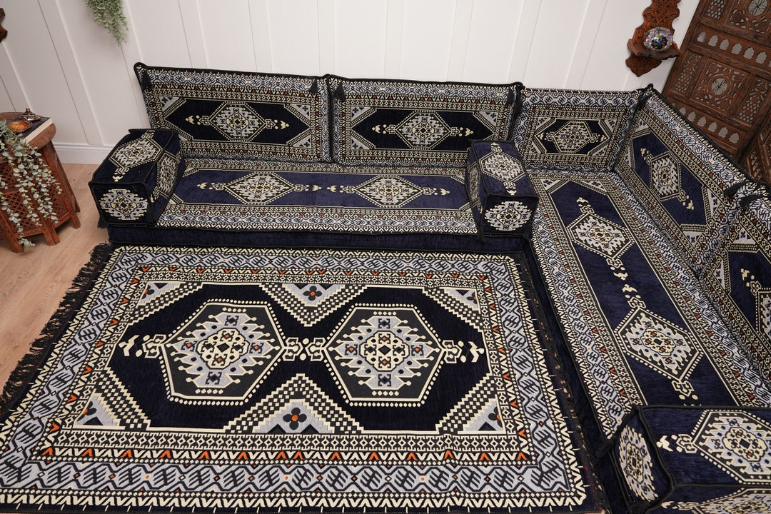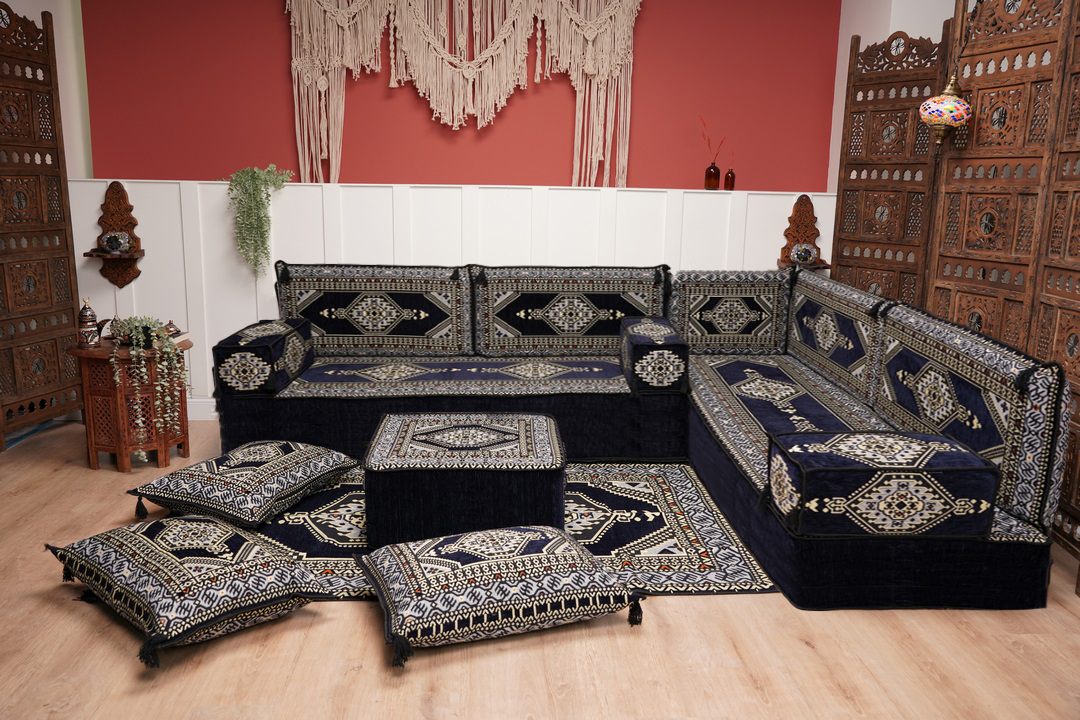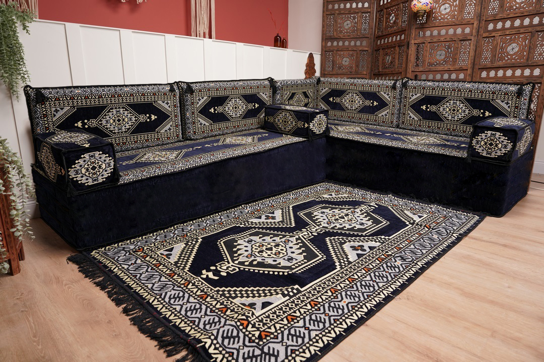 • Arabic Corner Floor Couch, L Shaped Navy Blue Turkish Sofa, Oriental Floor Cushions, Arabic Majlis, Traditional Living Room Sofa, Arabic Jalsa Set