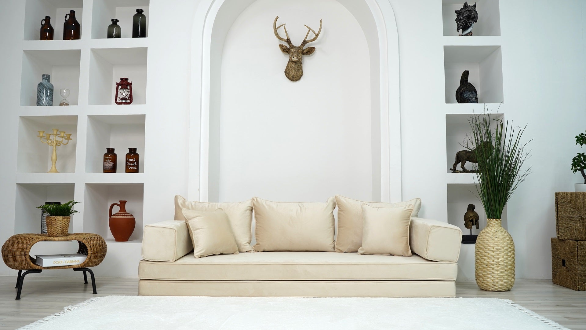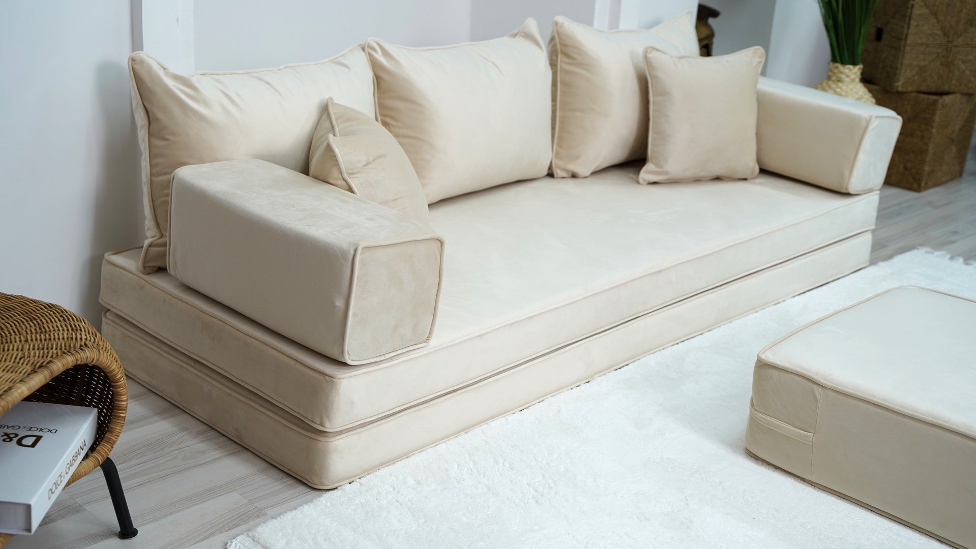• 8" Thick Beige Velvet Floor Seating, Sectional Sofa, Velvet Floor Sofa with Ottoman Couch and Rug, Bohemian Sectionals, Arabic Floor Sofa Set, Floor Couches - Arabic Sofa
