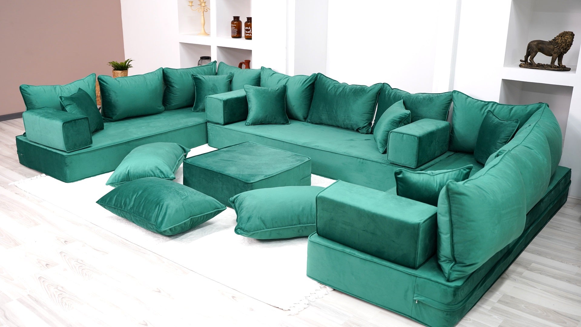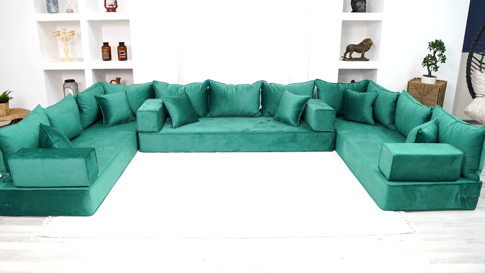 • 8" Thickness Emerald Green U Shaped Velvet Floor Seating, Moroccan Livingroom Sofas - Arabic Sofa