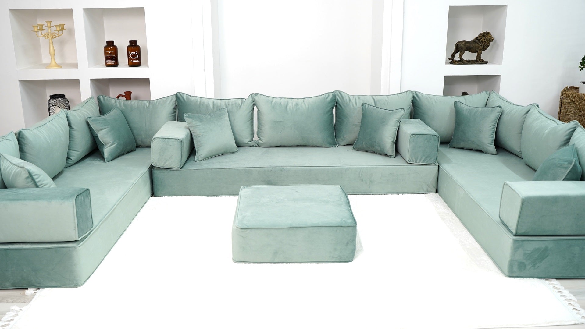 8" Thickness Water Green Velvet Sofa Sets, Moroccan Livingroom Sofa Set, U Arabic Seating Couch, Reading Nook, Custom Cover