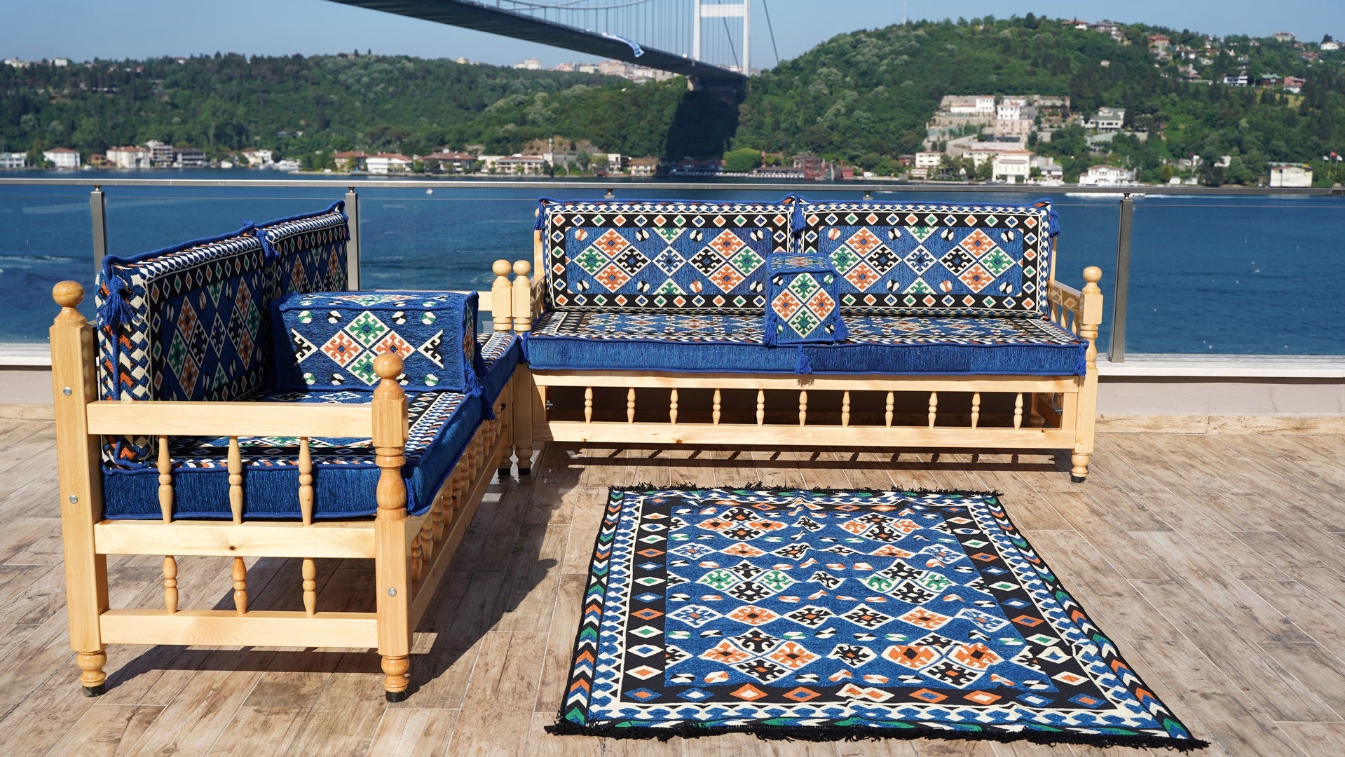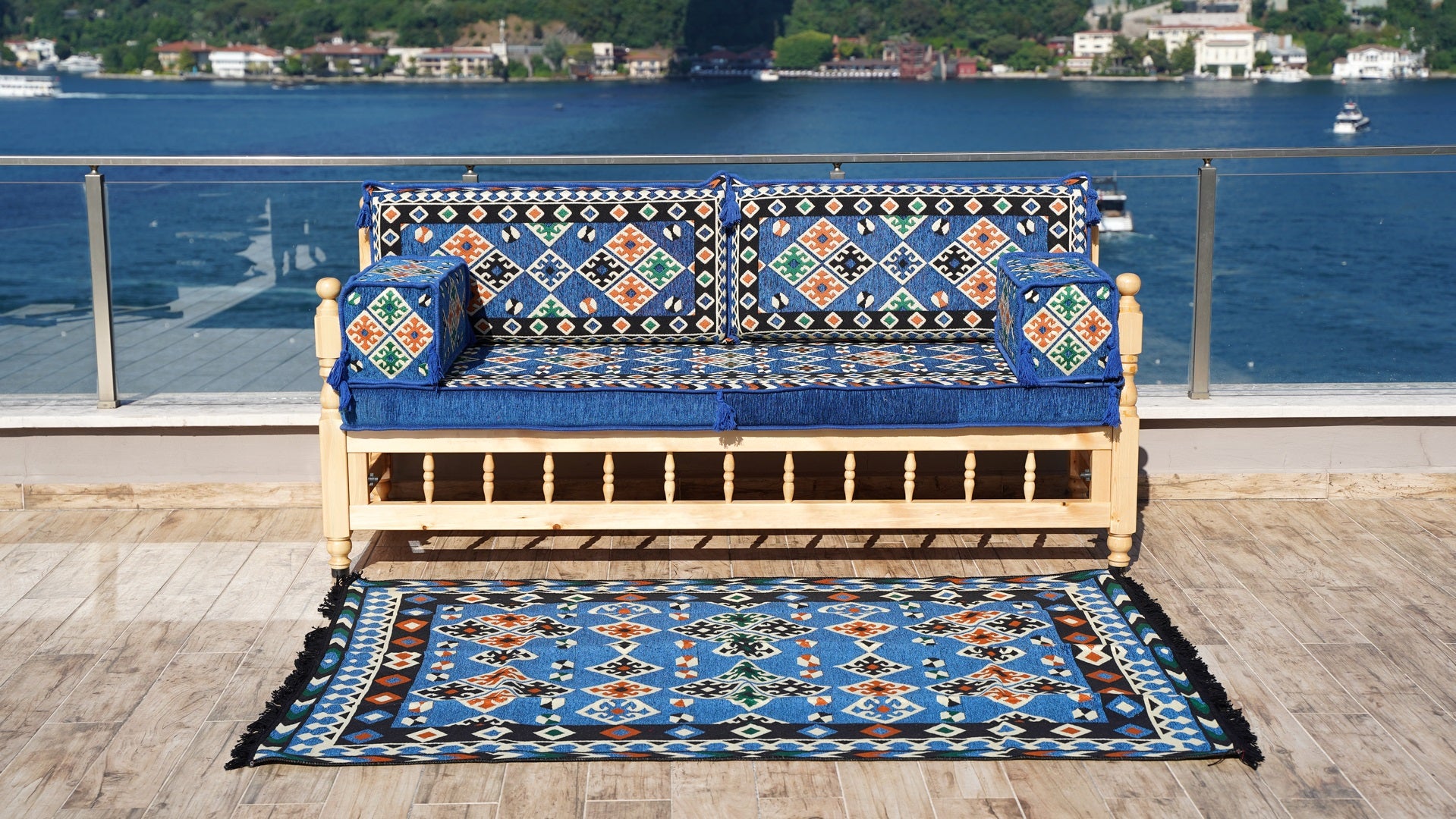 • Royal Blue Arabic Sofa Seating Set, Yemeni Majlis, Arabic Majlis, Wooden Bench Sofa Sets, Sofa Seating Set, Outdoor Bench, Floor Cushions Set, Traditional Wooden Bench