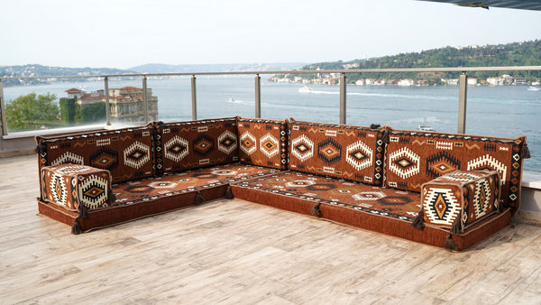 Brown Moroccan Livingroom Cushions, 4" Thick Corner Floor Seating Set, L Shaped Floor Couch