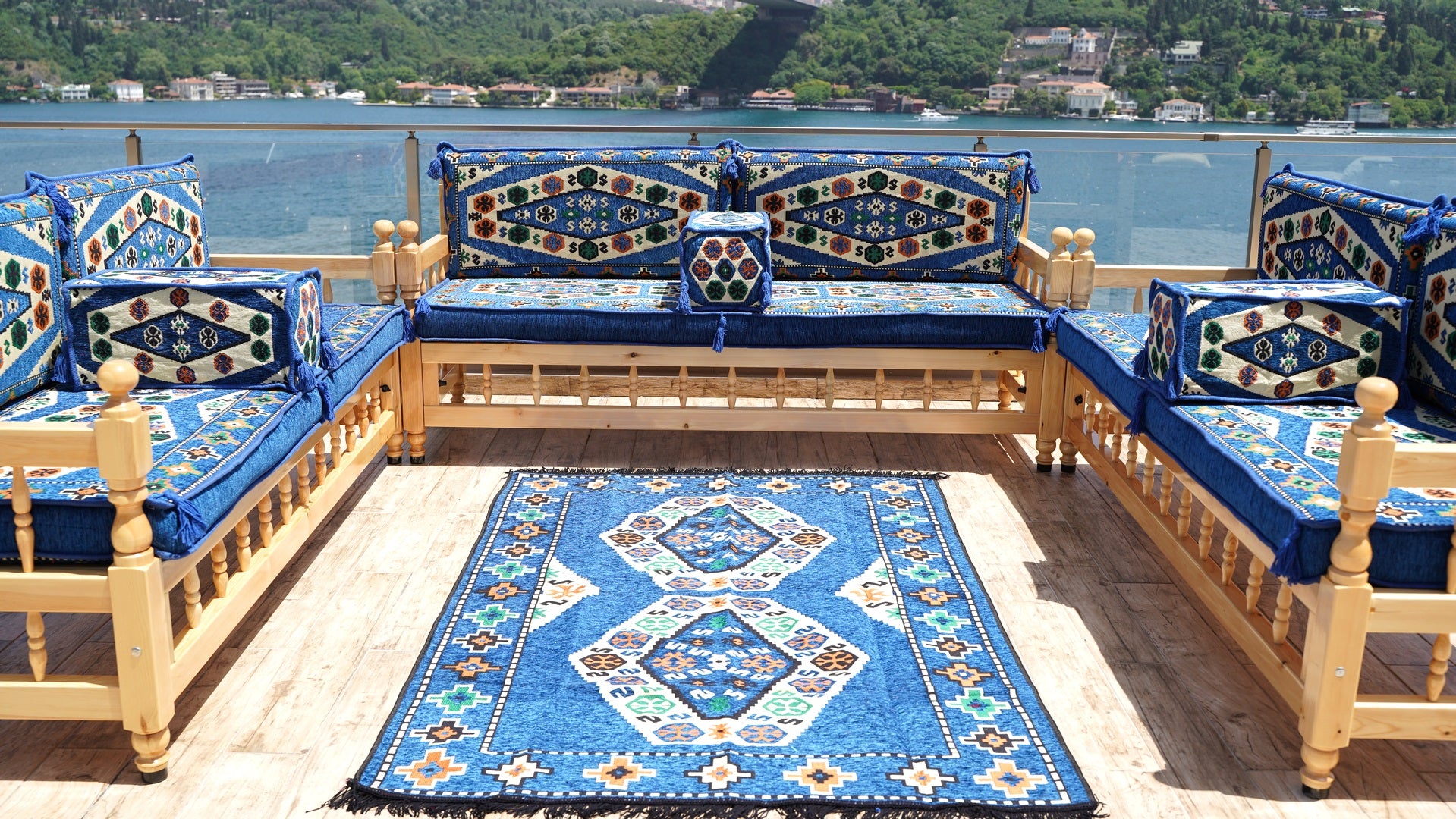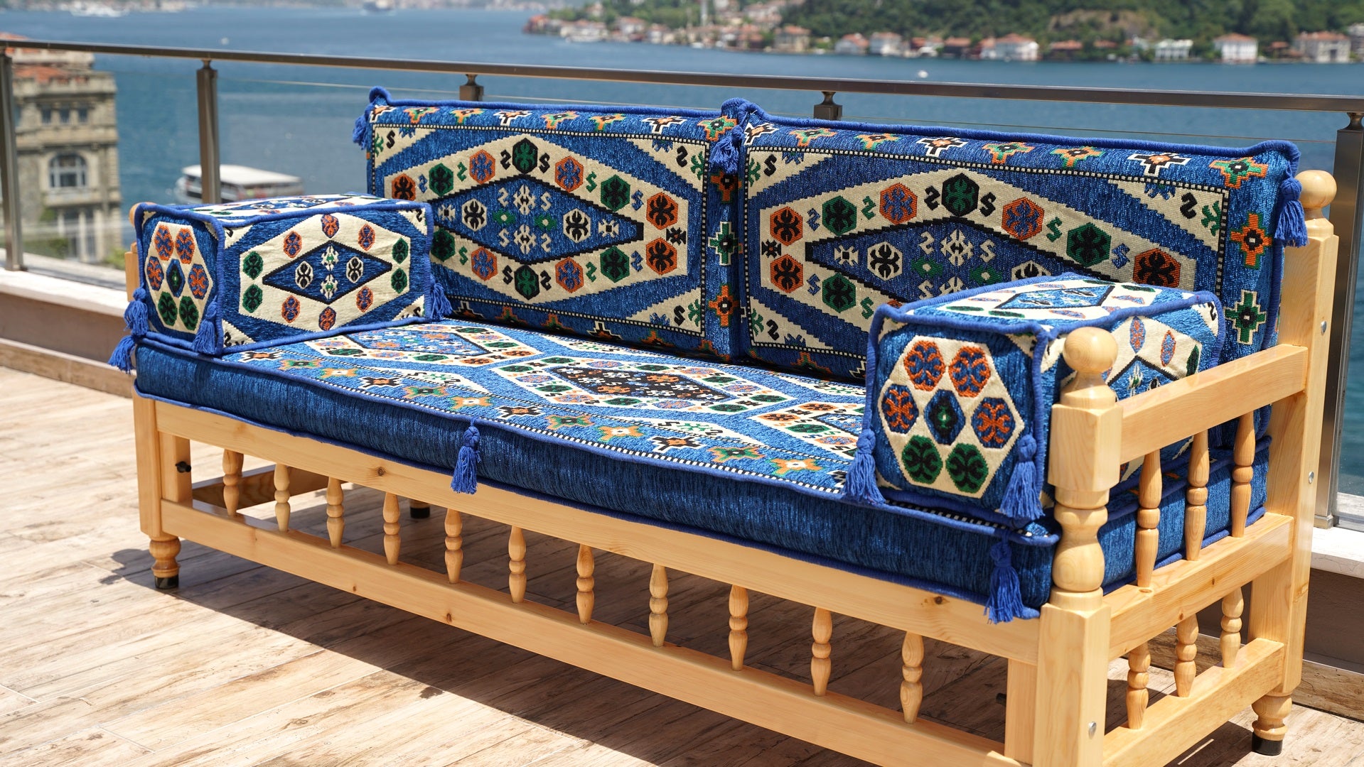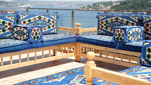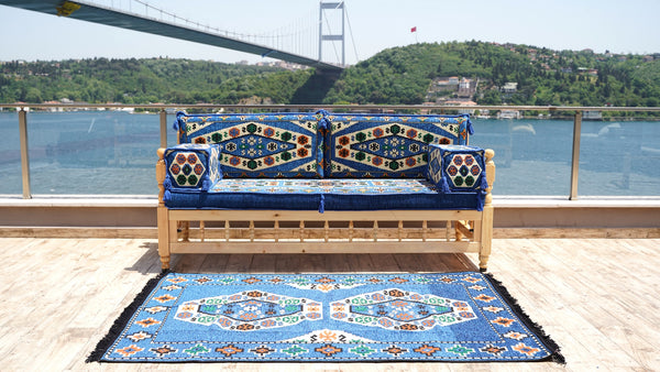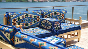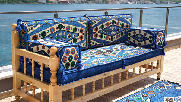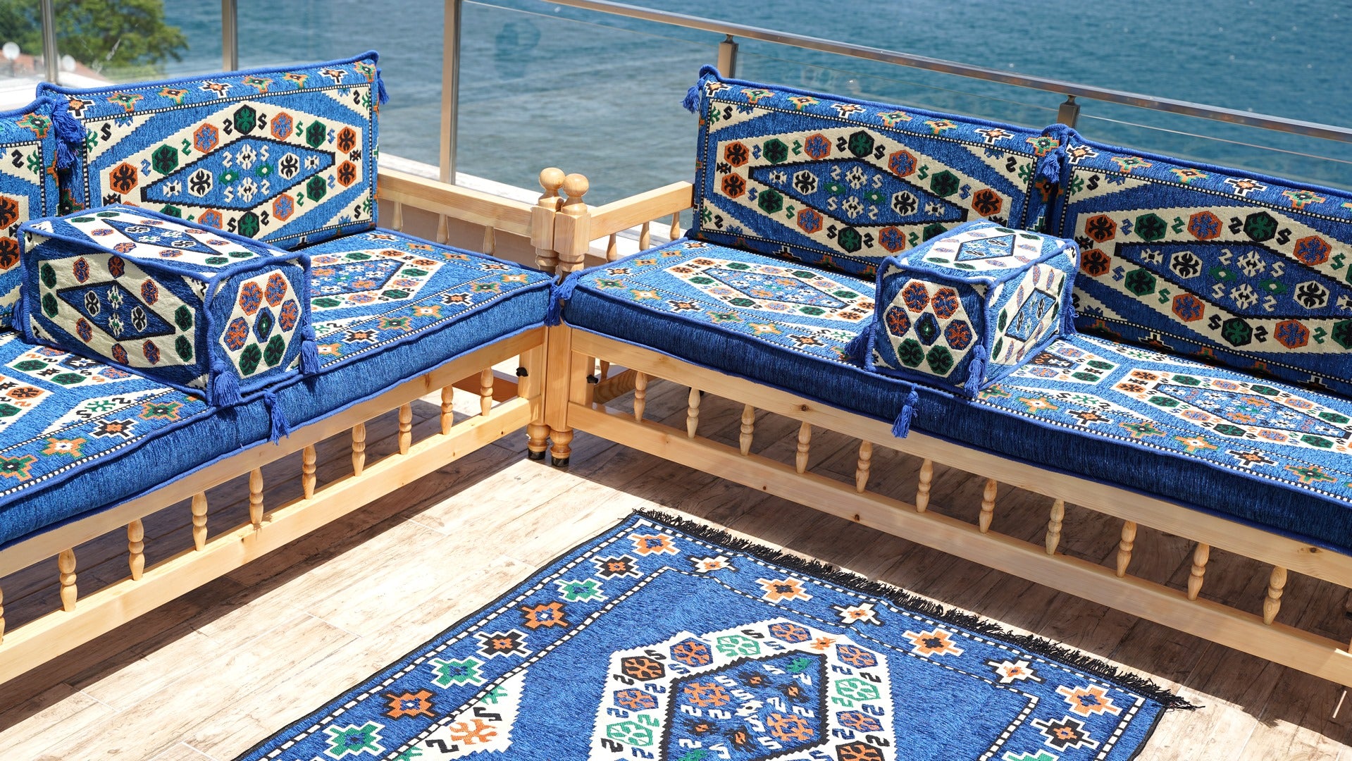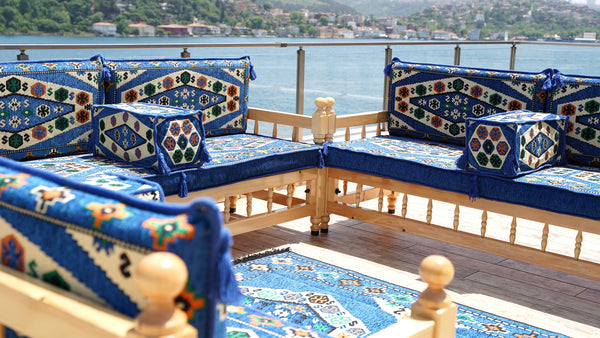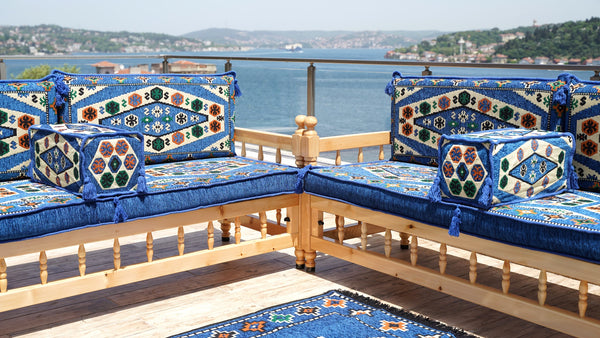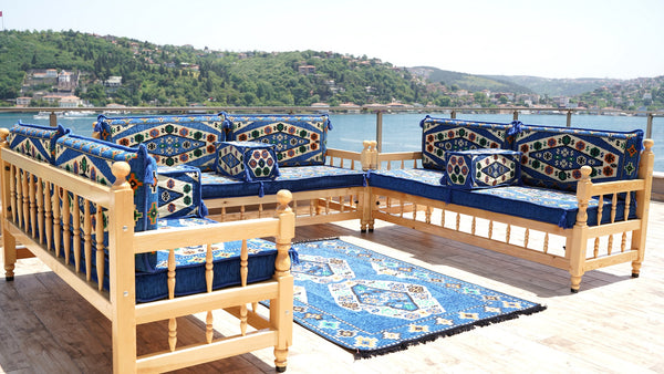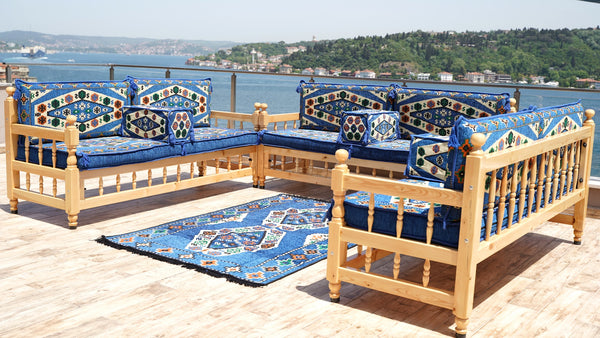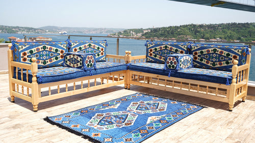 • Royal Blue L Corner Sofa Set, Patio Benches, Wooden Bench Sofa Sets, Moroccan Bench Cushion, Yemeni Majlis, Floor Cushions Set, Arabic Jalsah Seating, Garden Sofa Set