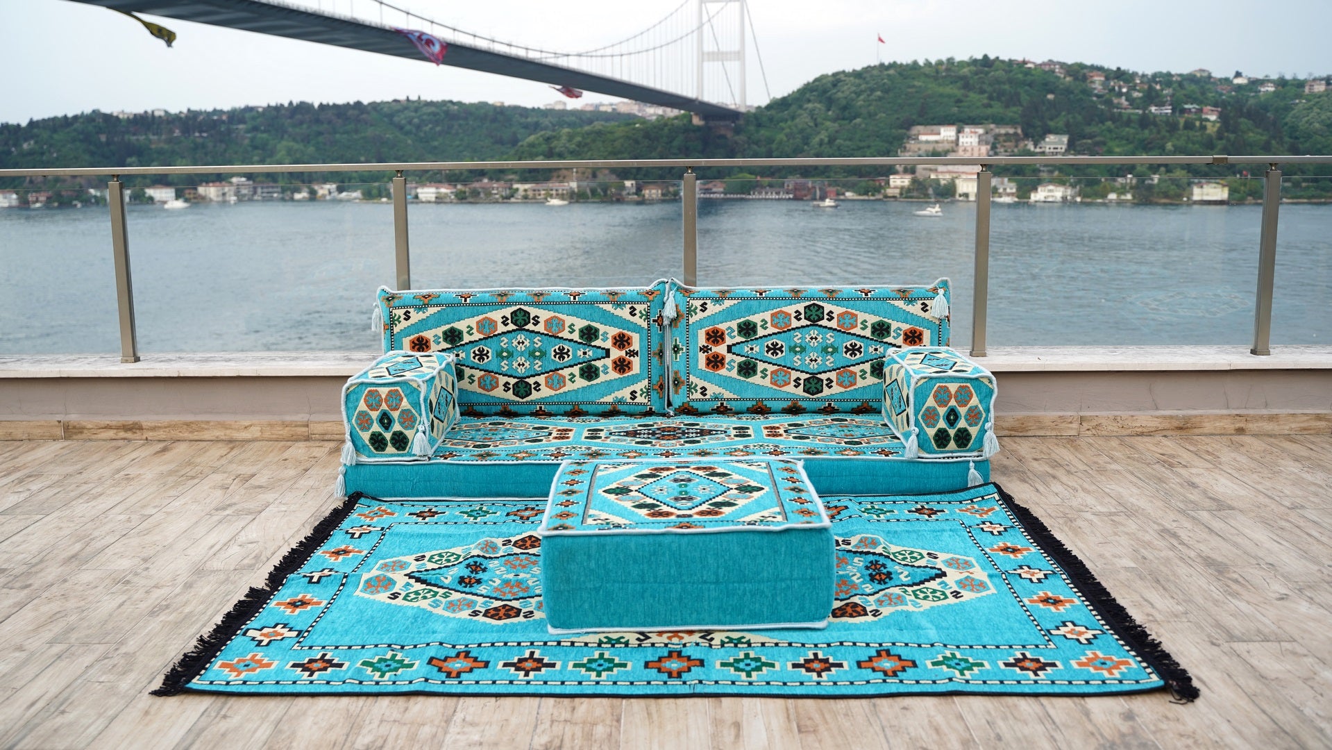• Light Blue Arabic Majlis, Arabic Floor Couch, Oriental Cushion, Moroccan Floor Seating Set, Moroccan Cushion, Ethnic Floor Sofa with Ottoman Couch and Rug