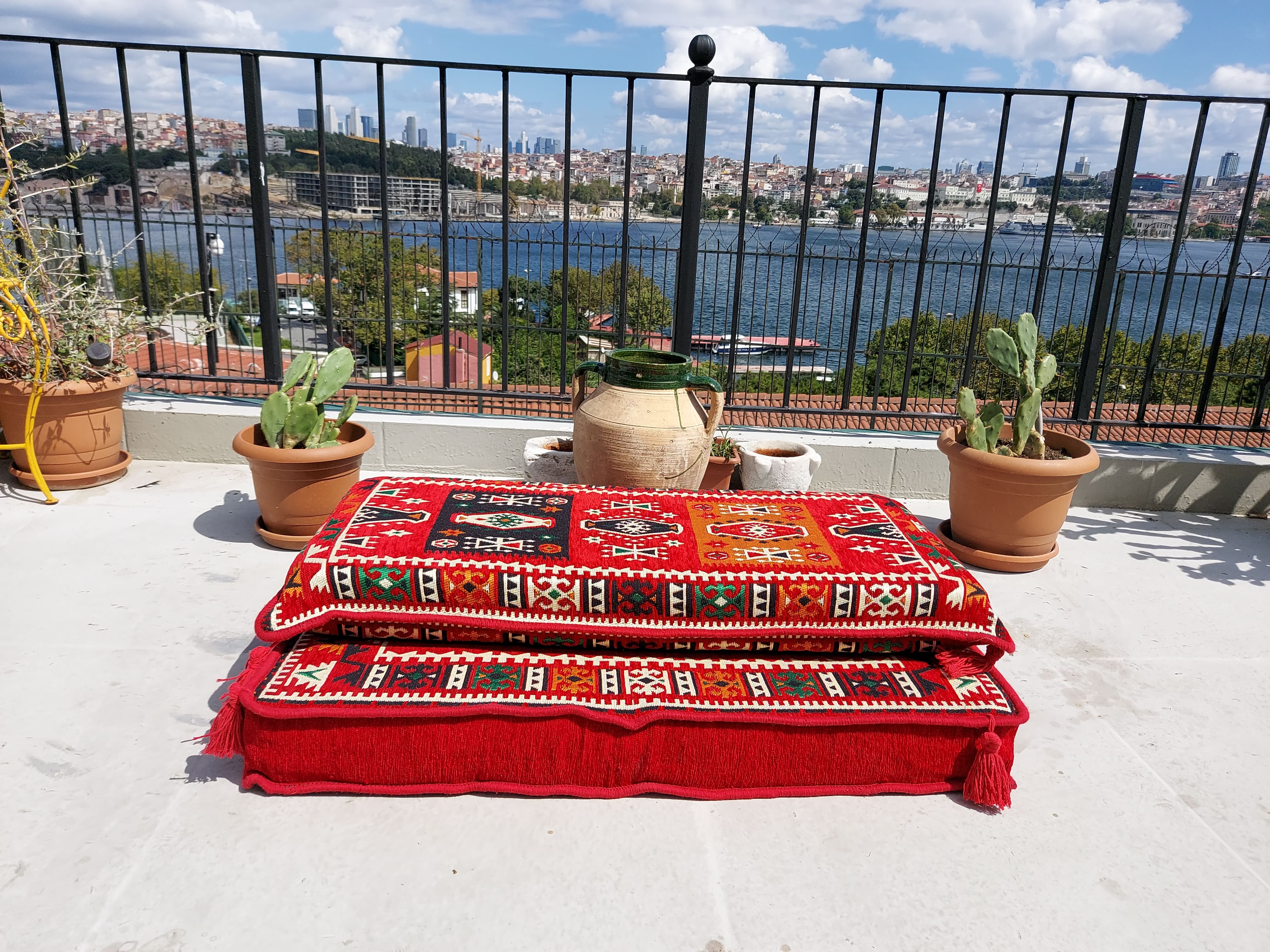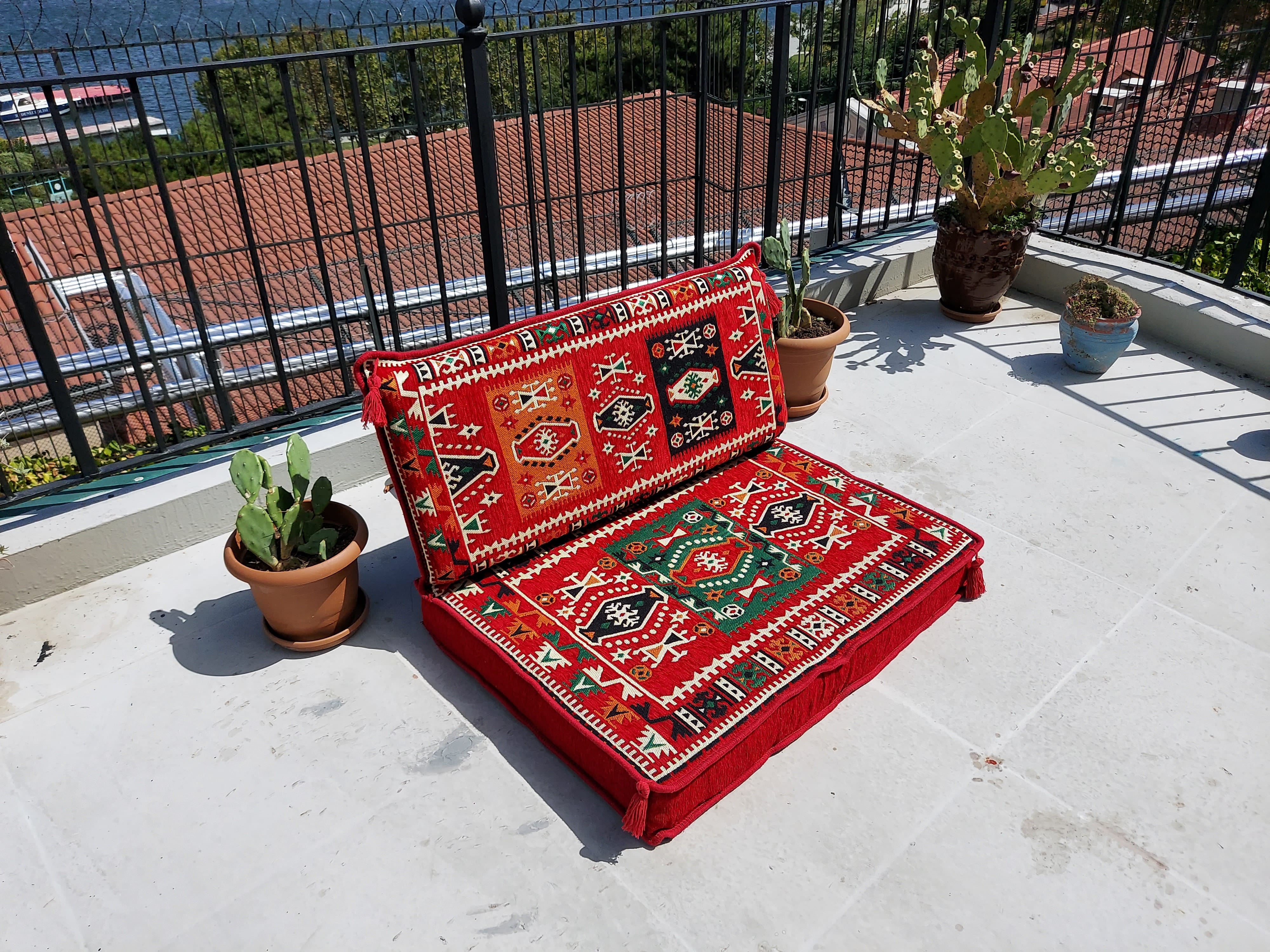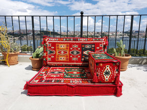 Milas Red Pallet Sofa, Floor Cushions, Loveseats, Small Sectional Sofa, Arabic Sofa Floor Seating Set,Meditation Sofa, Arabic Majlis, Kilim Rug Design