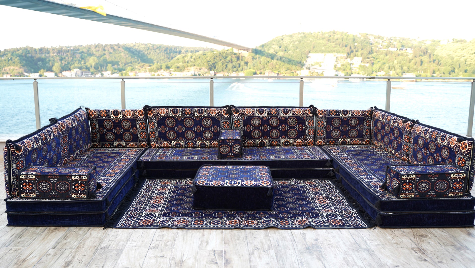 • Navy Blue U Shaped Arabic Floor Sofa Set, Floor Cushions, Balcony Patio Sofas, Pallet Sofa, Ethnic Sofa, Moroccan Sofas
