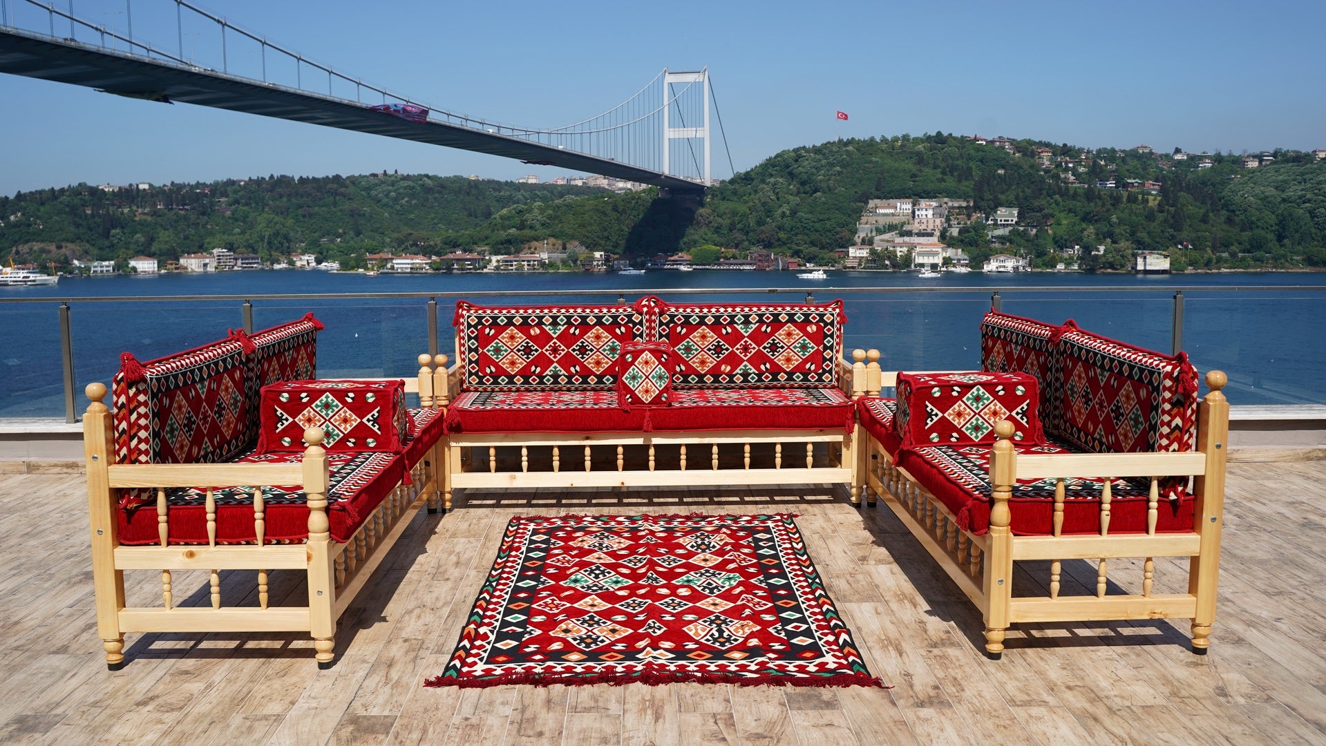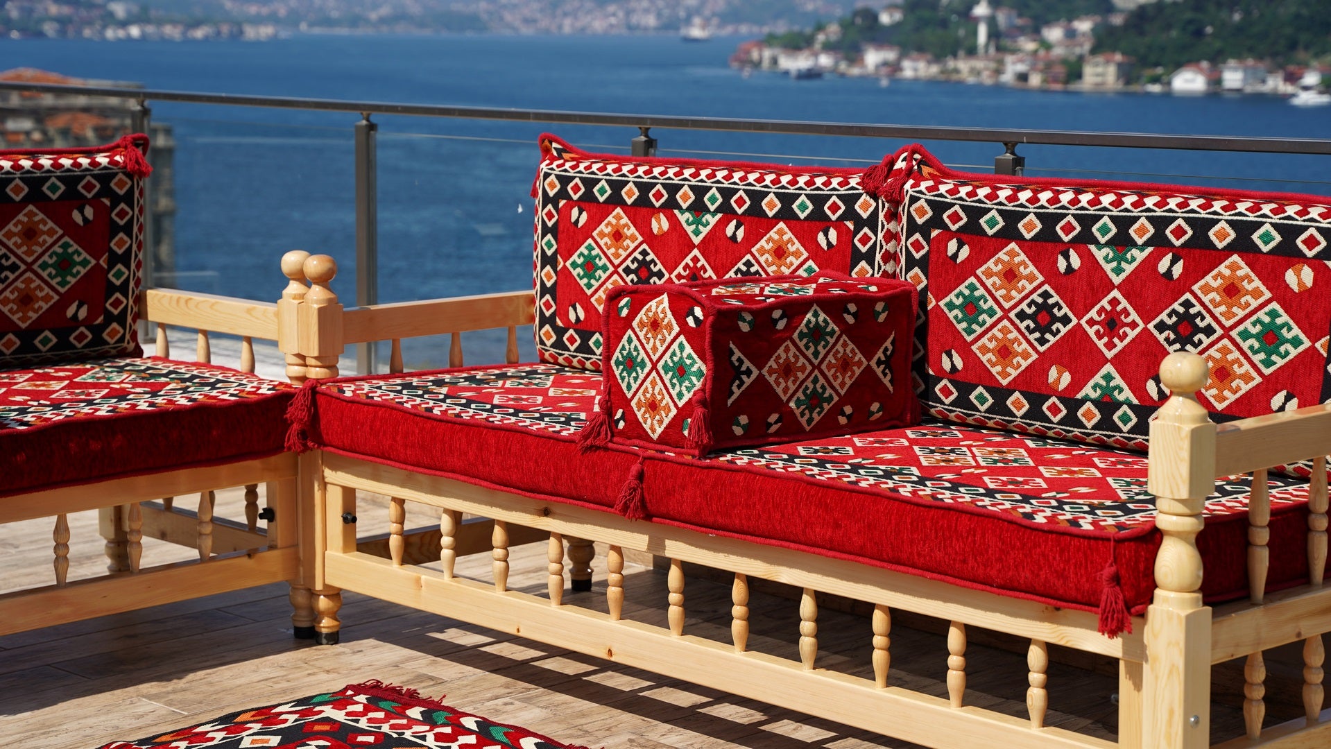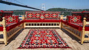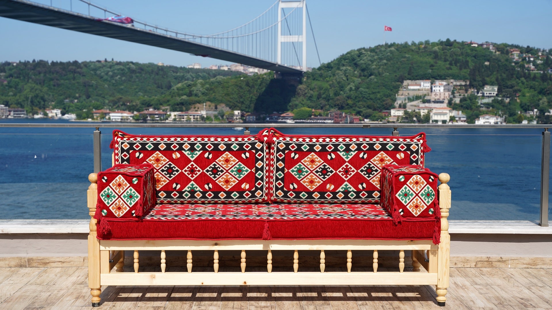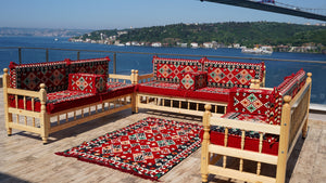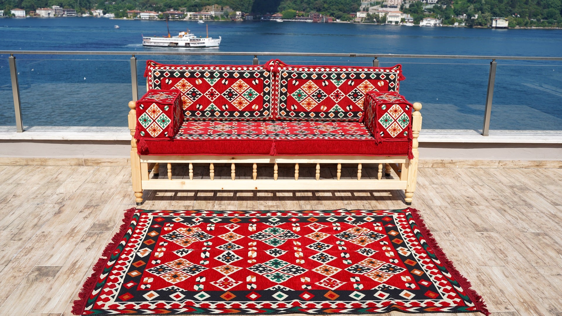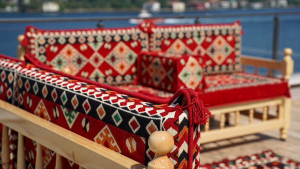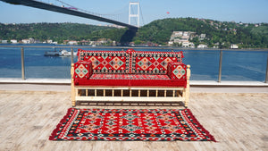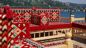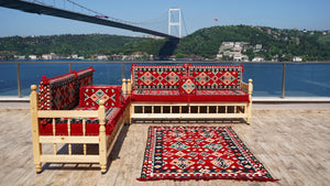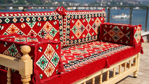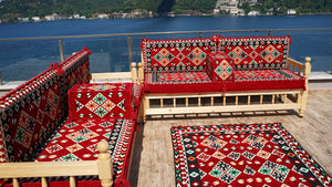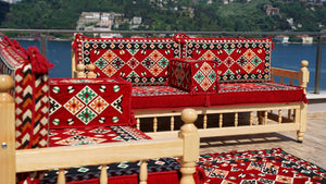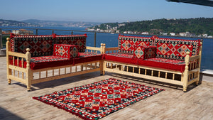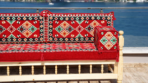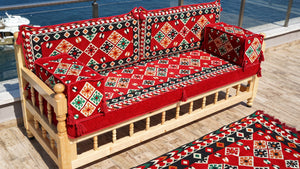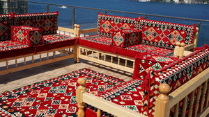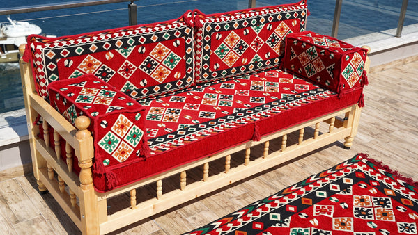 • Red Patio Benches, Outdoor Furniture, Wooden Bench Sofa Sets, Floor Cushions, Arabic Seating Jalsah, Traditional Wooden Bench, Garden Sofa Set, Floor Cushions