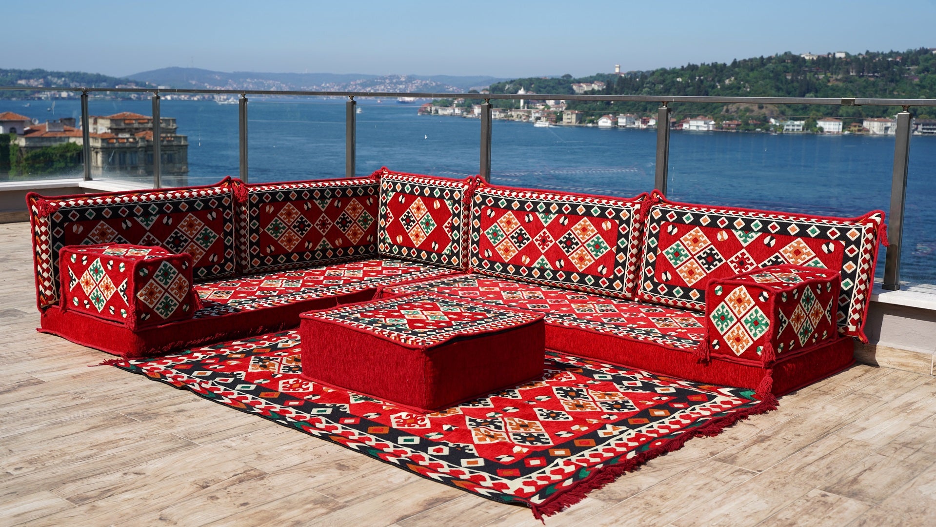 • Red Arabic Floor Couch, Modular Design Floor Cushion, 4" Thickness Floor Seating Set, Garden Sofa Set