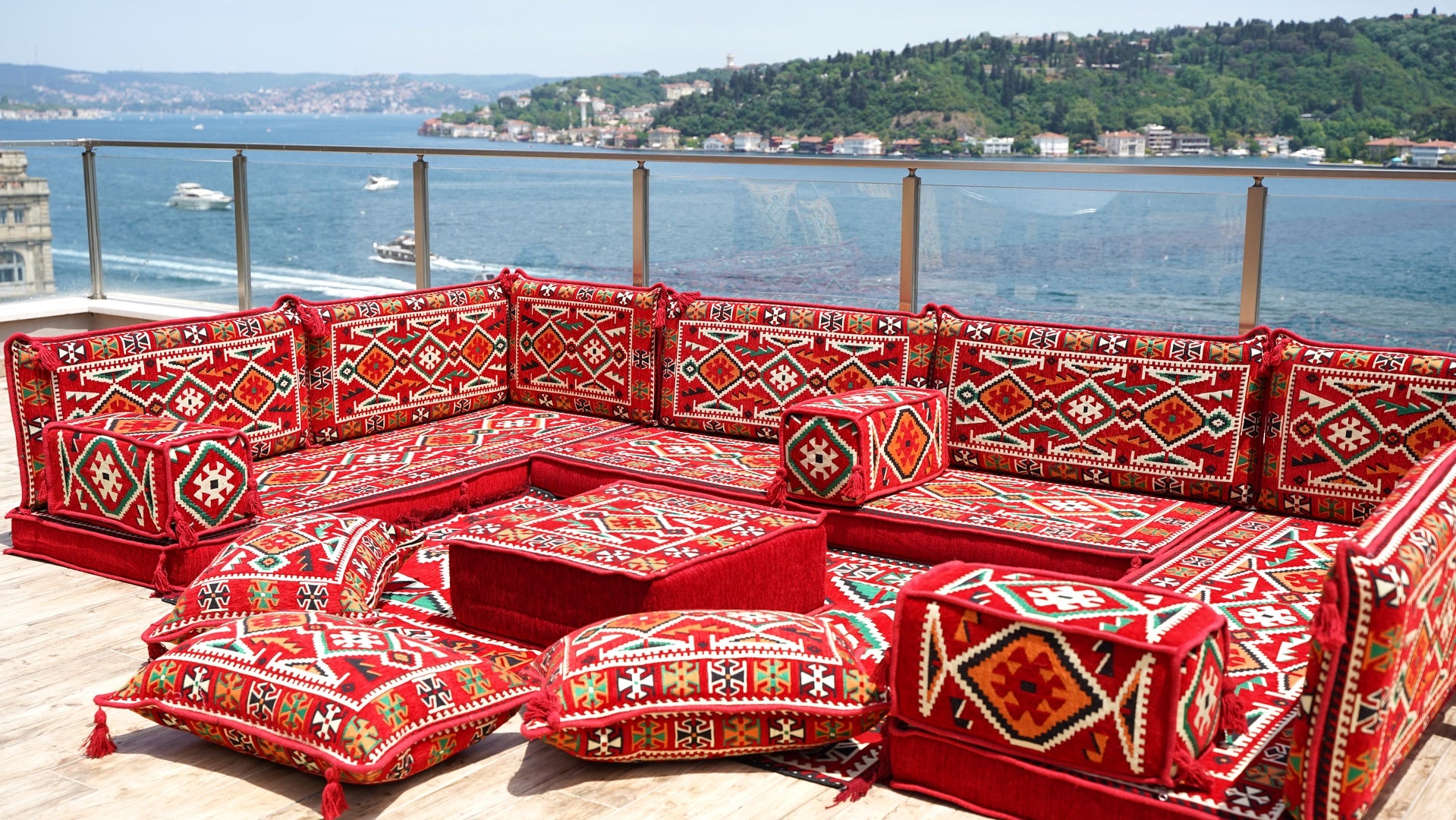 • Red Arabic Floor Sofa Cover, Sectional Sofa, U Shaped Pallet Cushion, Ethnic Pillow Set, Indoor Sofa Set