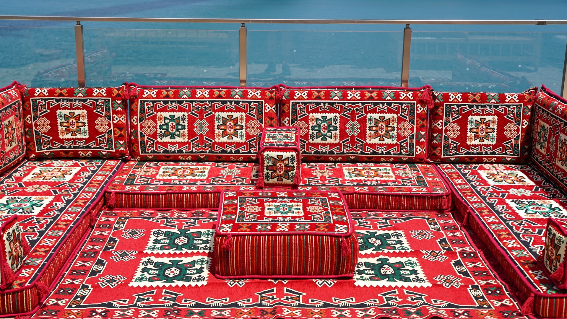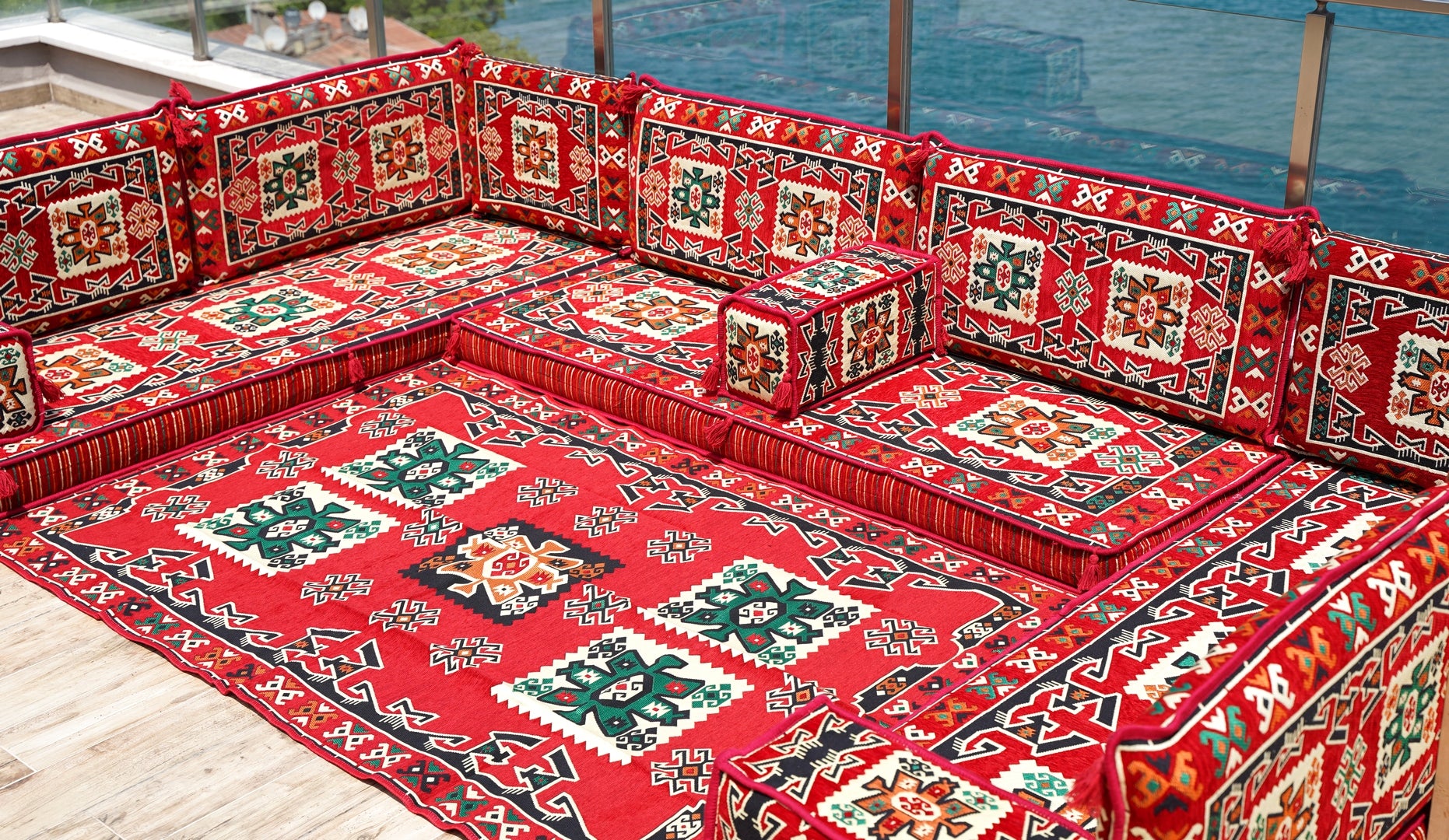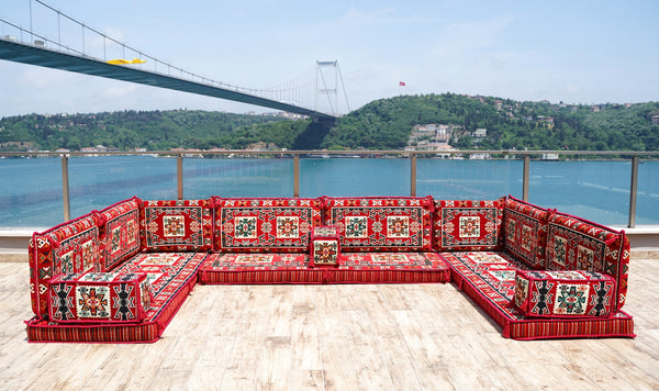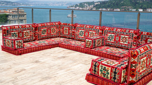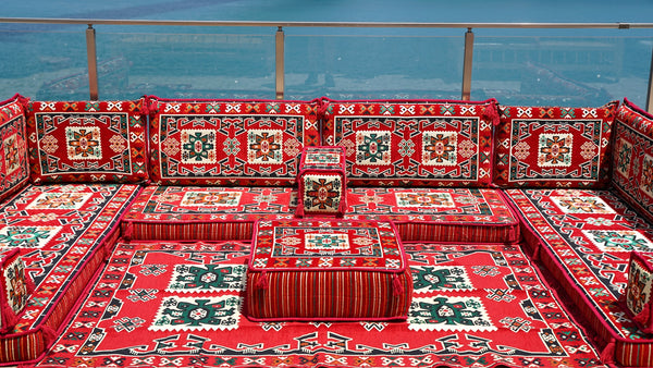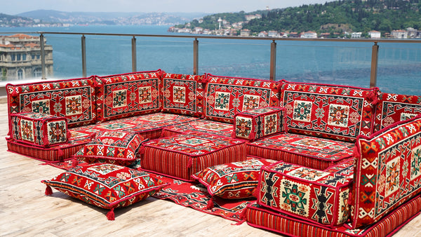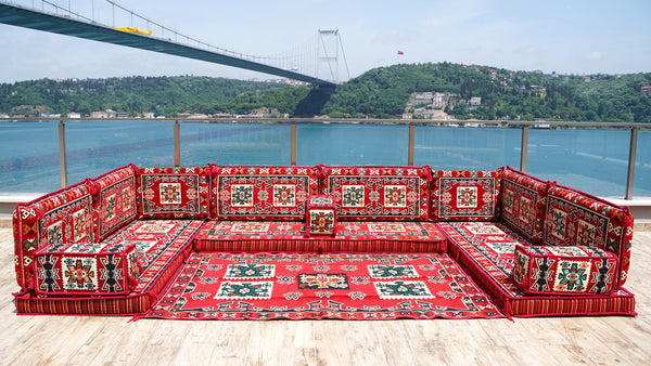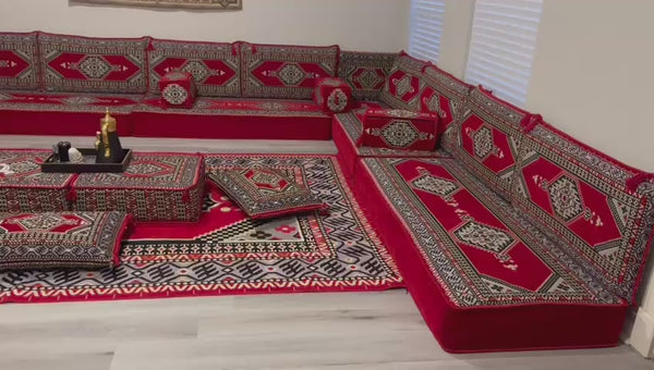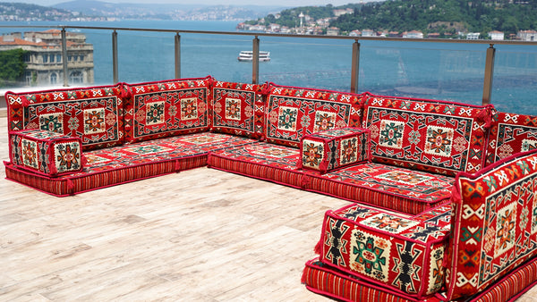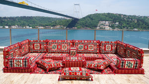 • Red Arabic Floor Sofa Cover, Sectional Sofa, U Shaped Pallet Cushion, Ethnic Pillow Set, Indoor Sofa Set, Garden Sofa Set
