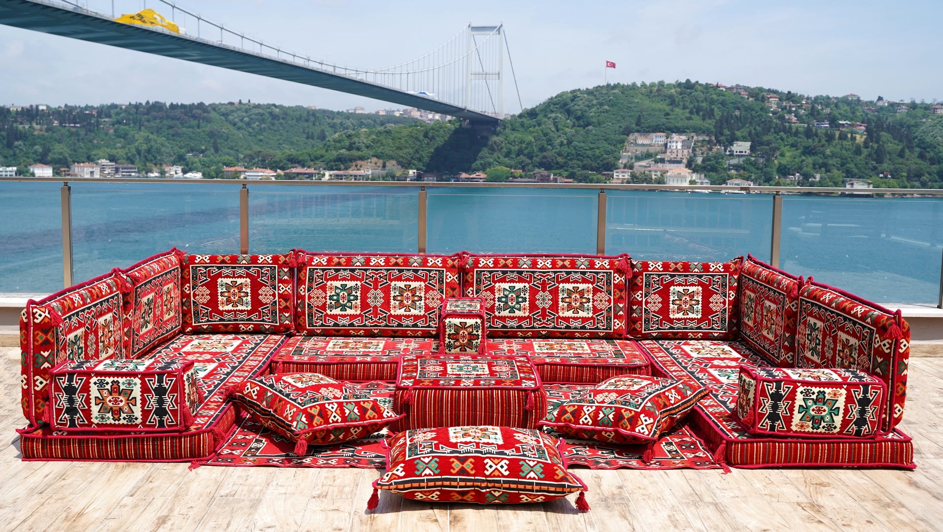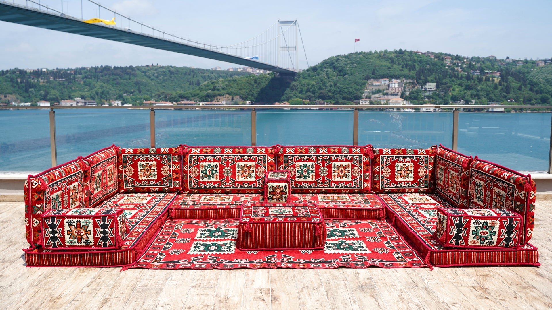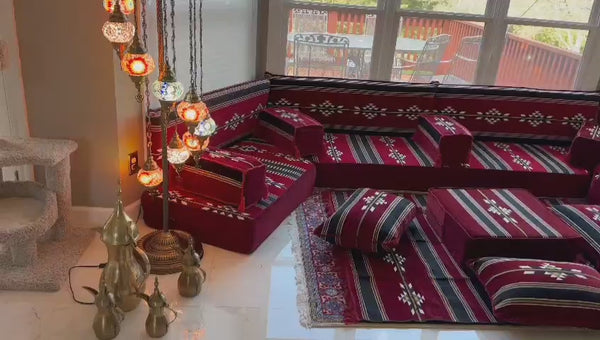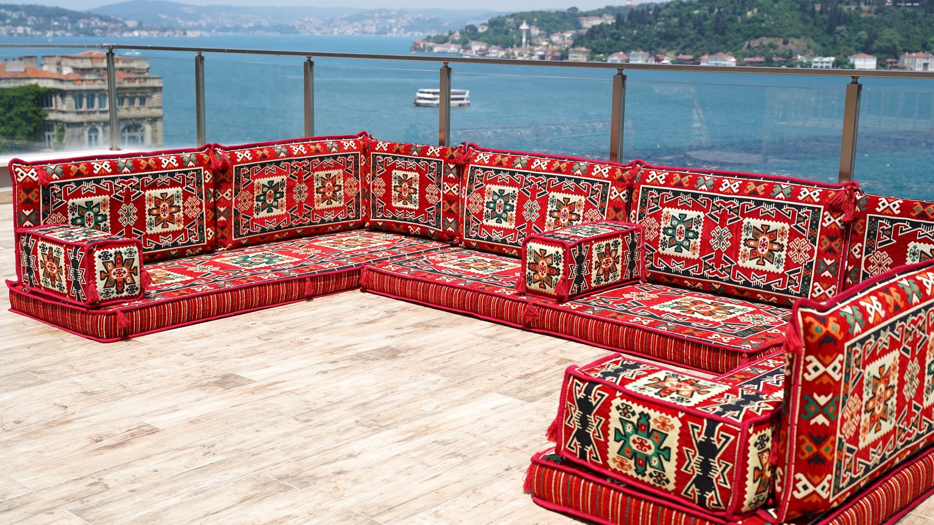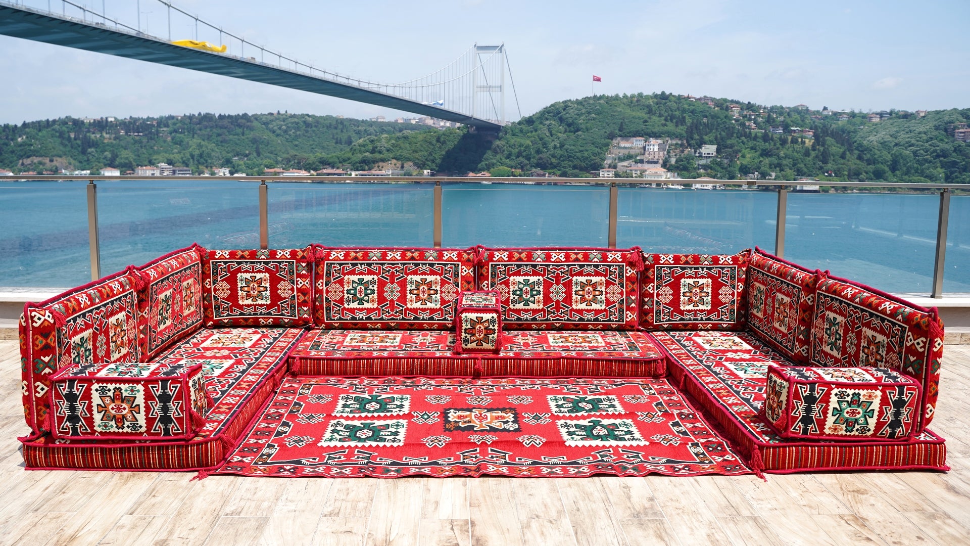 • Red Arabic Floor Sofa Cover, Sectional Sofa, U Shaped Pallet Cushion, Ethnic Pillow Set, Indoor Sofa Set, Garden Sofa Set