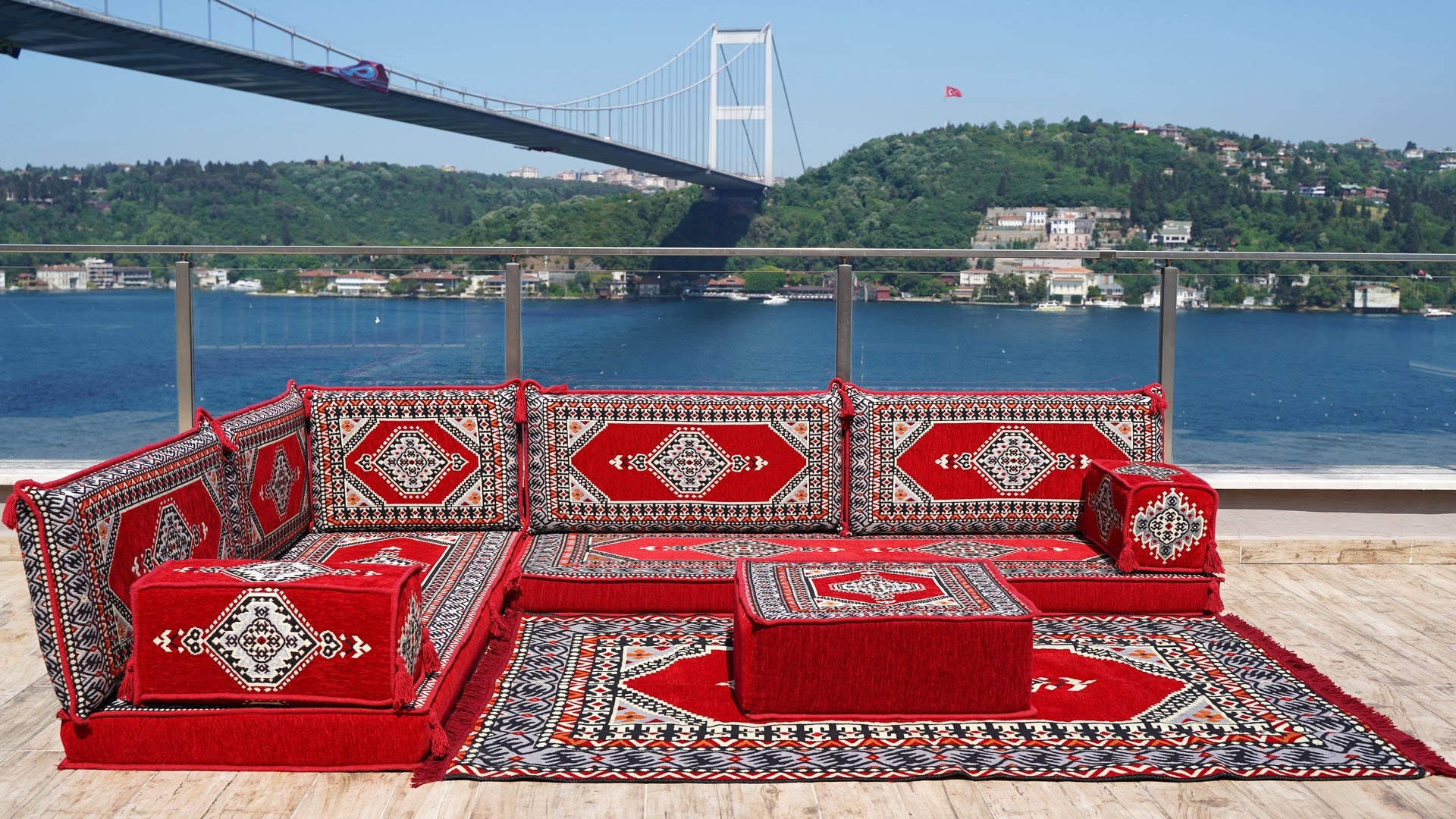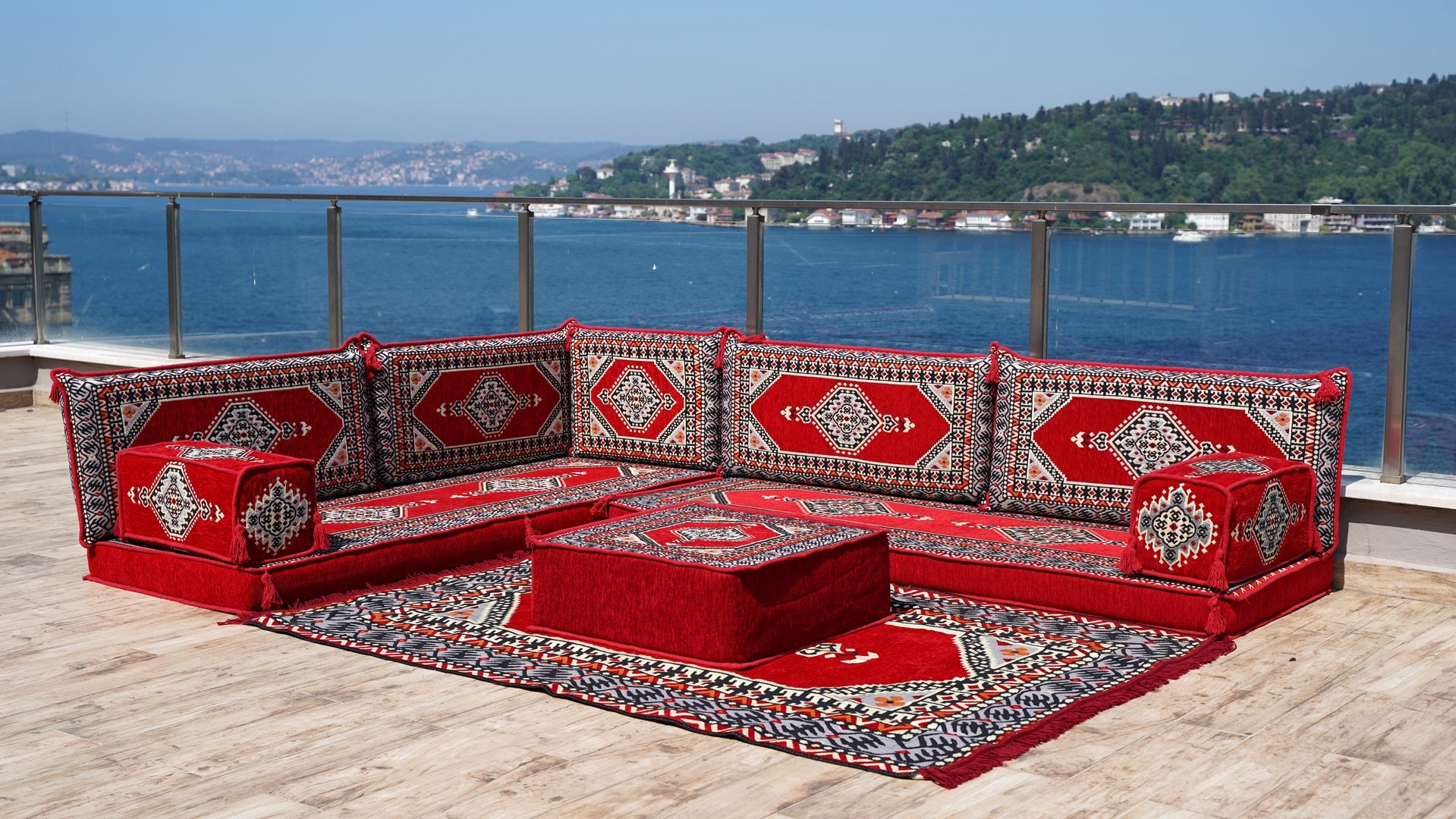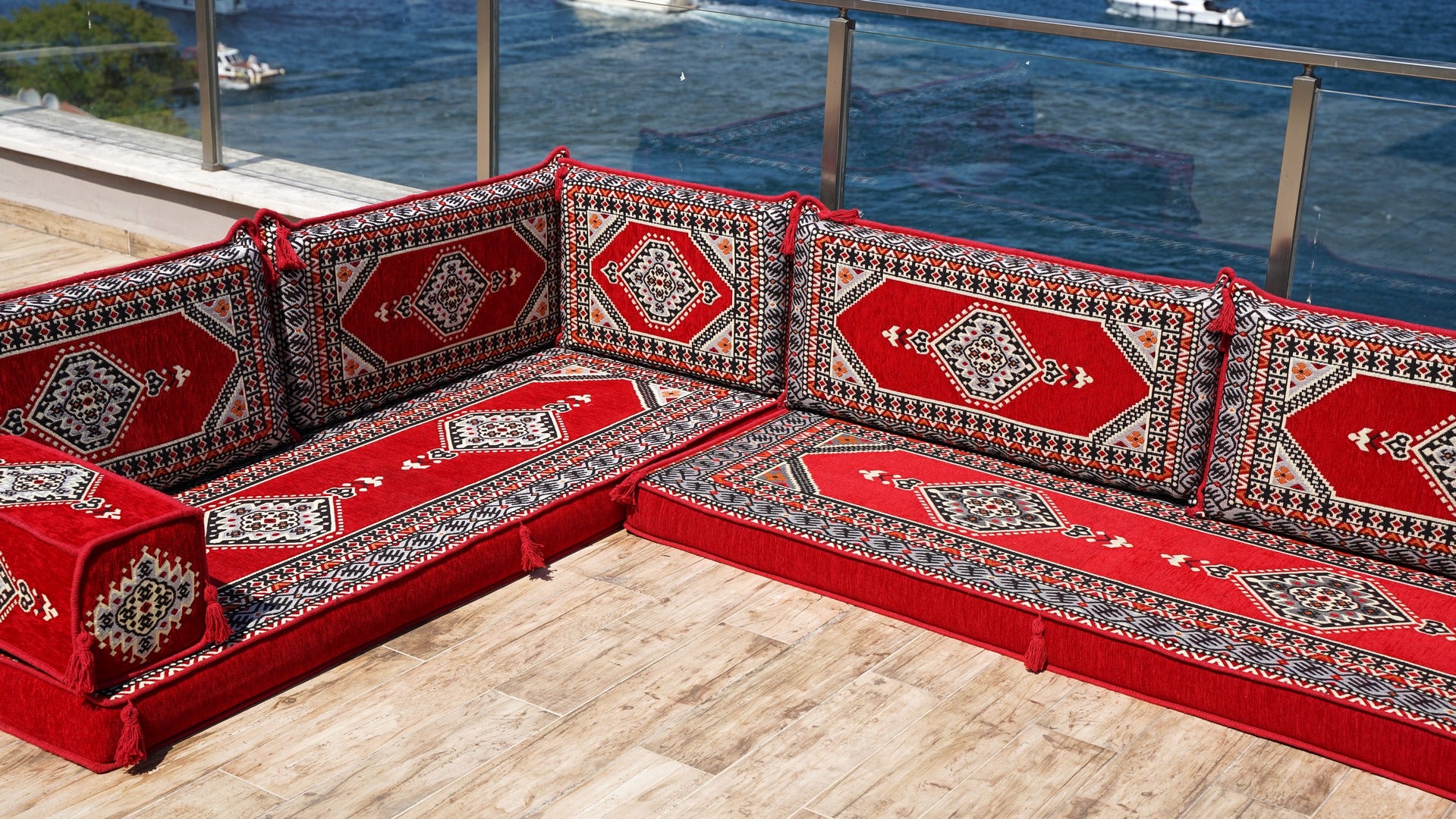 Red Color Floor Cushions, L Shaped Arabic Seating Sofas, Balcony Terrace Sofas, Washable Cushion Covers