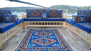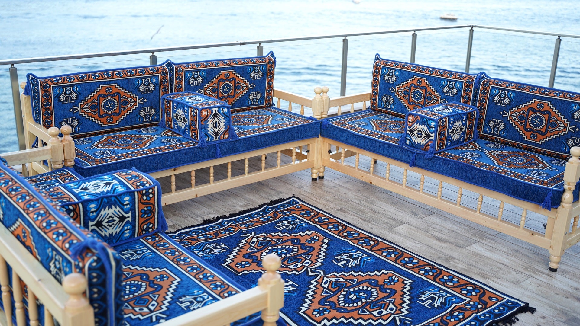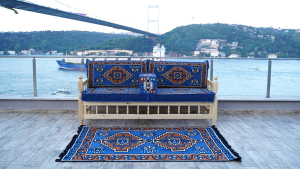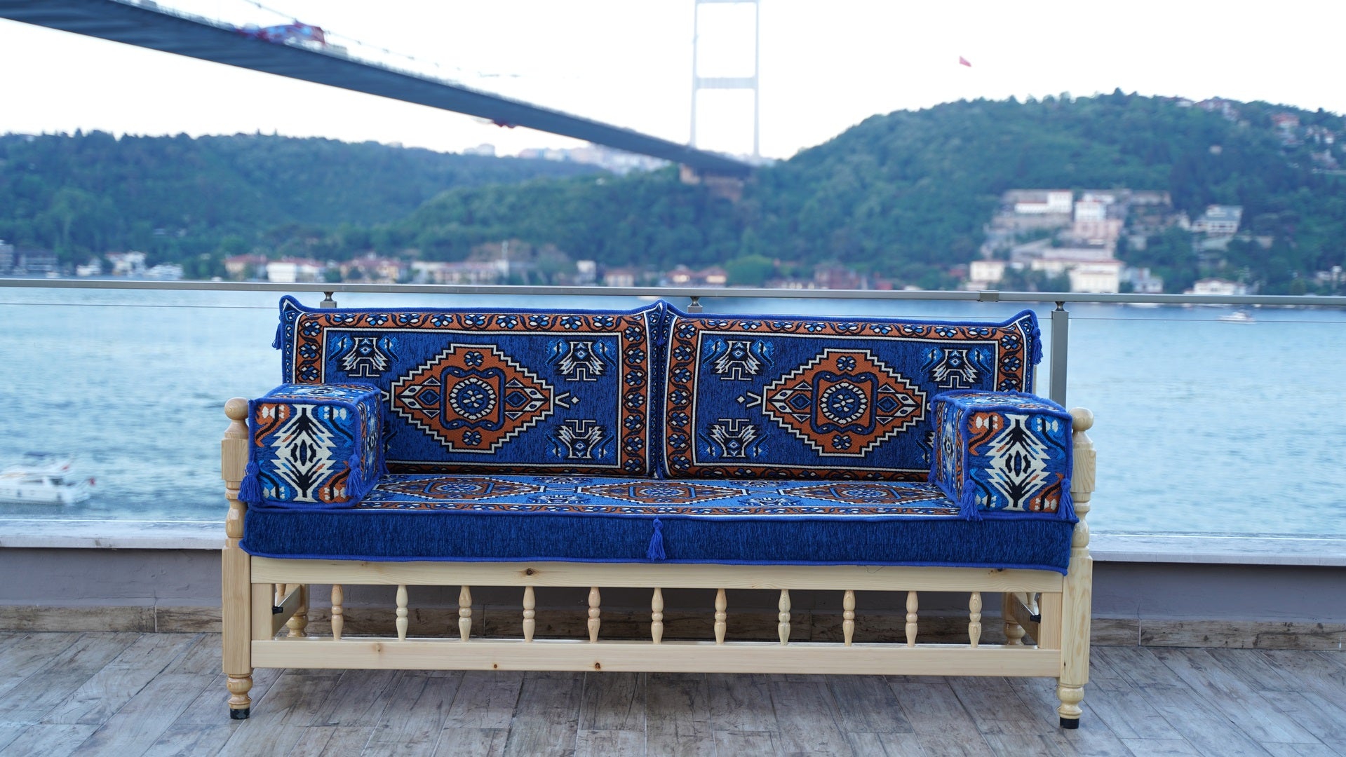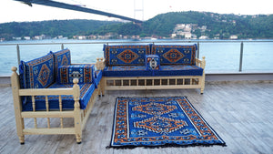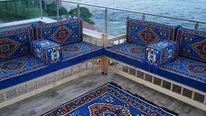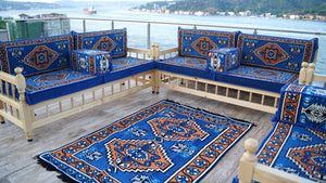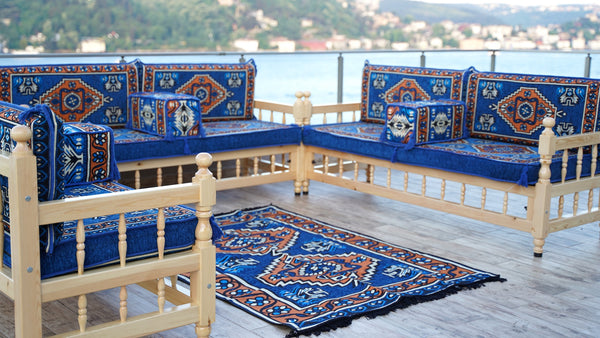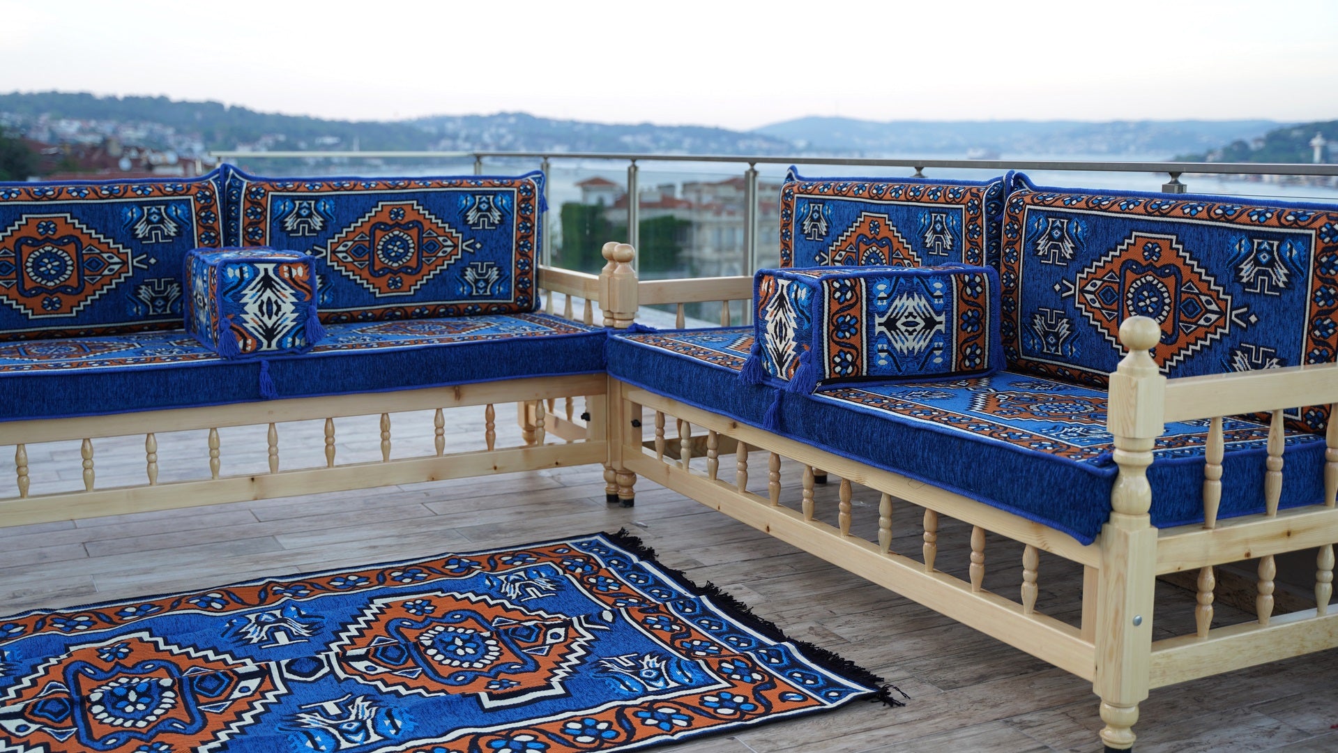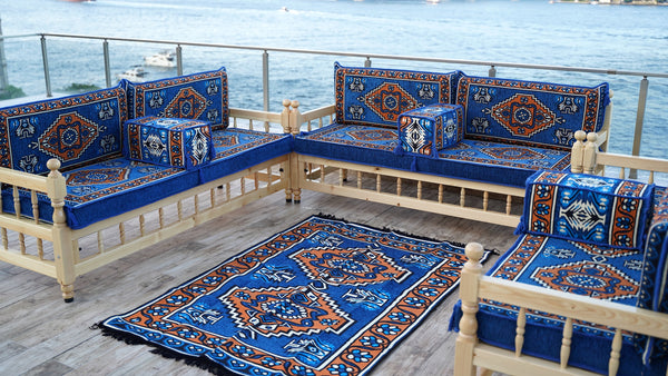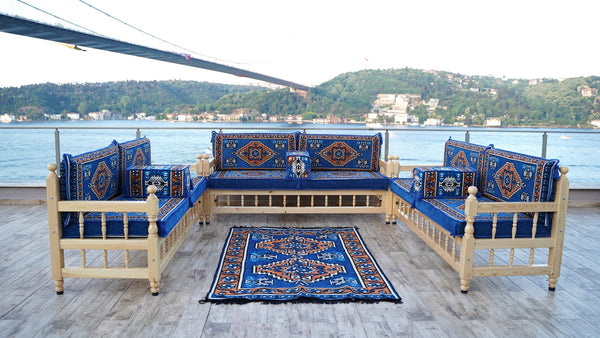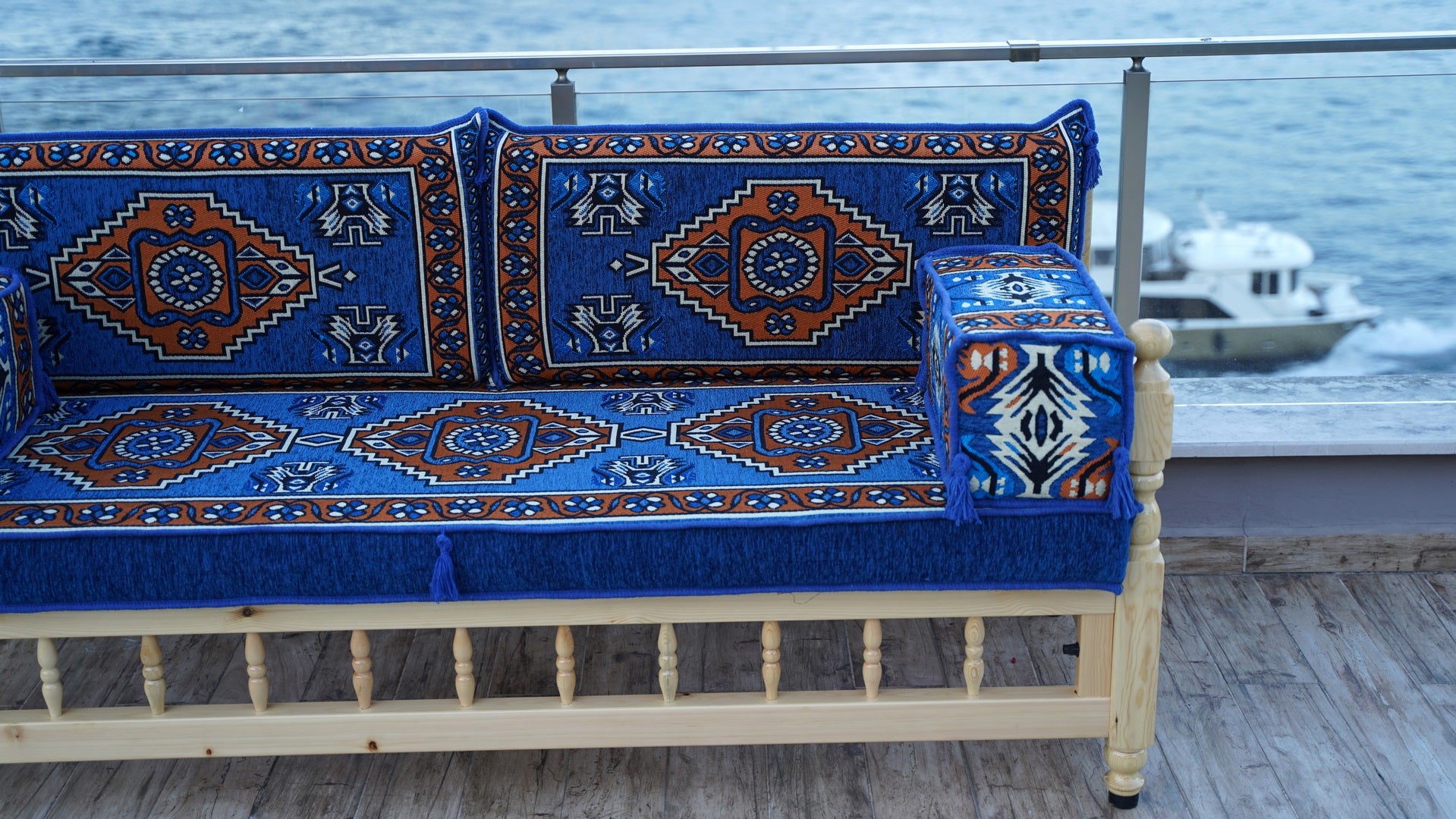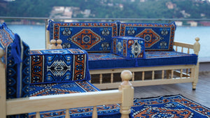 • Blue Arabic Corner Sofa Seating Set, Wooden Bench Sofa Sets, Outdoor Furniture, Moroccan Bench Cushion, Yemeni Majlis, Moroccan Sofas, Outdoor Bench