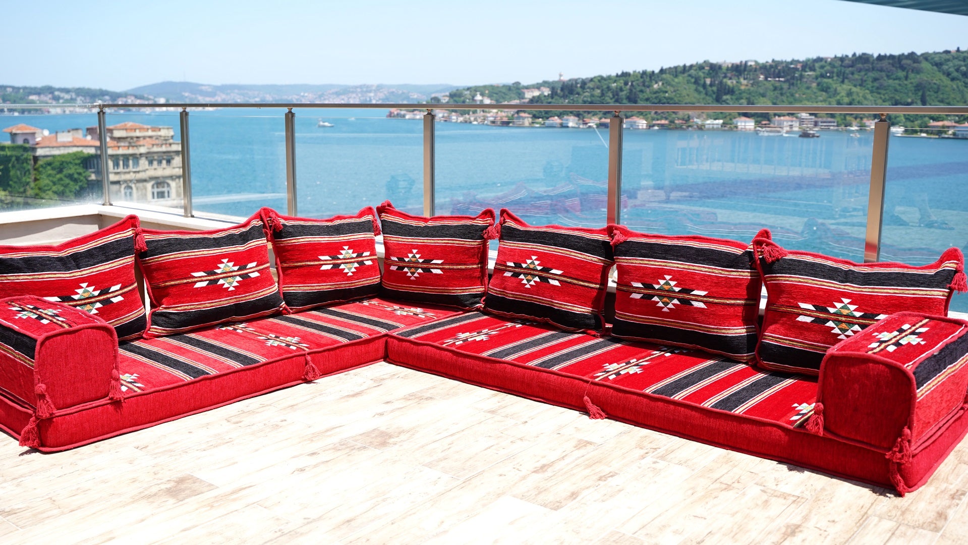 Red Floor Cushions, Floor Sofa Seating Set, L Shape Corner Arabic Sofa Set, Oriental Floor Seating, Living Room Sofa