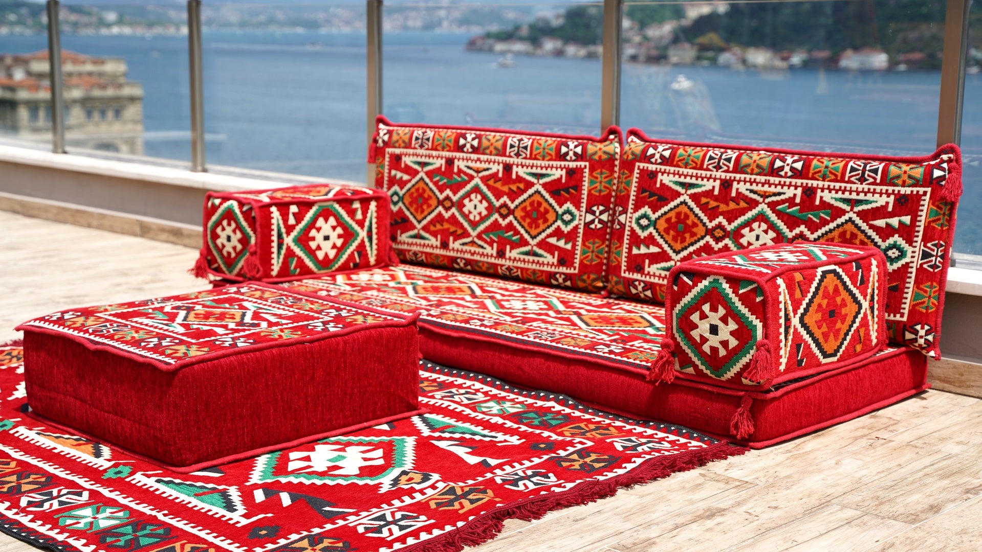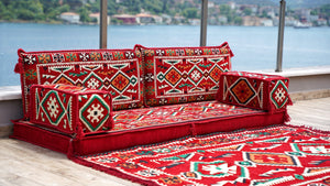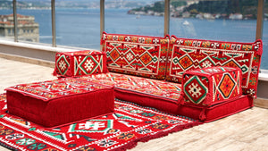 • Red Patio Furniture, Living Room Floor Cushion, Arabic Floor Couch, Turkish Floor Cushion, Ethnic Sofa with Ottoman Couch and Rug