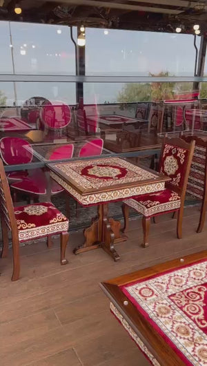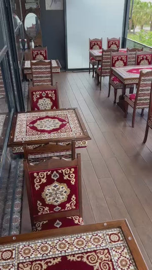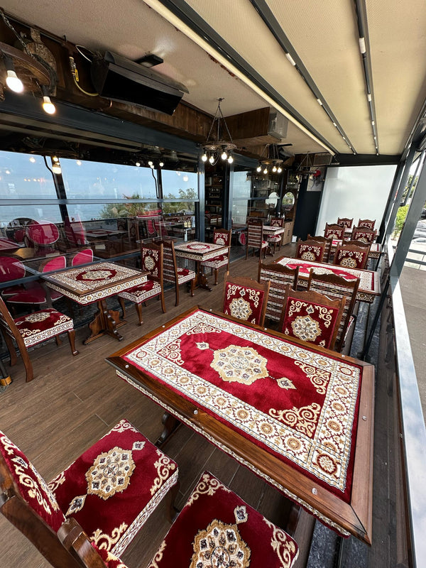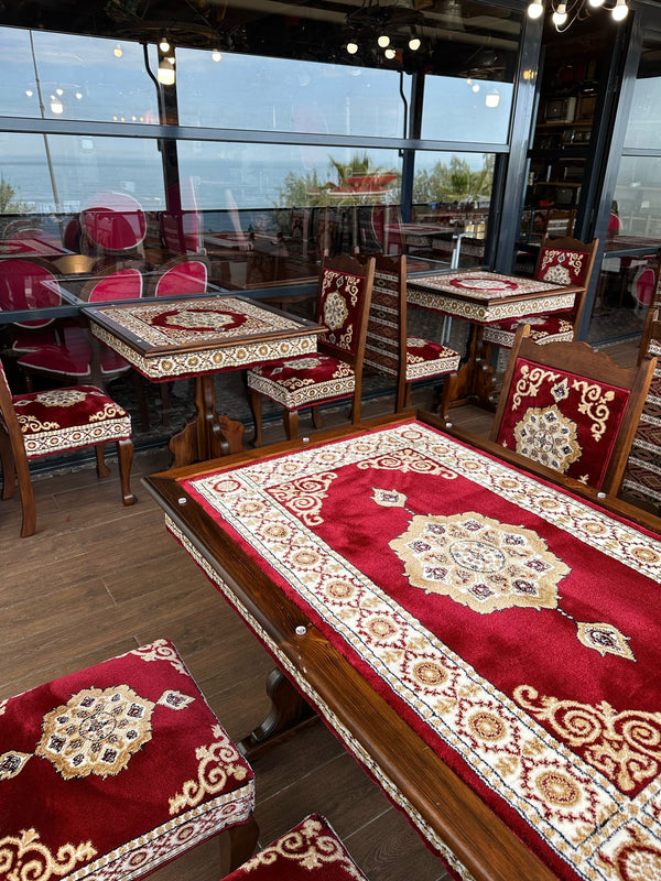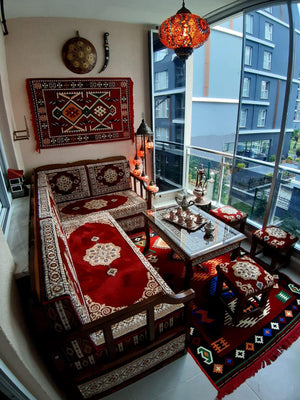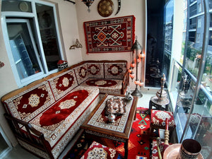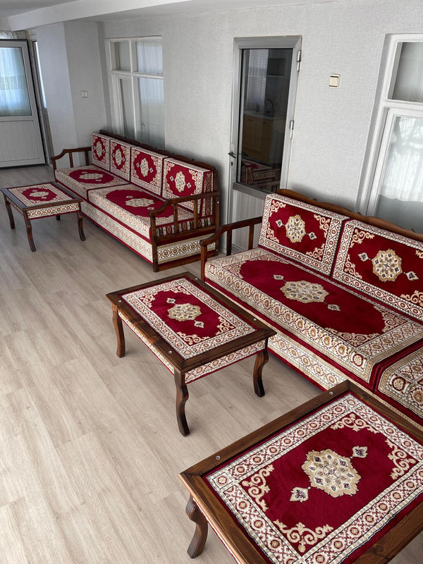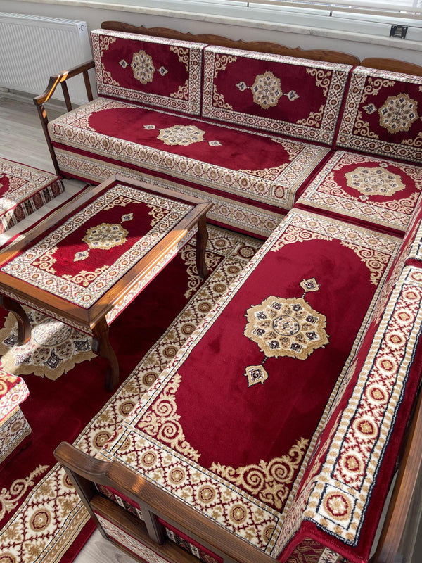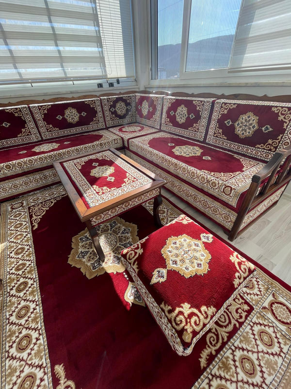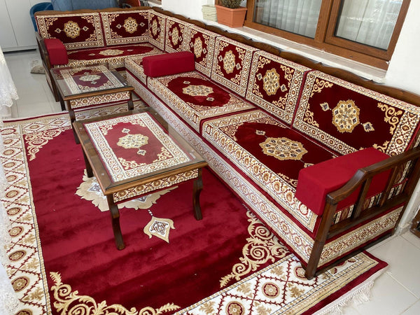 Red Turkish Rug Carpet Wooden Bench Sofa, Arabic Majlis, Arabic Jalsa, Wooden Bench for Restaurant and Cafés, Arabic Furniture