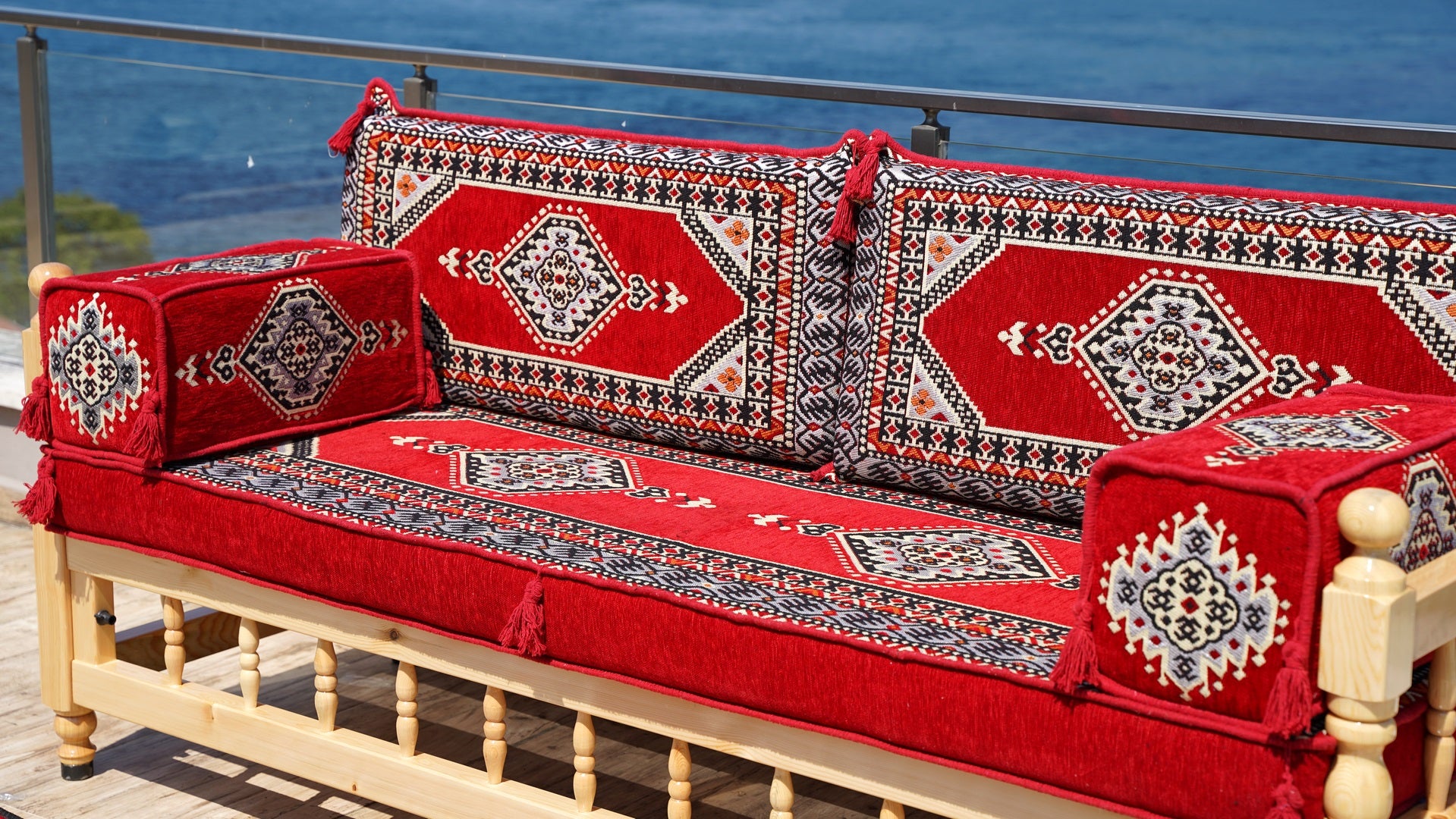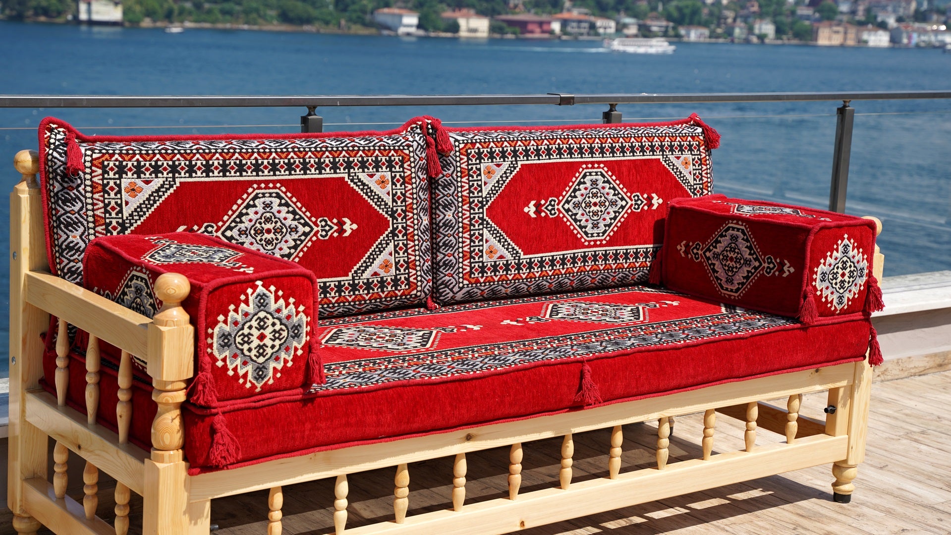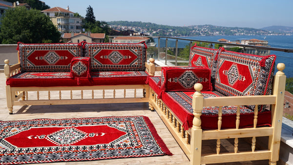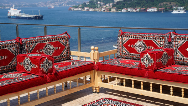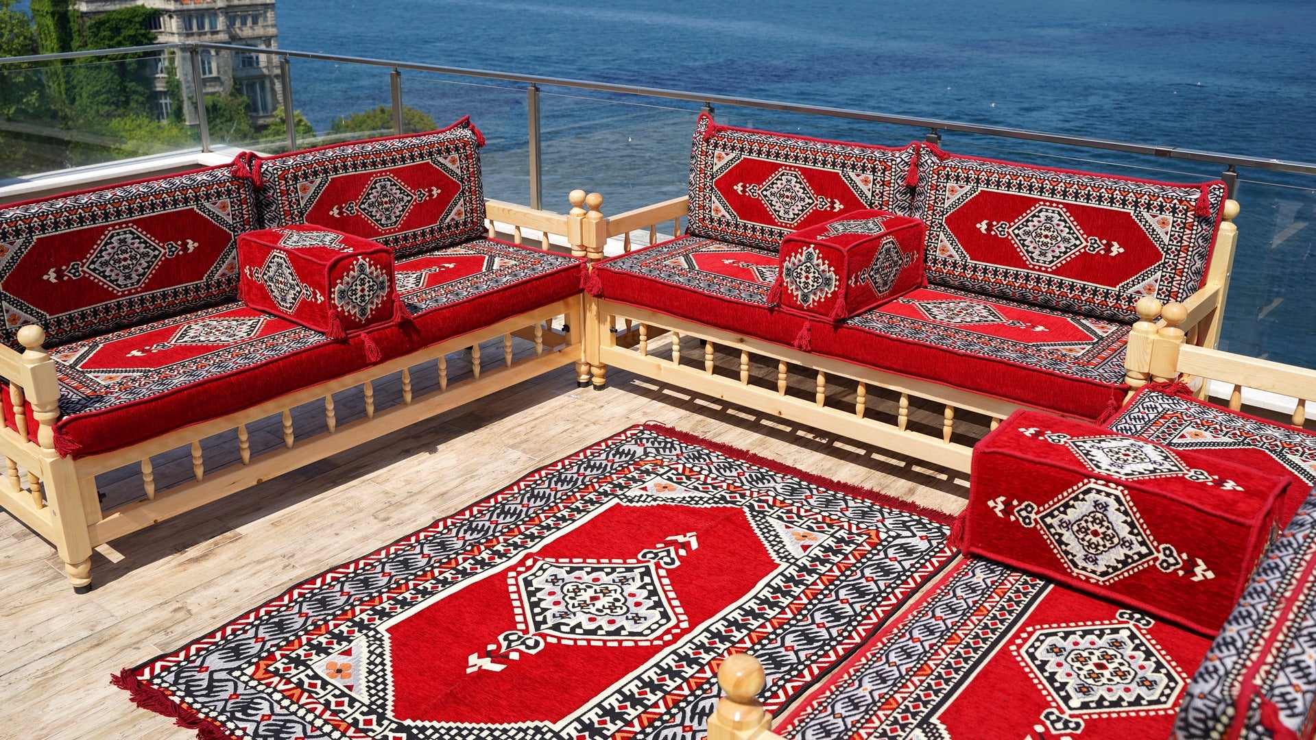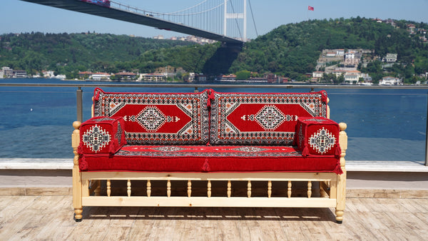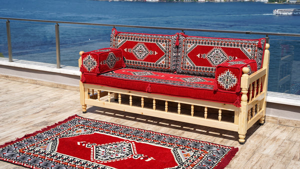 • Turkish Patio Sofas, Wooden Bench Sofa Sets, Outdoor Furniture, Yemeni Majlis, Bohemian Furniture, Arabic Seating Jalsah, Traditional Wooden Bench