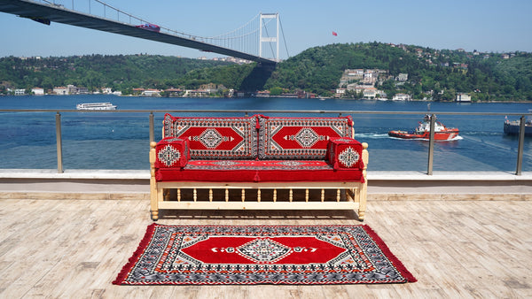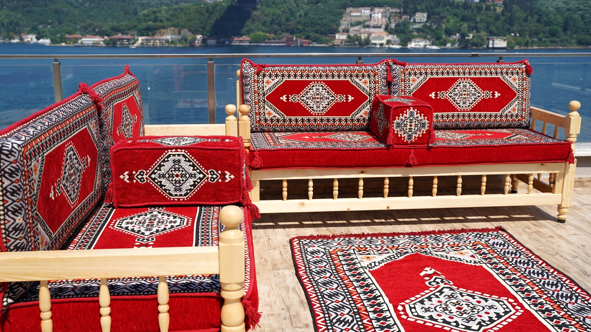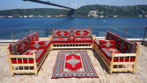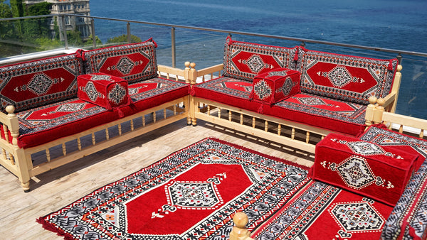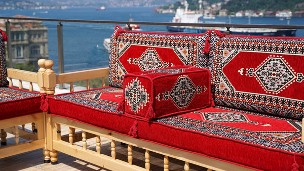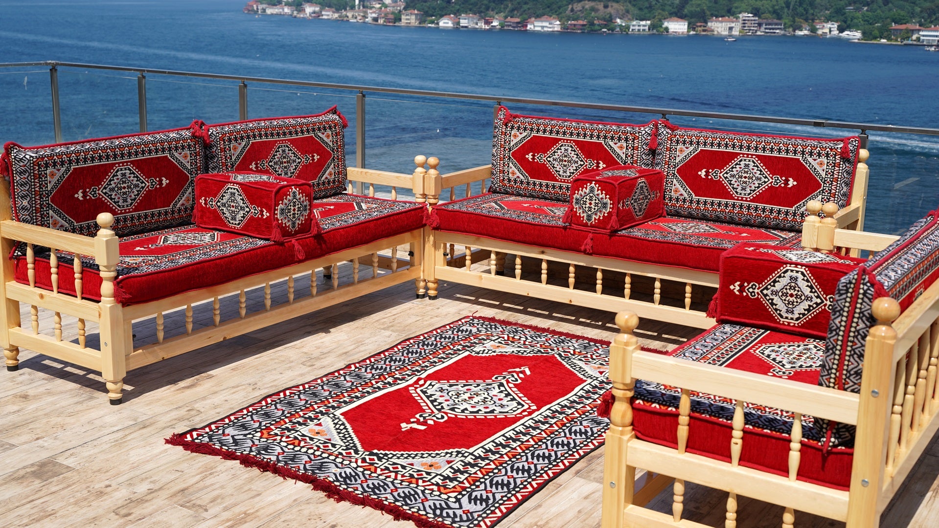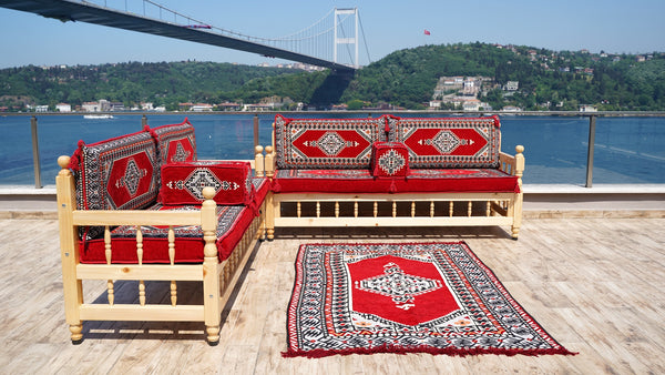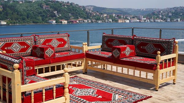 • Turkish Patio Sofas, Wooden Bench Sofa Sets, Outdoor Furniture, Yemeni Majlis, Bohemian Furniture, Arabic Seating Jalsah, Traditional Wooden Bench