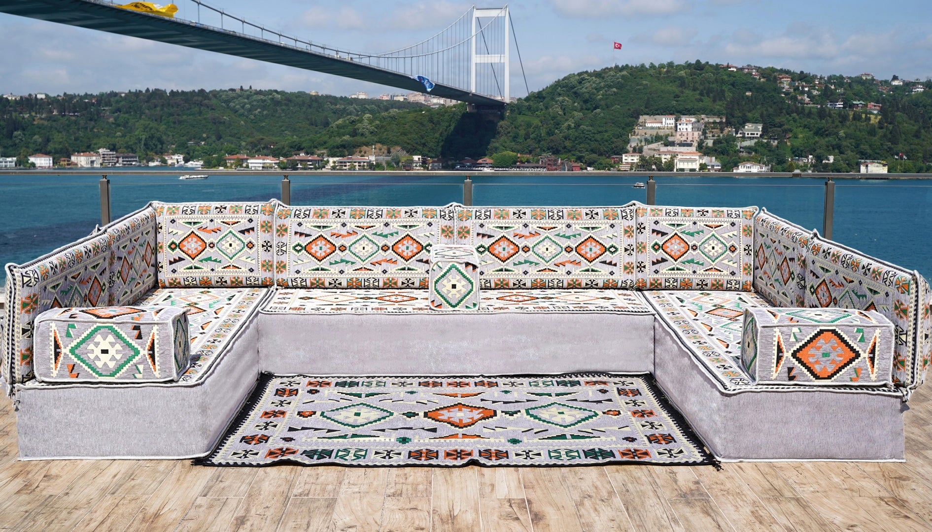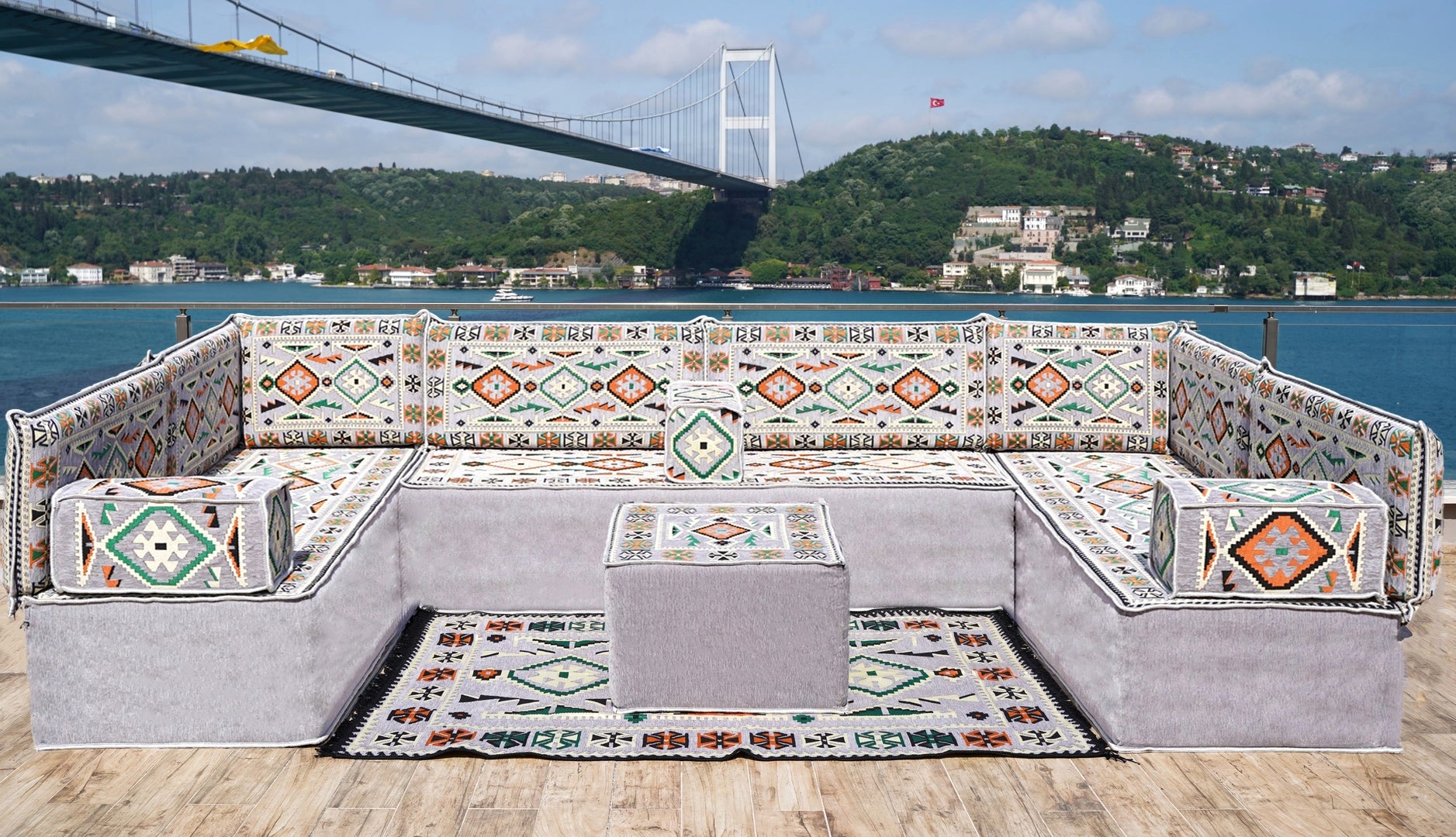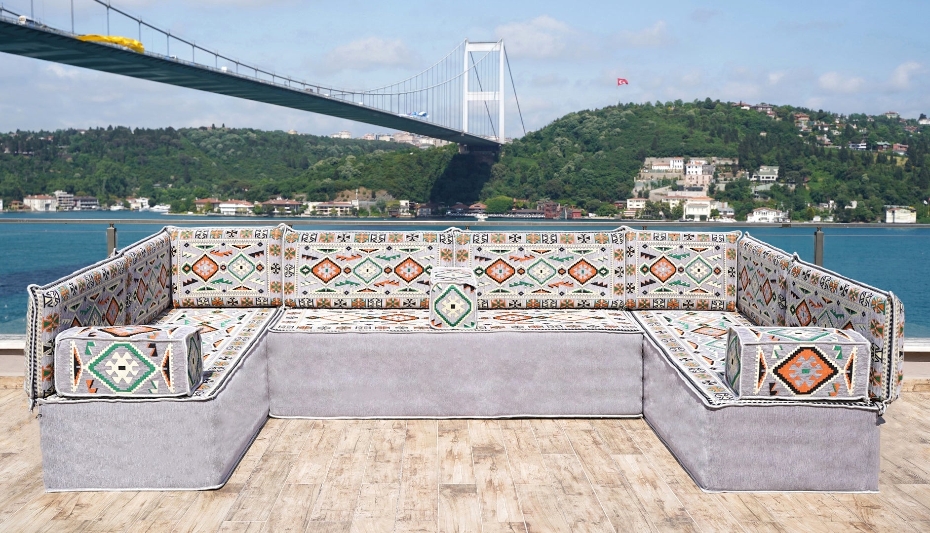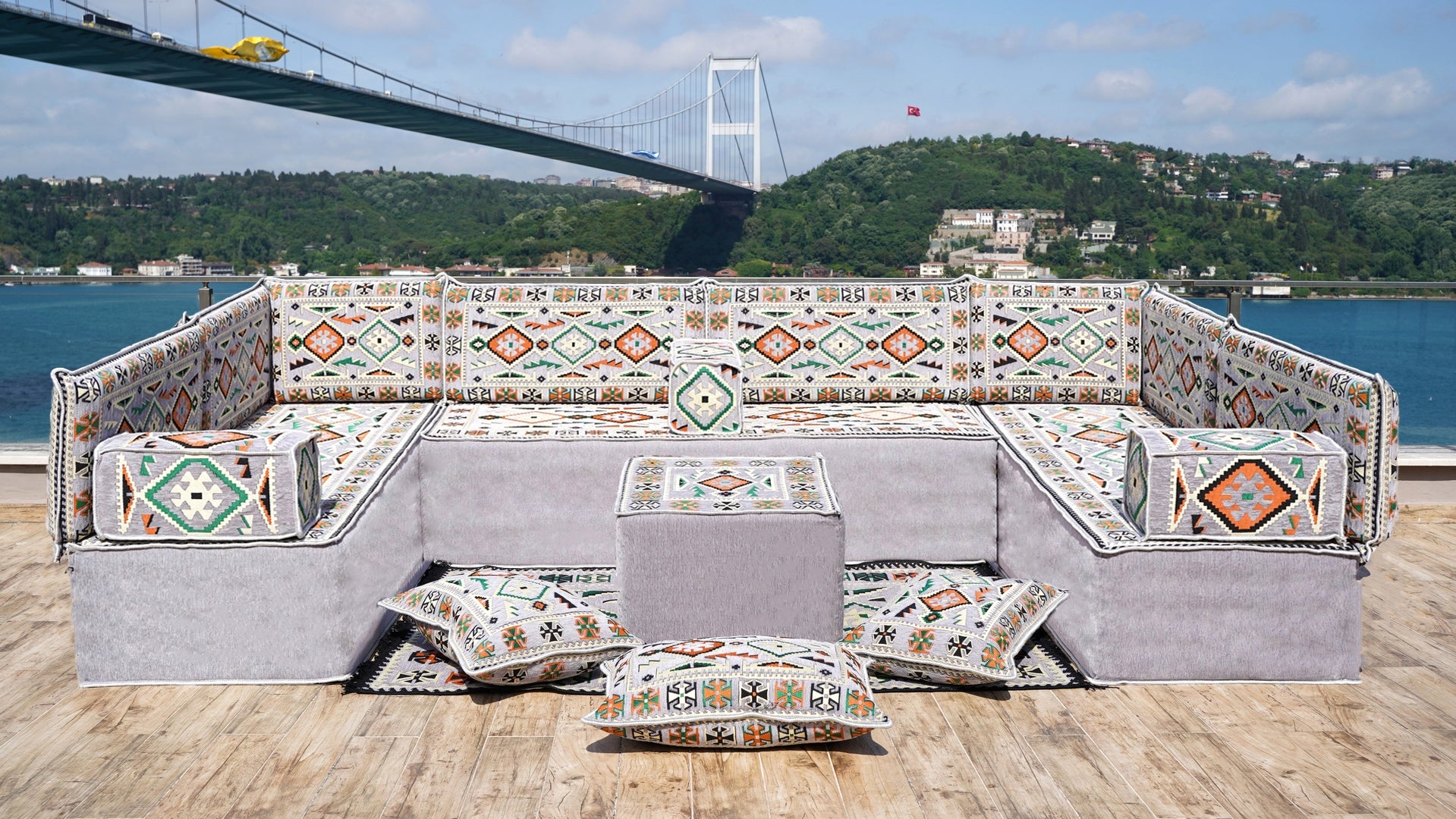 • U Shaped Arabic Floor Sofa Set, Gray Floor Cushions, Balcony Patio Sofas, Pallet Sofa, Ethnic Sofa, Moroccan Sofas