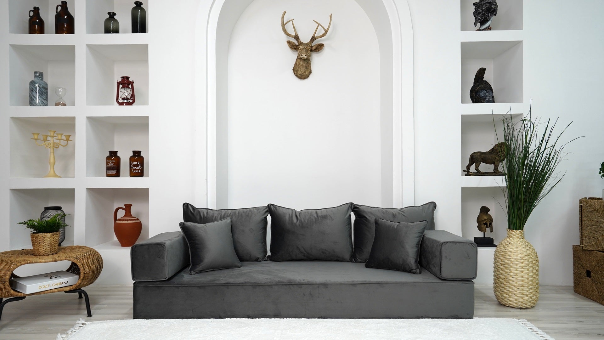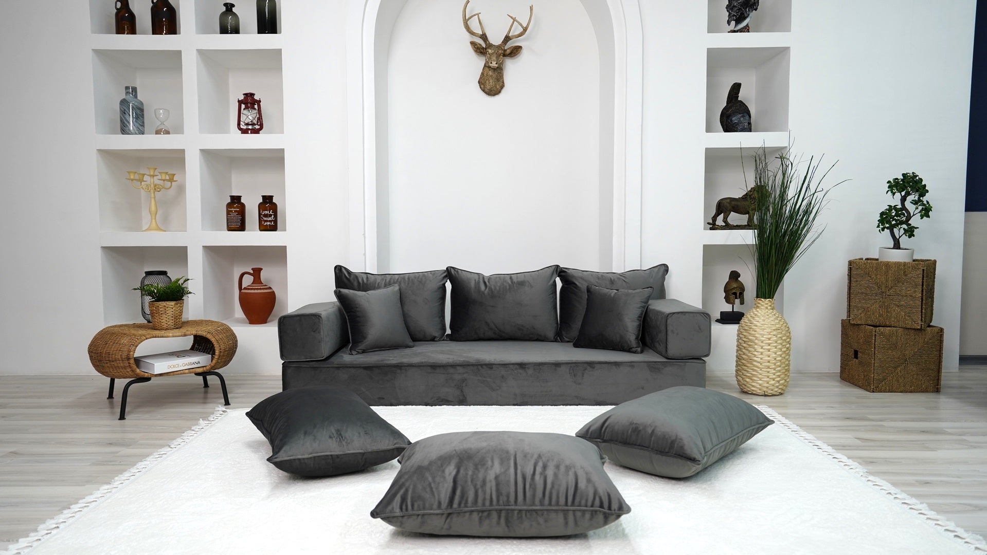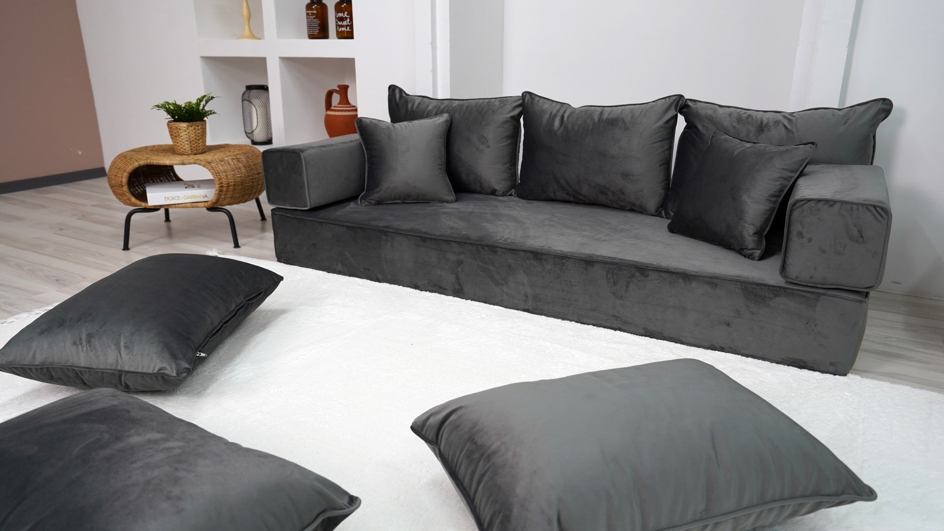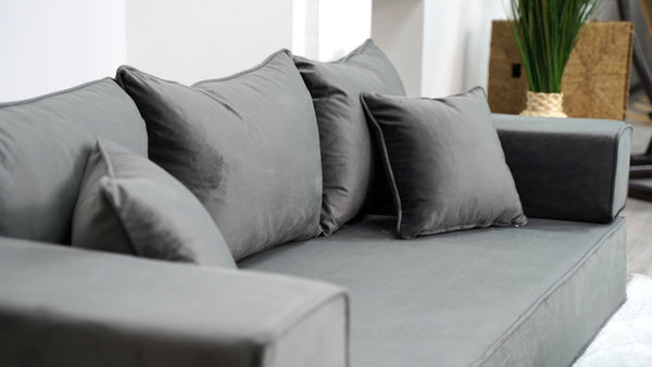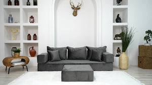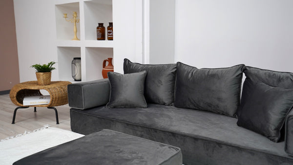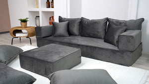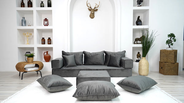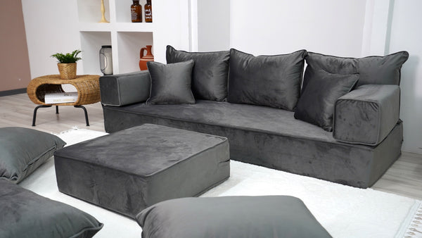 • Velvet Dark Gray Color Floor Couch with Ottoman Couch and Rug, Loveseat Sofas, French Cushion, Modern Livingroom Sofa, Window Seat, Floor Couch - Arabic Sofa