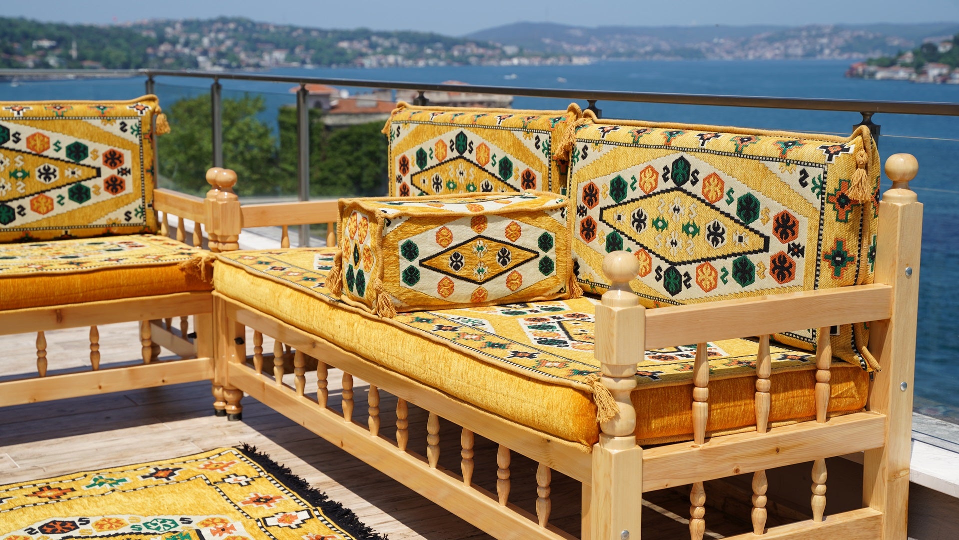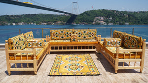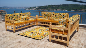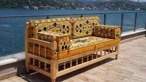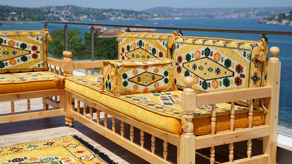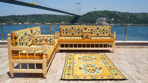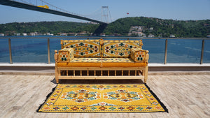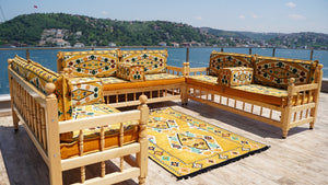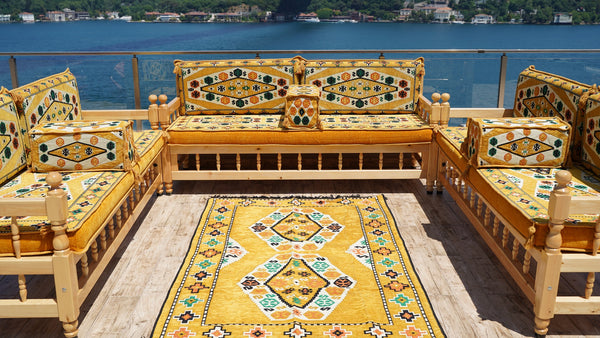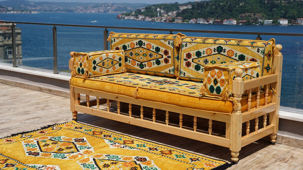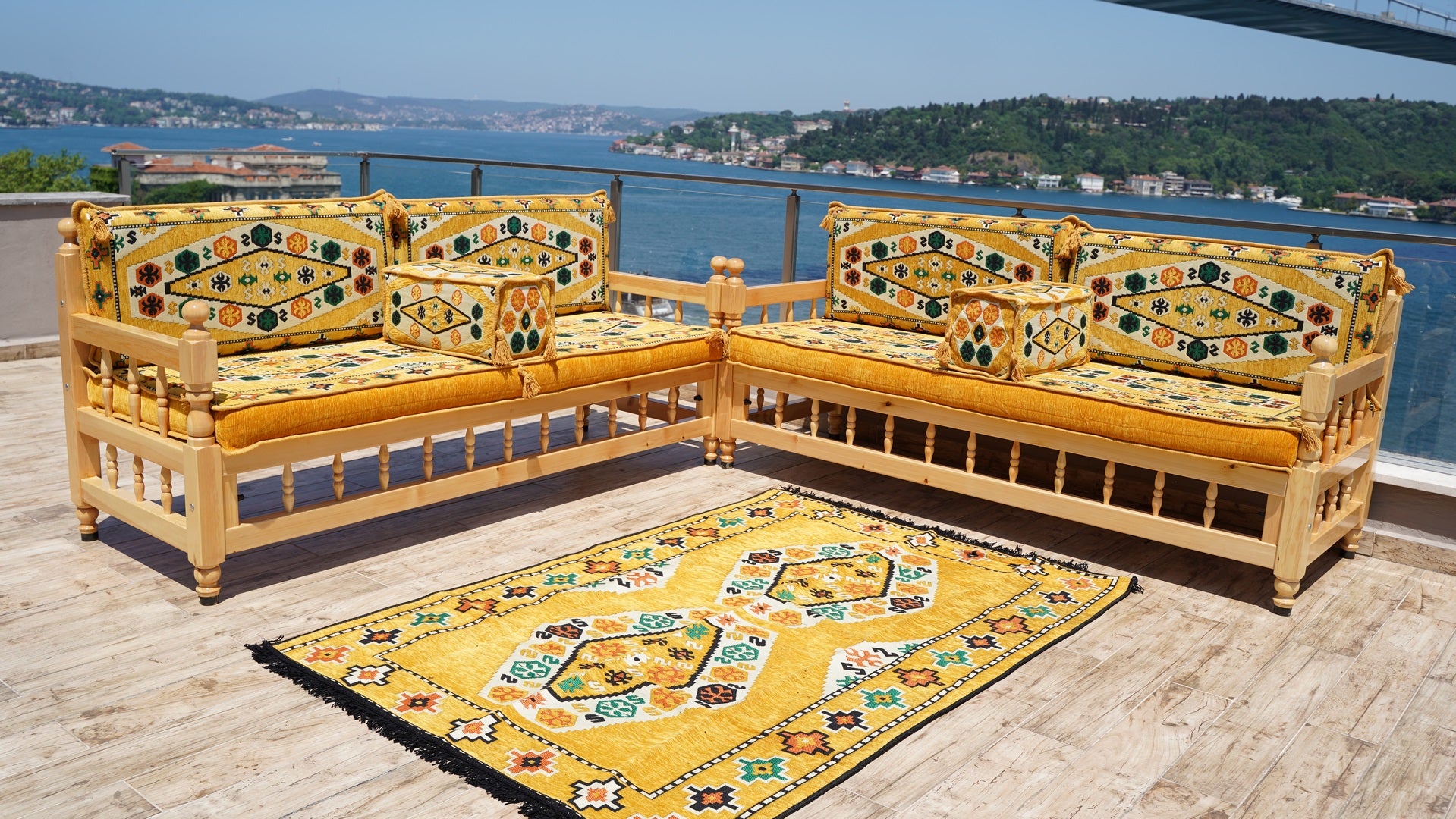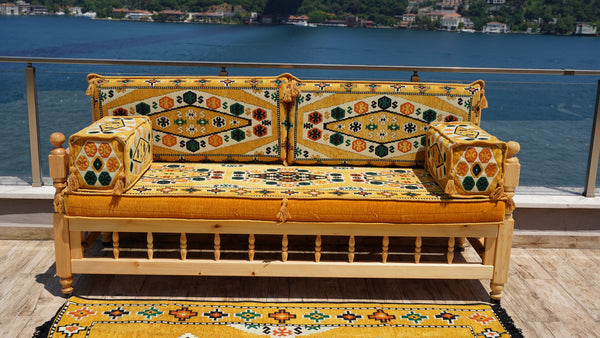 • Yellow Wooden Bench Sofa Sets, Arabic Jalsah Set, Garden Sofa Set, Bench Pillows, Yemeni Majlis, Arabic Floor Seating Cushion, Pine Tree Wooden Bench, Arabic Furniture