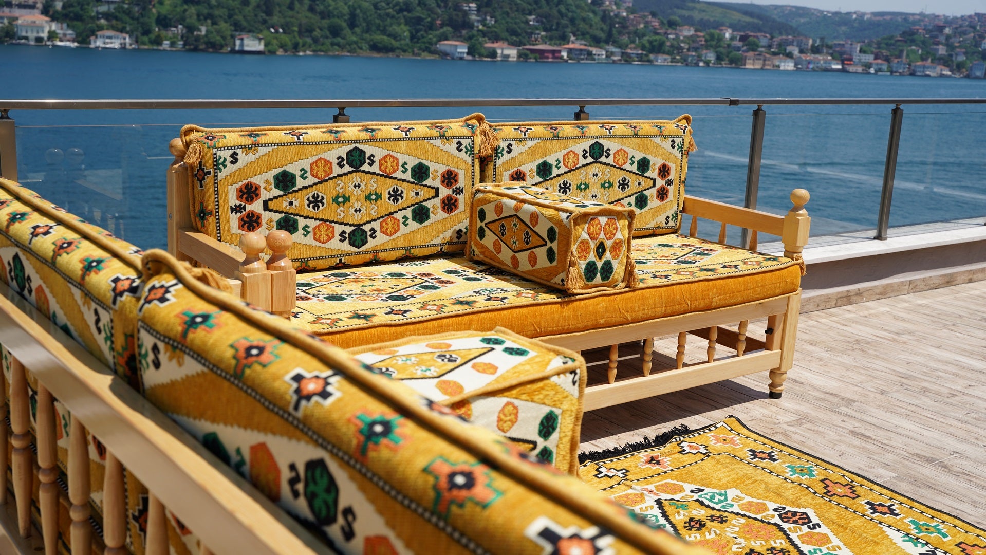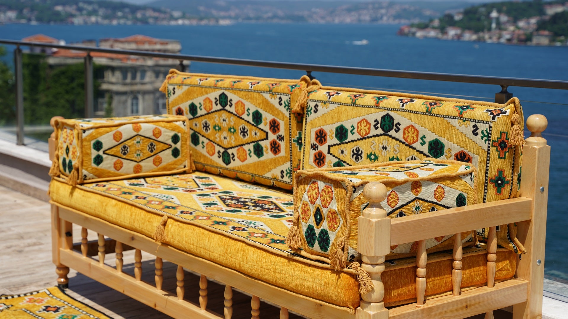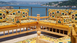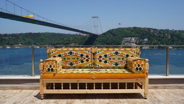 • Yellow Wooden Bench Sofa Sets, Arabic Jalsah Set, Garden Sofa Set, Bench Pillows, Yemeni Majlis, Arabic Floor Seating Cushion, Pine Tree Wooden Bench, Arabic Furniture