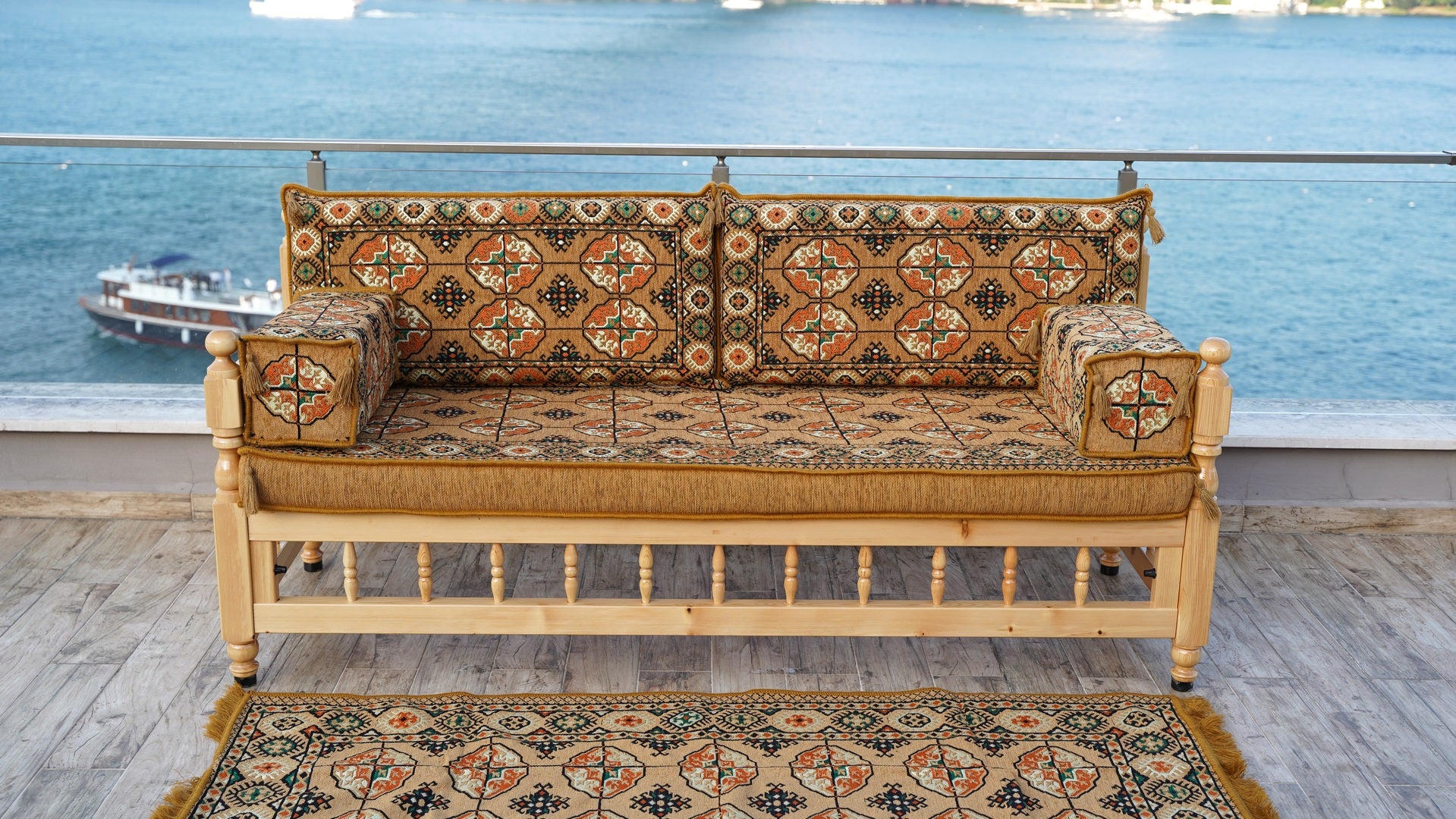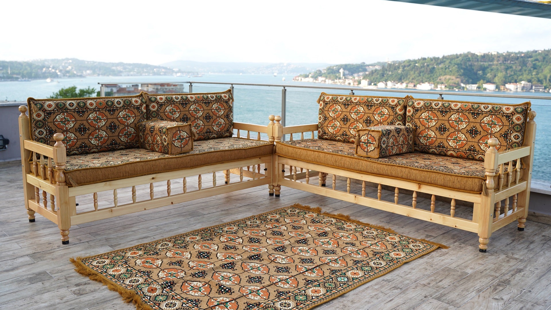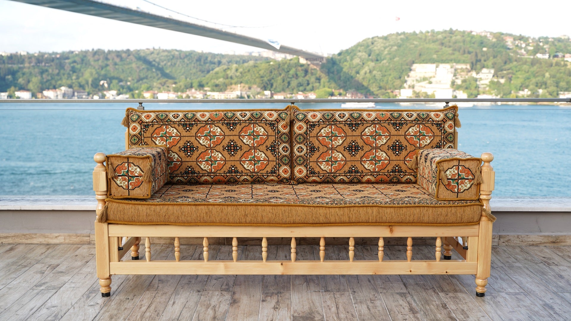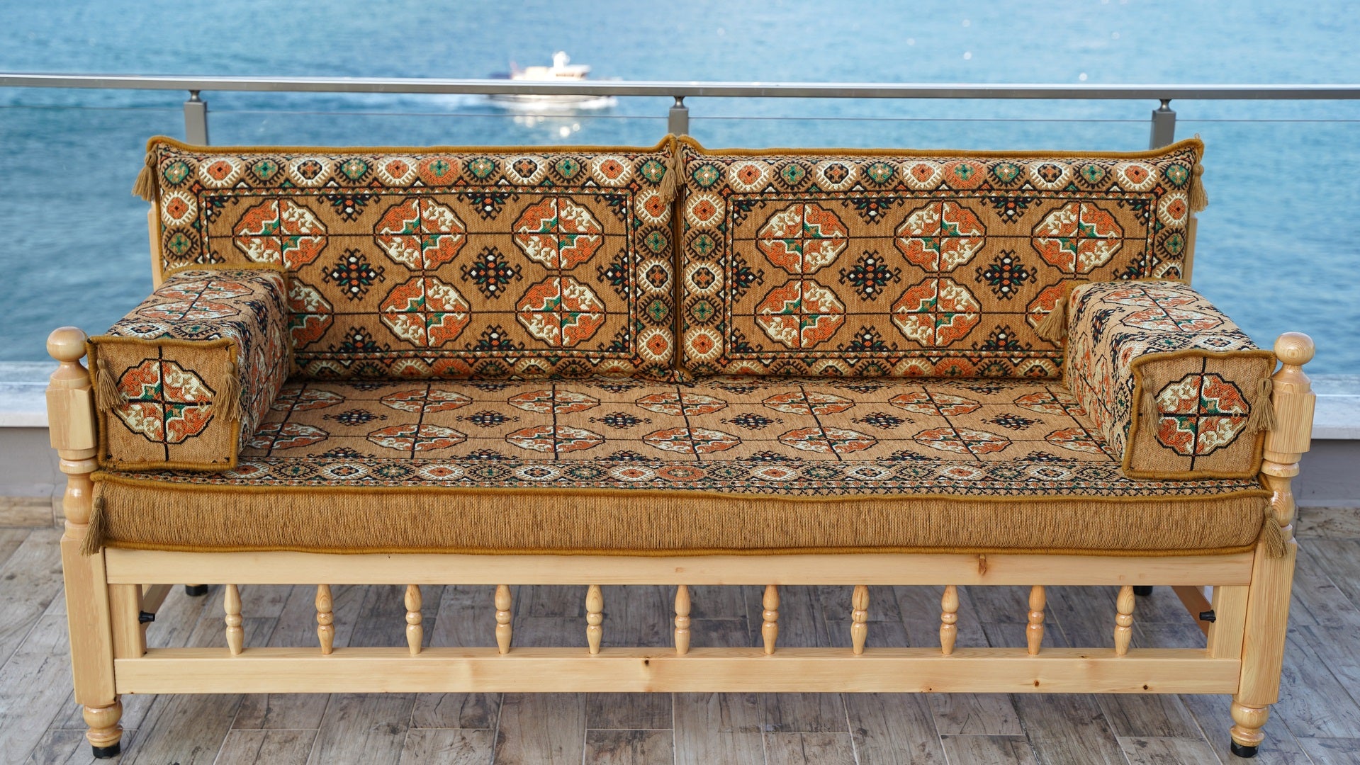• Gold Wooden Bench Sofa Sets, Yemeni Majlis, Bohemian Furniture, Outdoor Bench, Floor Cushions Set, Turkish Rug As Gift, Bench Pillow, Outdoor Furniture, Corner Sofa Set