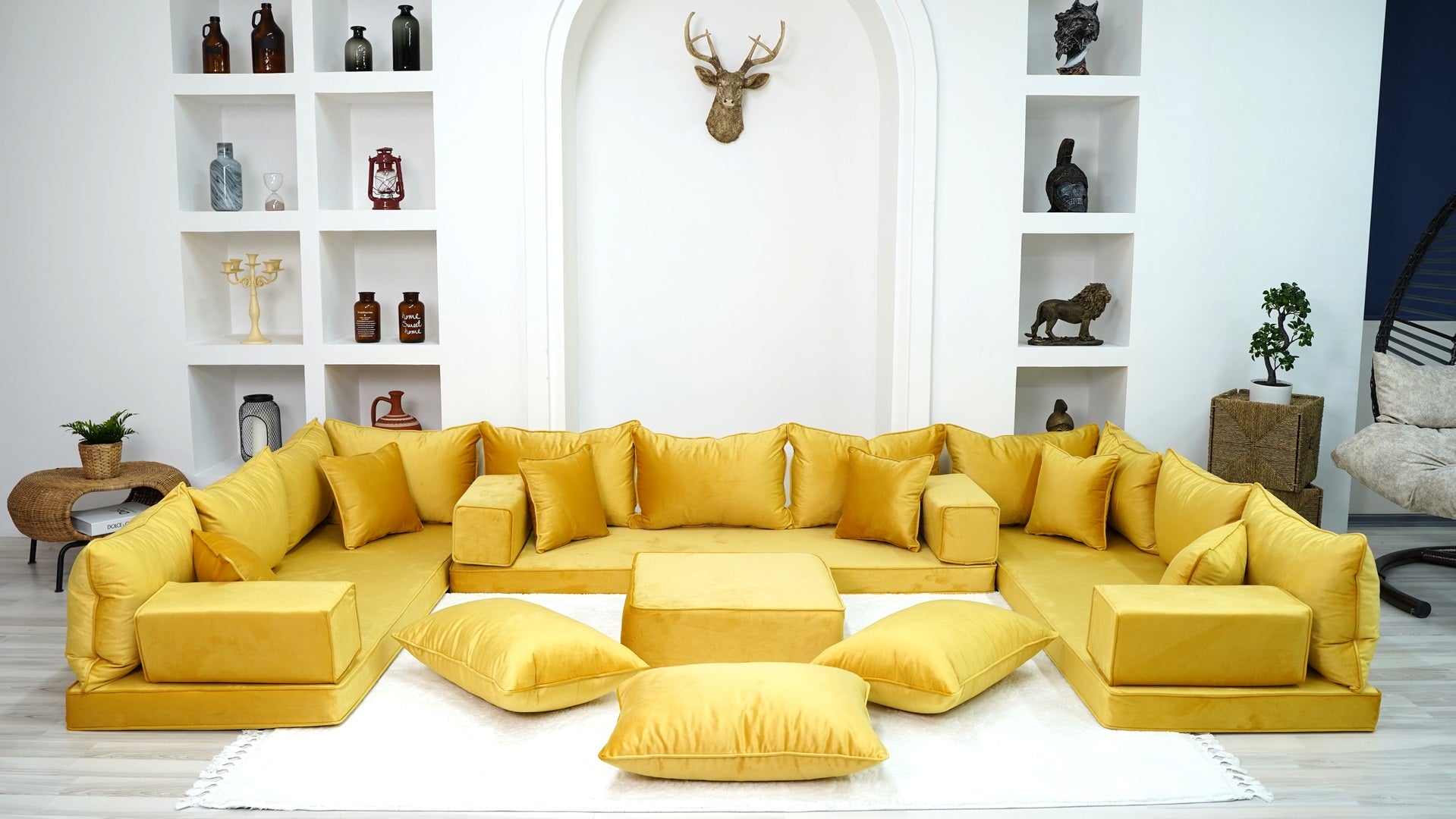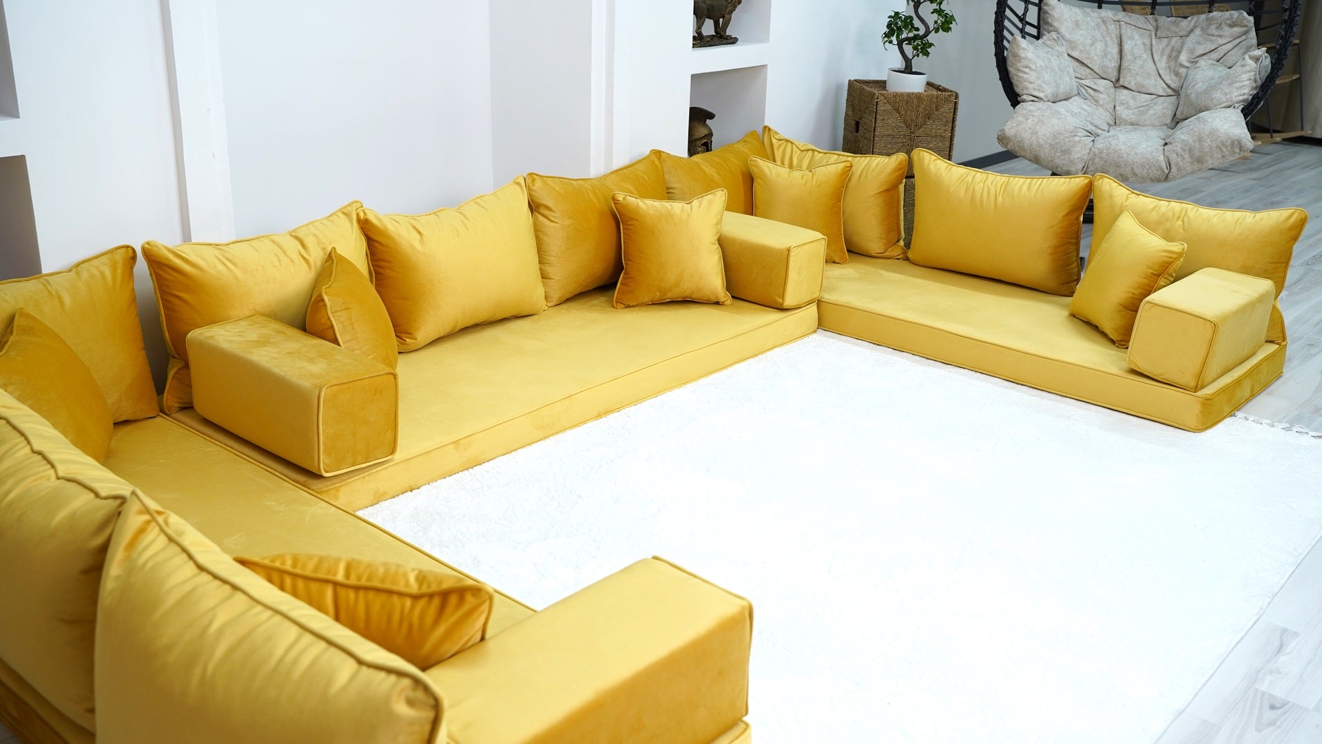 • Yellow Color Velvet U Shaped Floor Seating, Arabic Floor Sofa, Velvet Floor Couch, Sectional Sofa, Moroccan Livingroom - Arabic Sofa